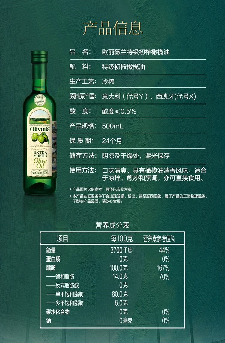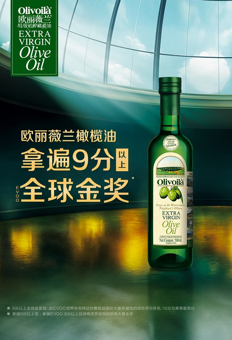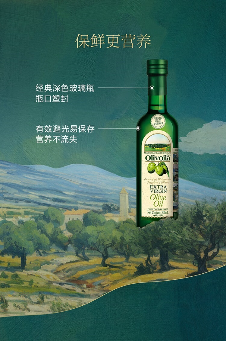 欧丽薇兰 Olivoila【保真橄榄油】食用油 特级初榨 压榨 橄榄油500ml