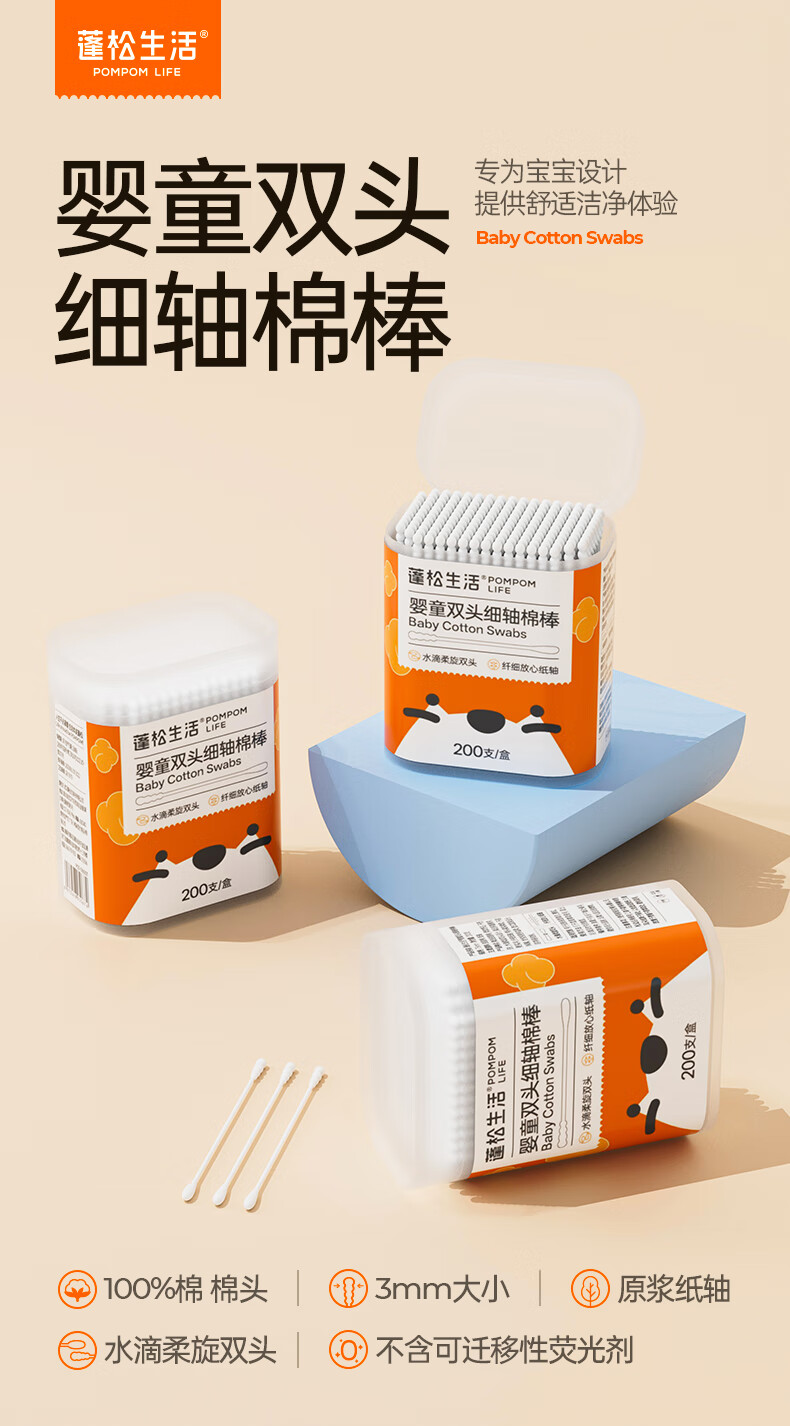 蓬松生活婴儿棉签宝宝掏耳朵鼻屎肚脐挖耳勺螺旋头新生儿童细轴双头棉棒 宝宝棉签3盒(600支)