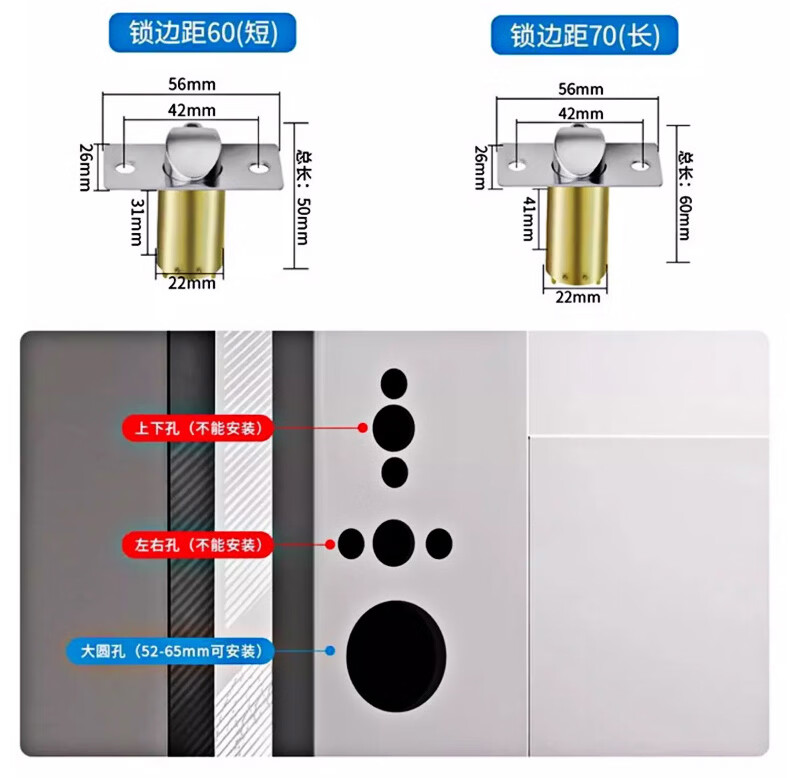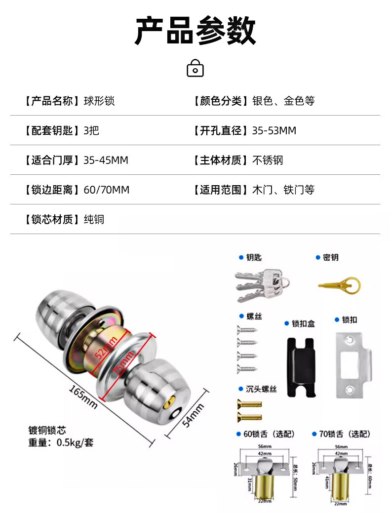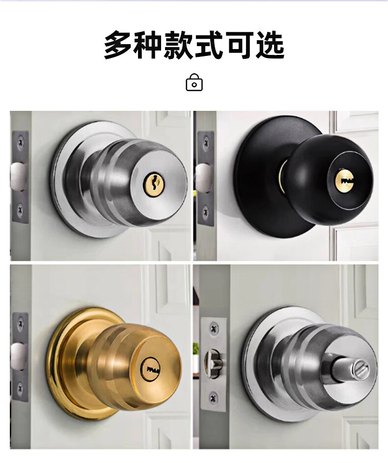 云航球形锁室内门锁卧室门球锁老式木门不锈钢球形锁卫生间球形门锁 YH-5831钢拉丝70锁舌