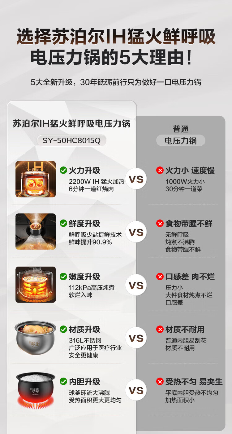 苏泊尔(SUPOR)IH鲜呼吸猛火电压力锅5L高压112kPa电饭煲高压锅4-6人家用316L球釜SY-50HC8015Q