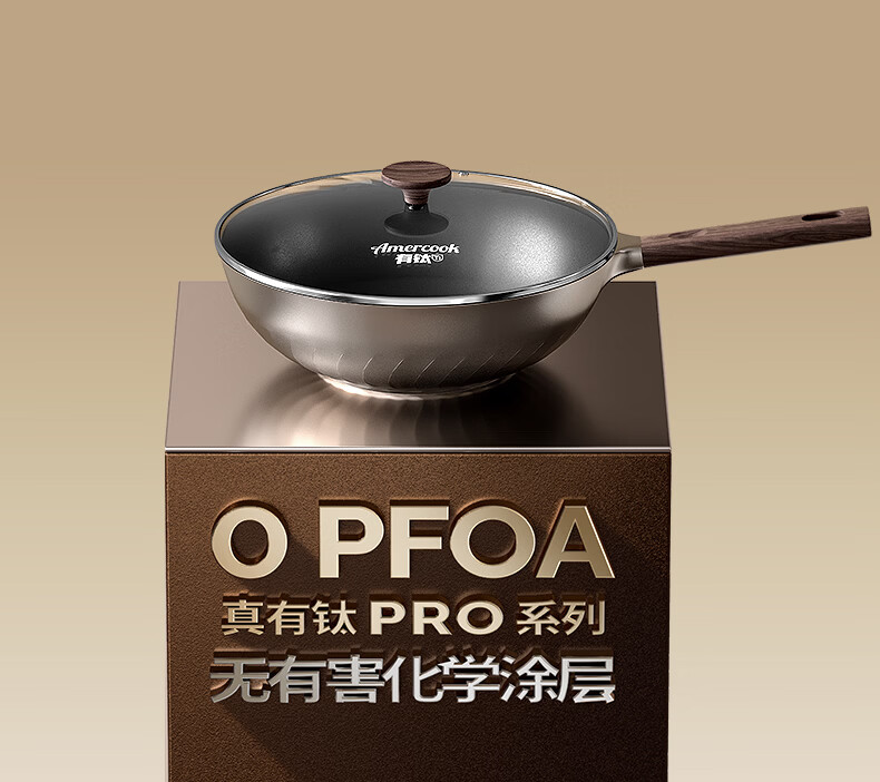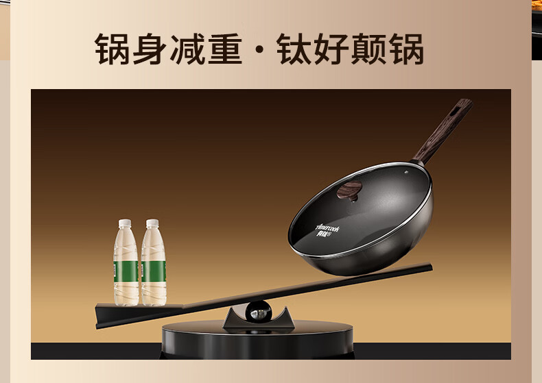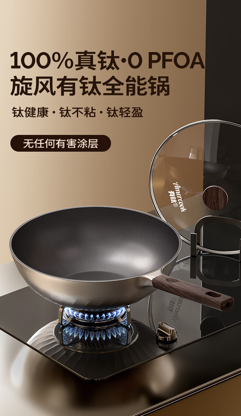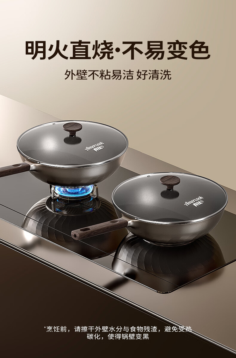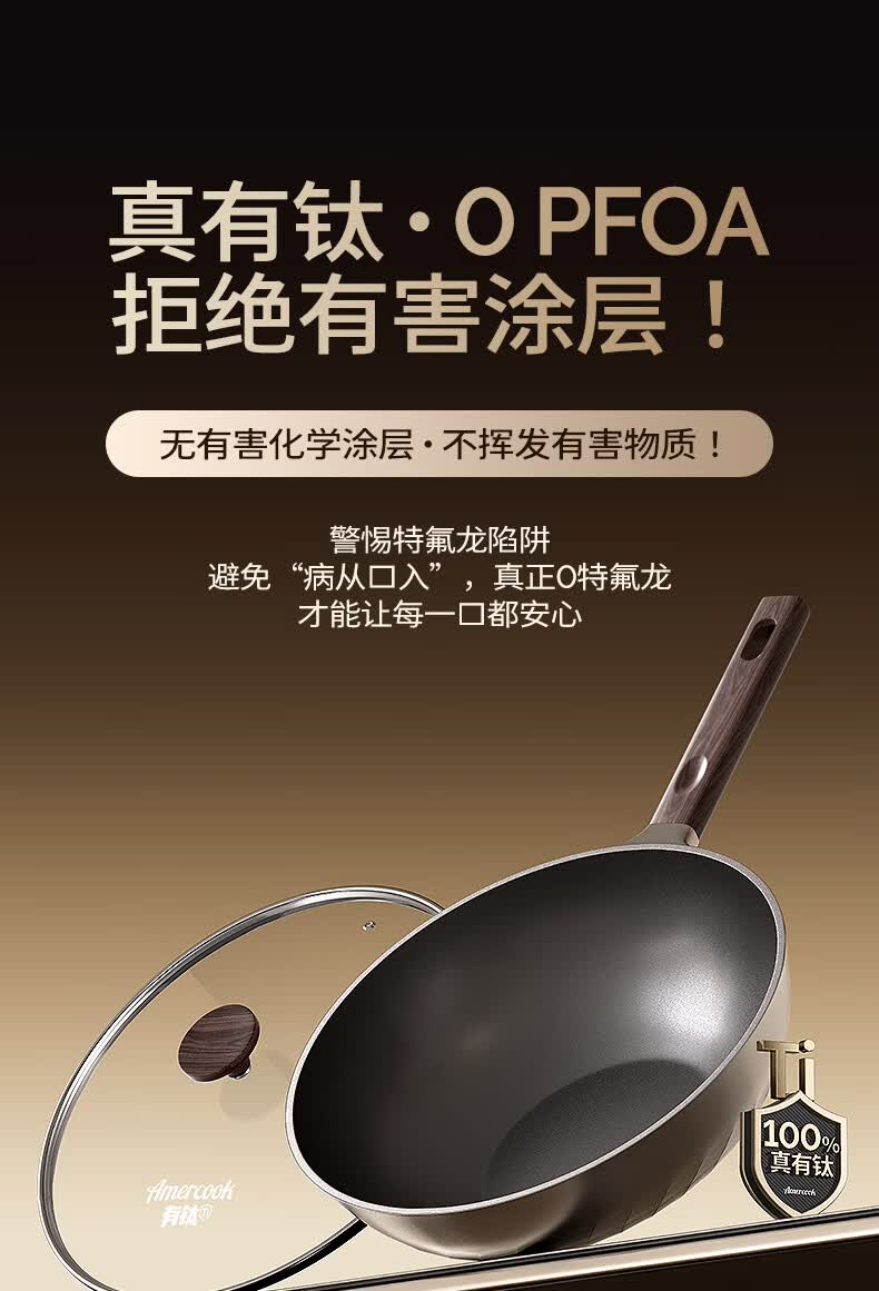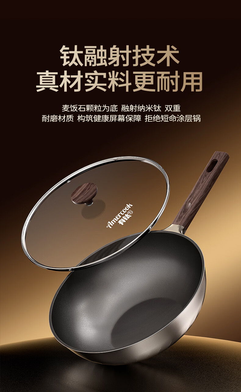 Amercook钛炒锅不粘锅麦饭石炒菜锅平底炒锅家用炒勺电磁炉燃气灶专用