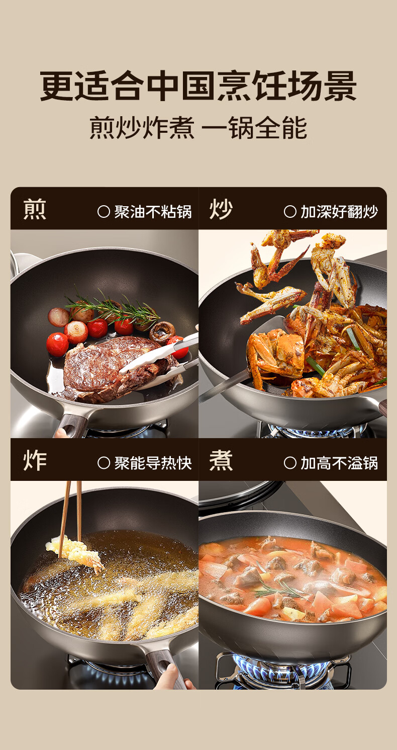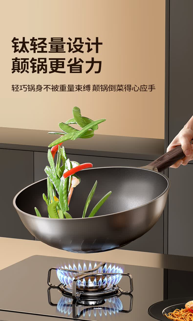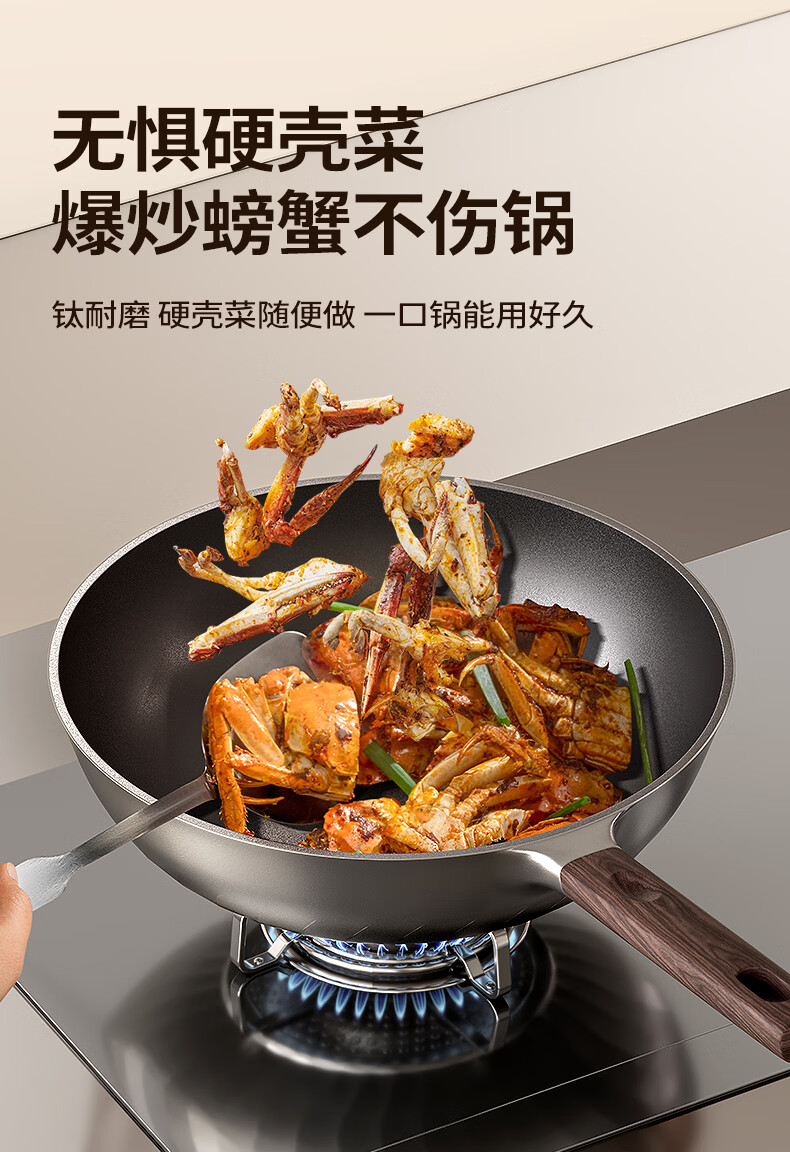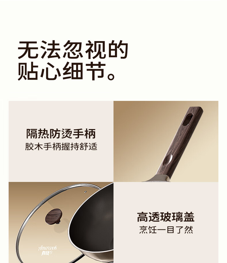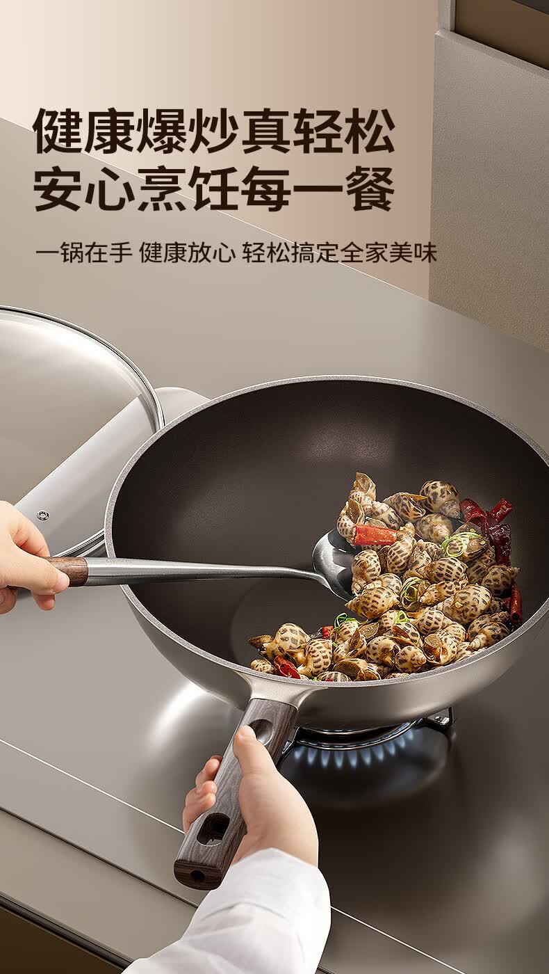 Amercook钛炒锅不粘锅麦饭石炒菜锅平底炒锅家用炒勺电磁炉燃气灶专用