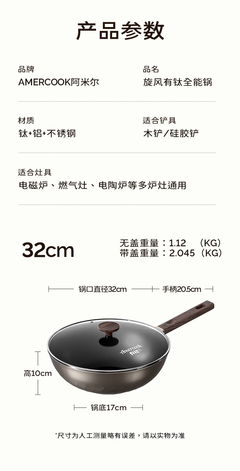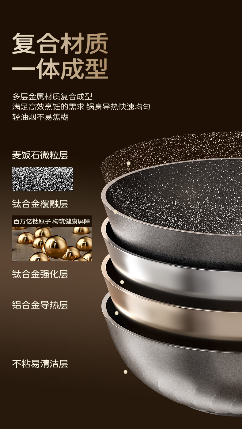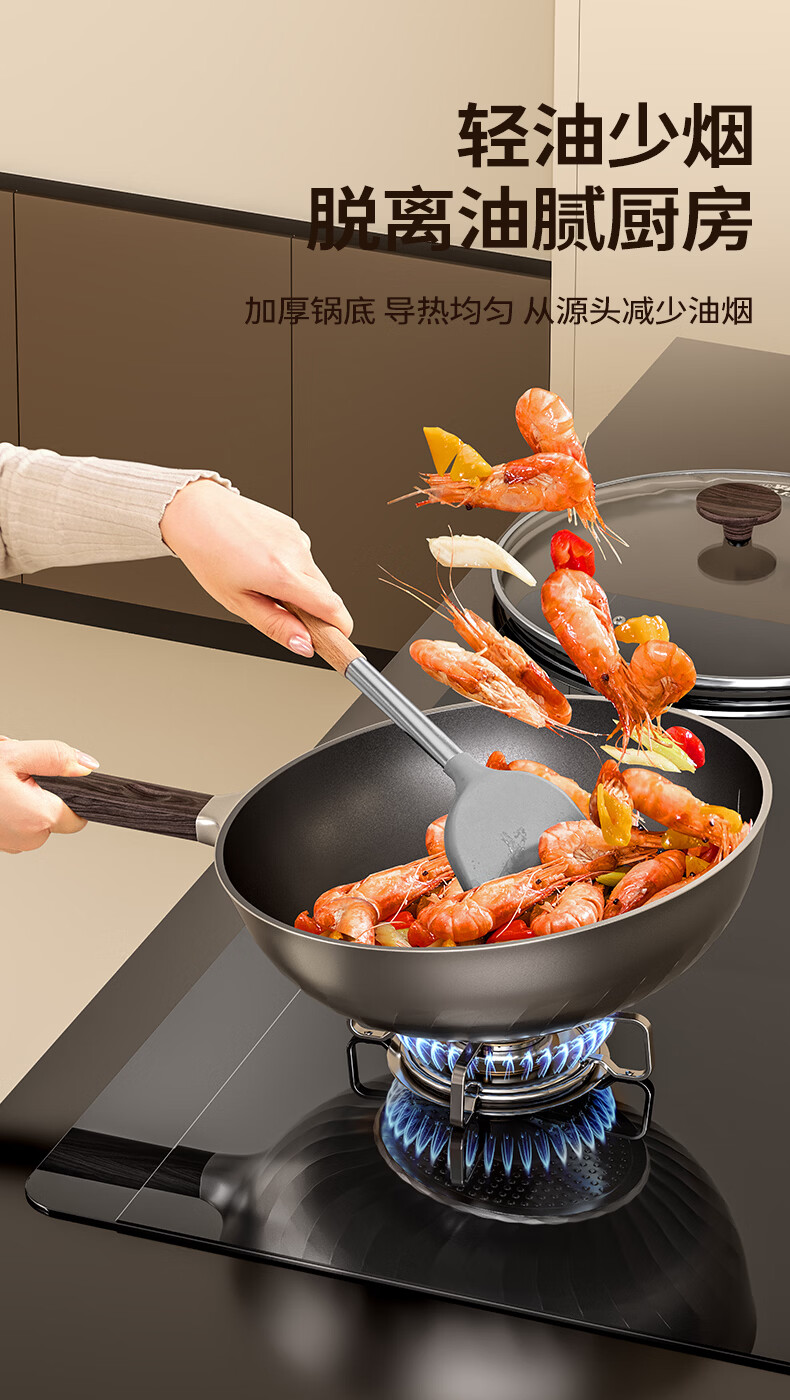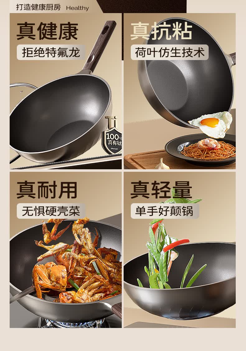 Amercook钛炒锅不粘锅麦饭石炒菜锅平底炒锅家用炒勺电磁炉燃气灶专用