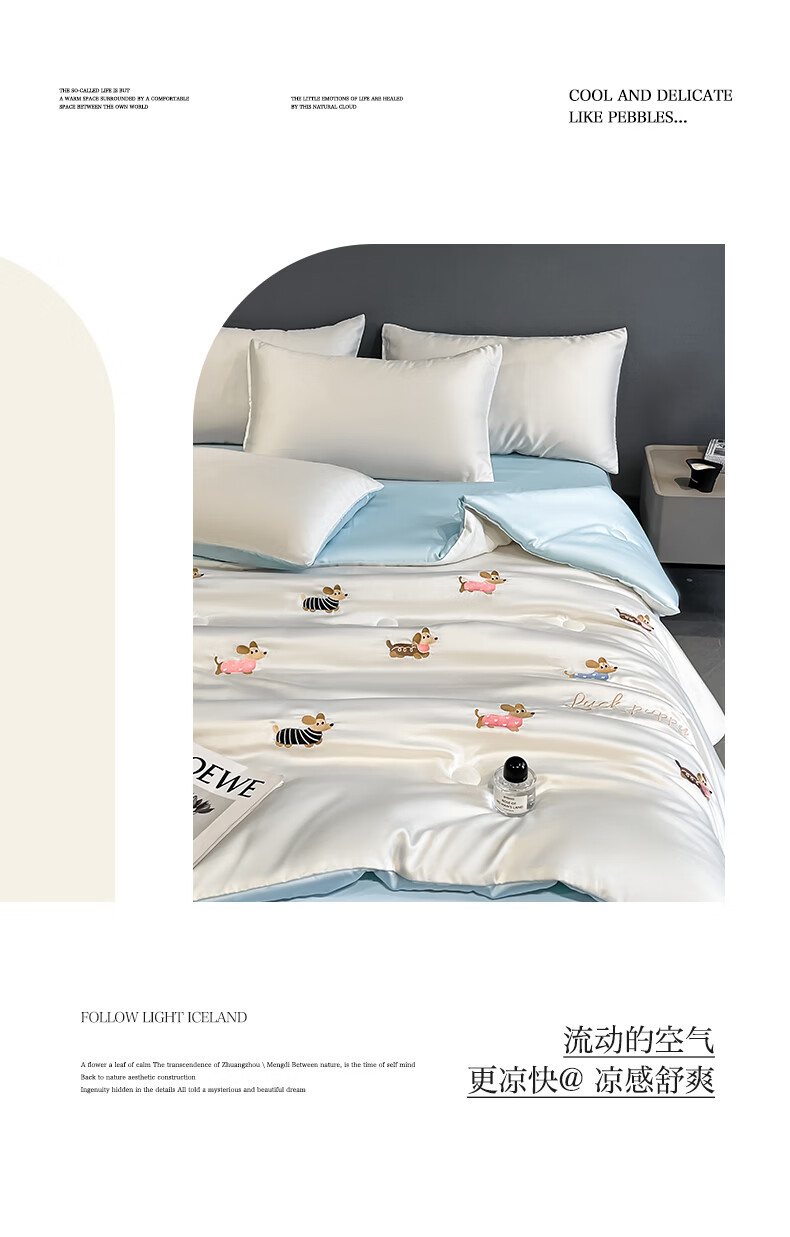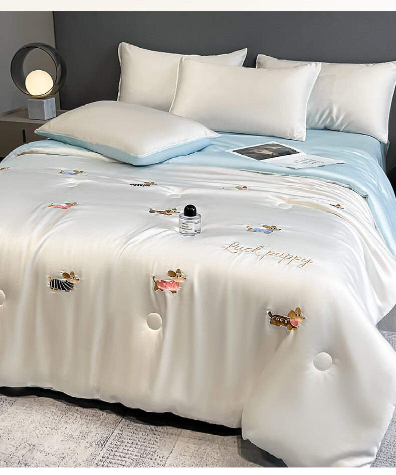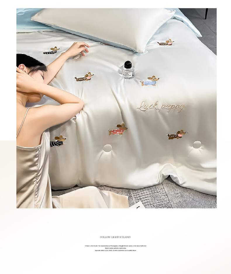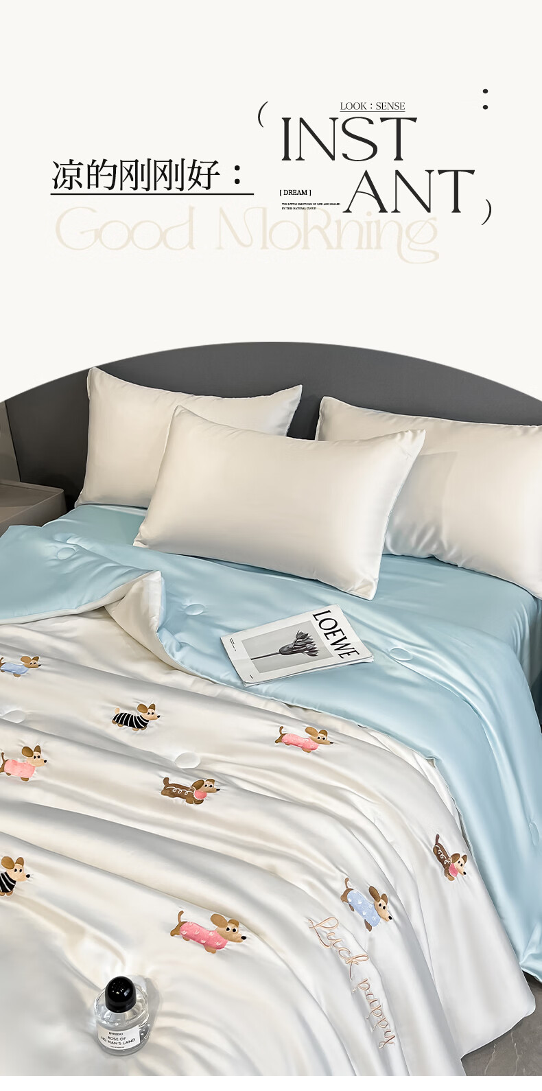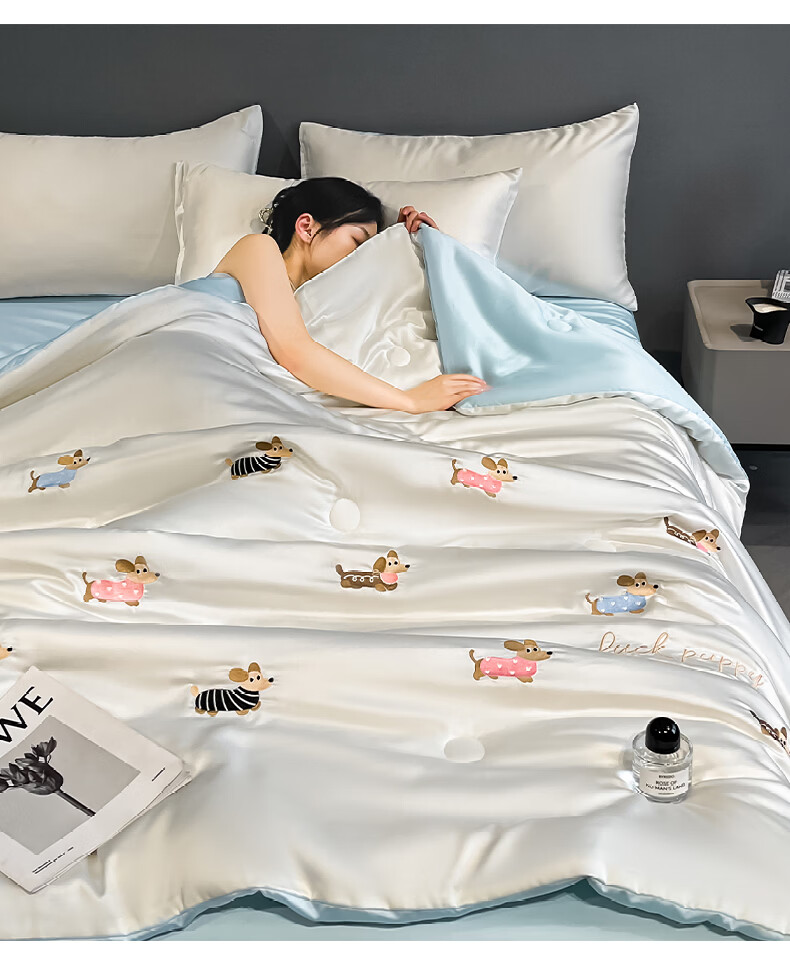VJE冰丝夏凉被空调被超凉感夏被四件套刺绣可水洗仿天丝学生宿舍被子 腊肠狗-奶白蓝【三倍凉感冰丝 裸睡丝滑】 四件套1.5*2.0米夏被+床单+枕套一对