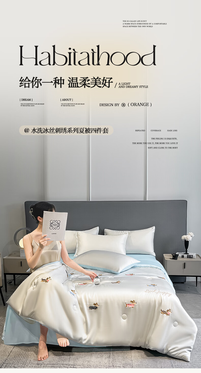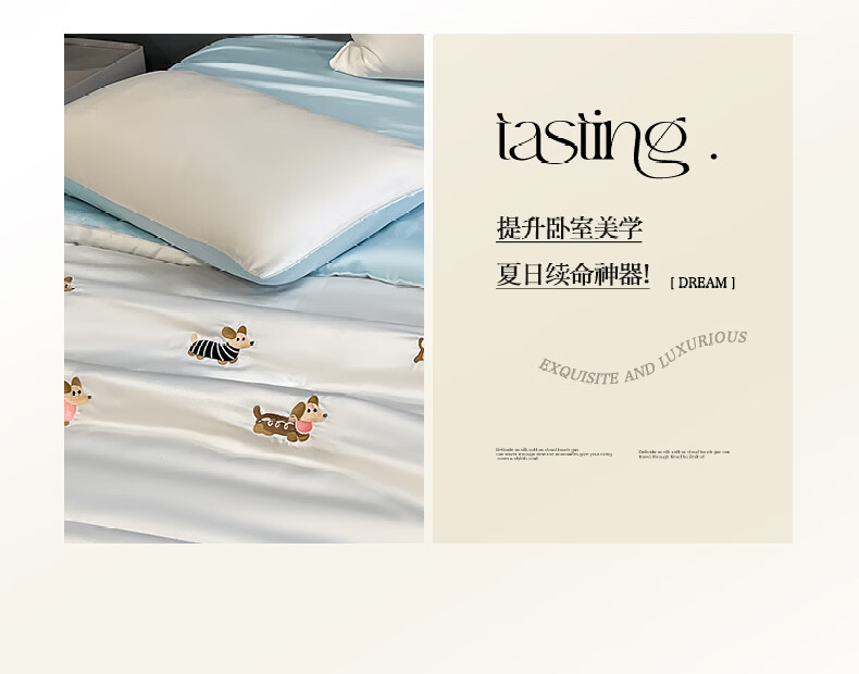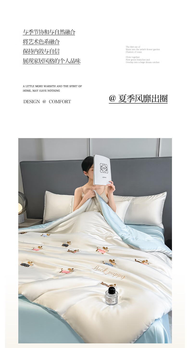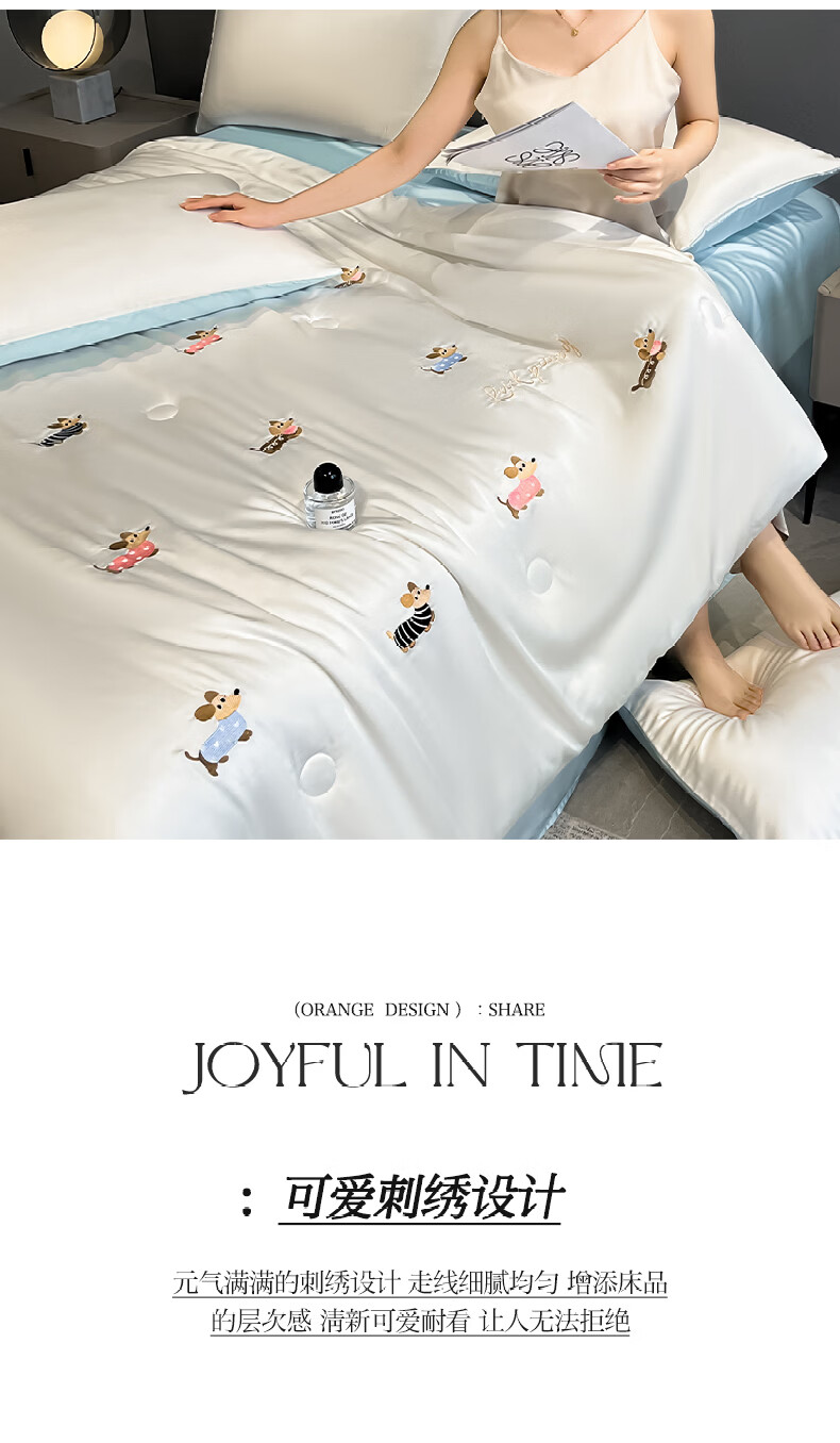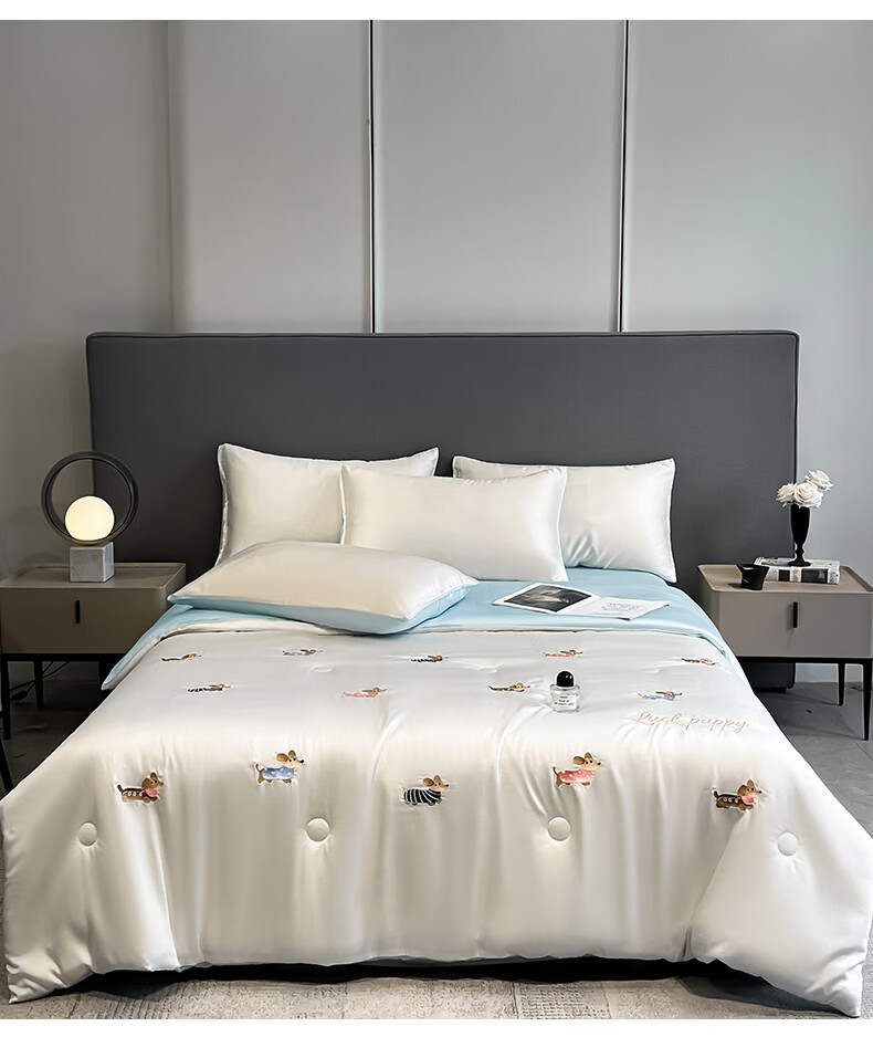 VJE冰丝夏凉被空调被超凉感夏被四件套刺绣可水洗仿天丝学生宿舍被子 腊肠狗-奶白蓝【三倍凉感冰丝 裸睡丝滑】 四件套1.5*2.0米夏被+床单+枕套一对