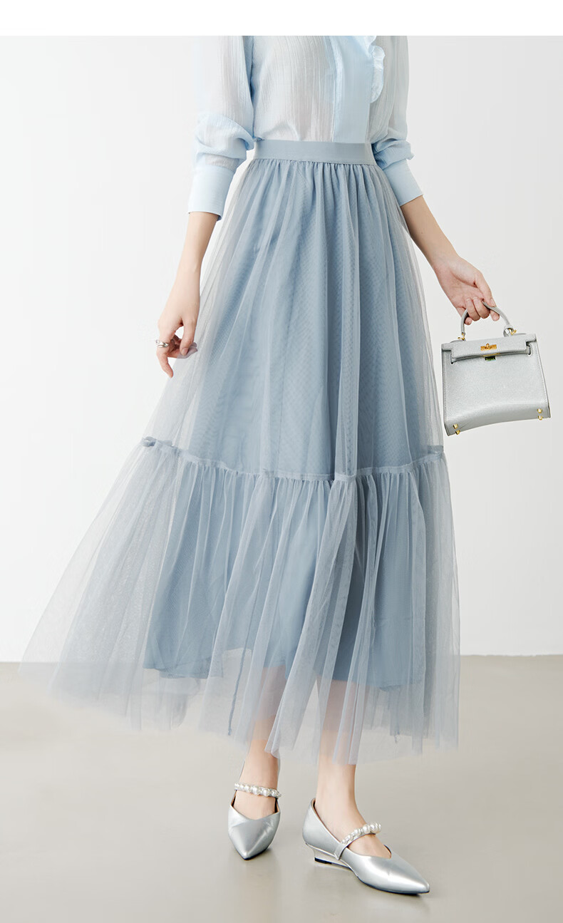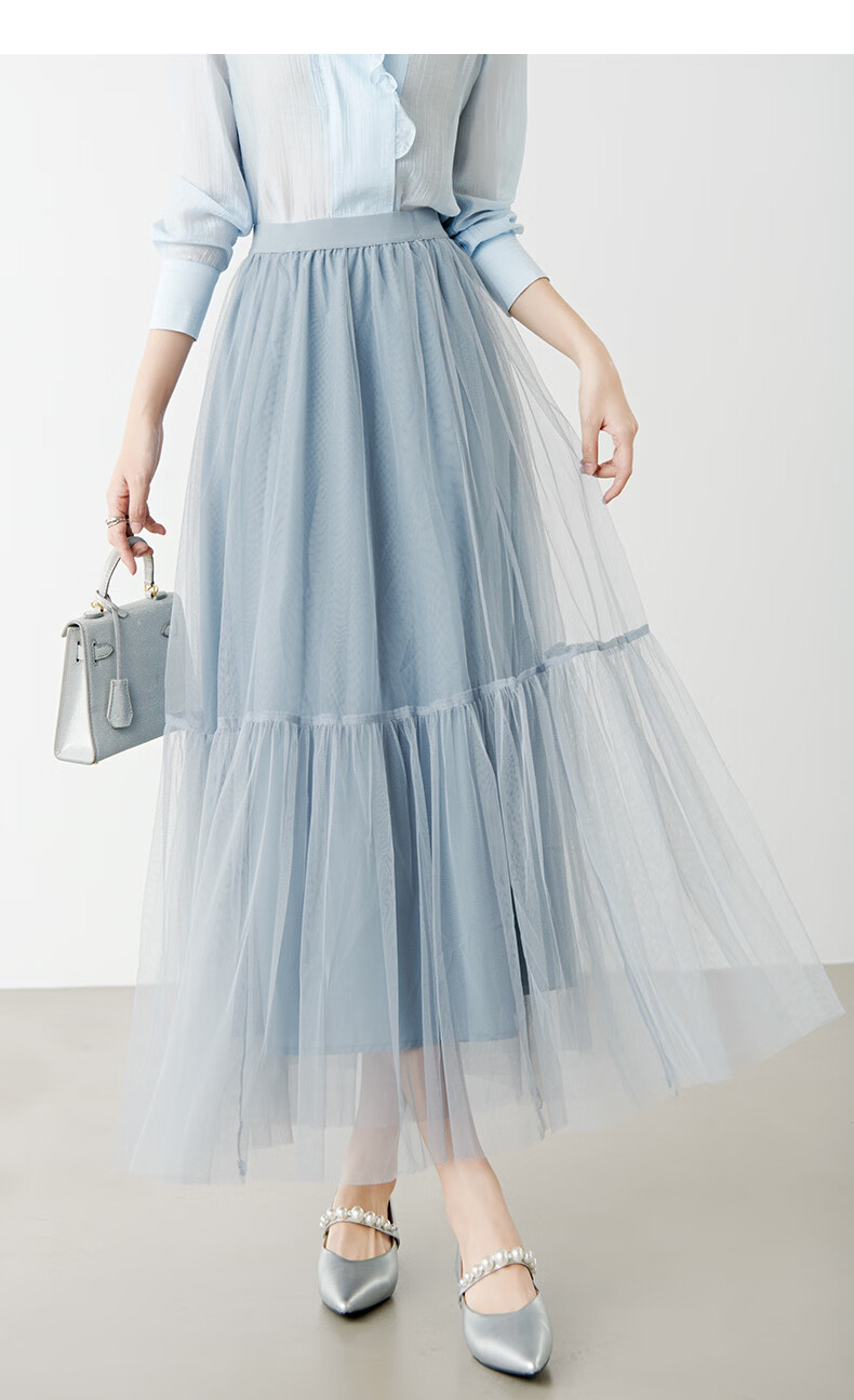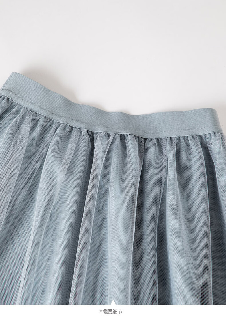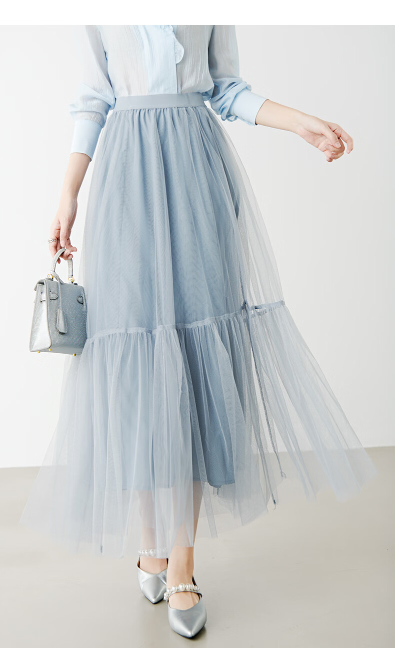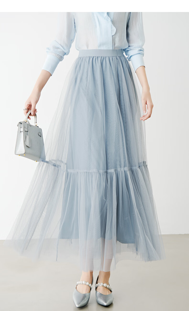 晚白【新品】2026春款时尚纯色半裙气质甜美淑女拼接网纱半身裙 灰蓝色 S
