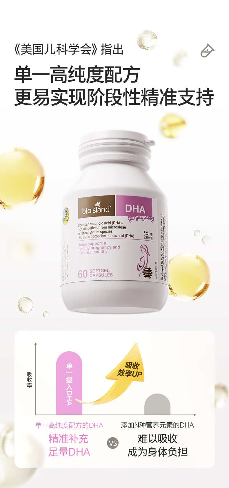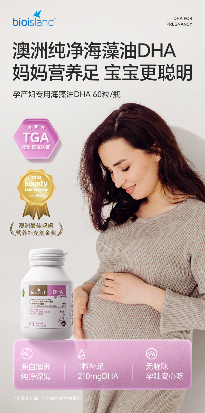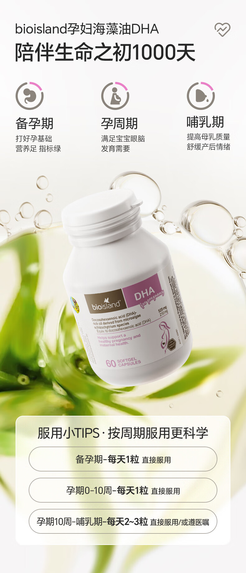 Bio Island佰澳朗德 孕妇DHA海藻油备孕期哺乳期软胶囊 60粒*3瓶 澳洲进口