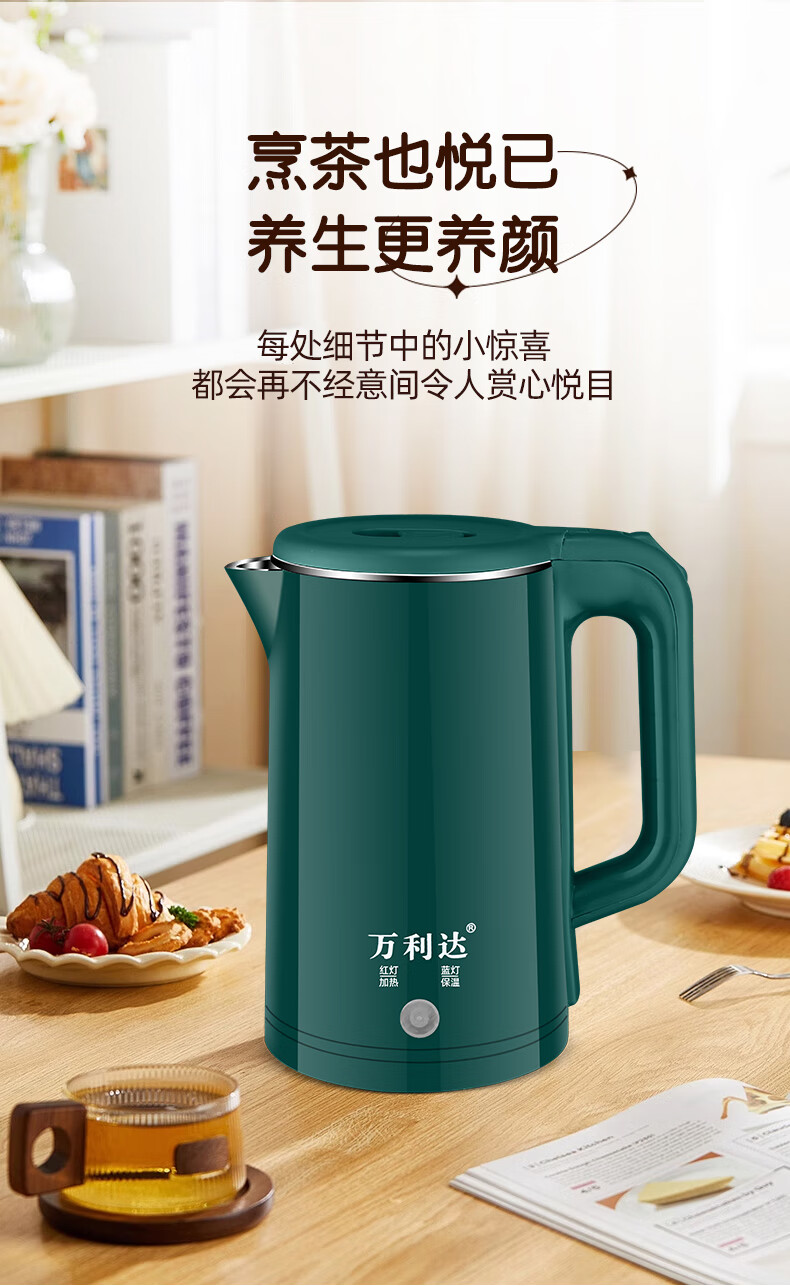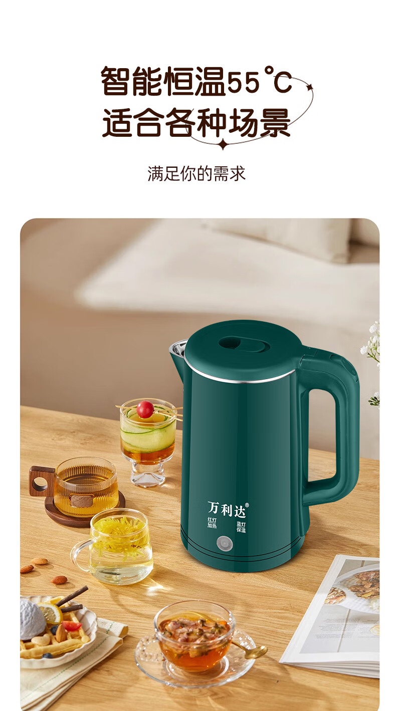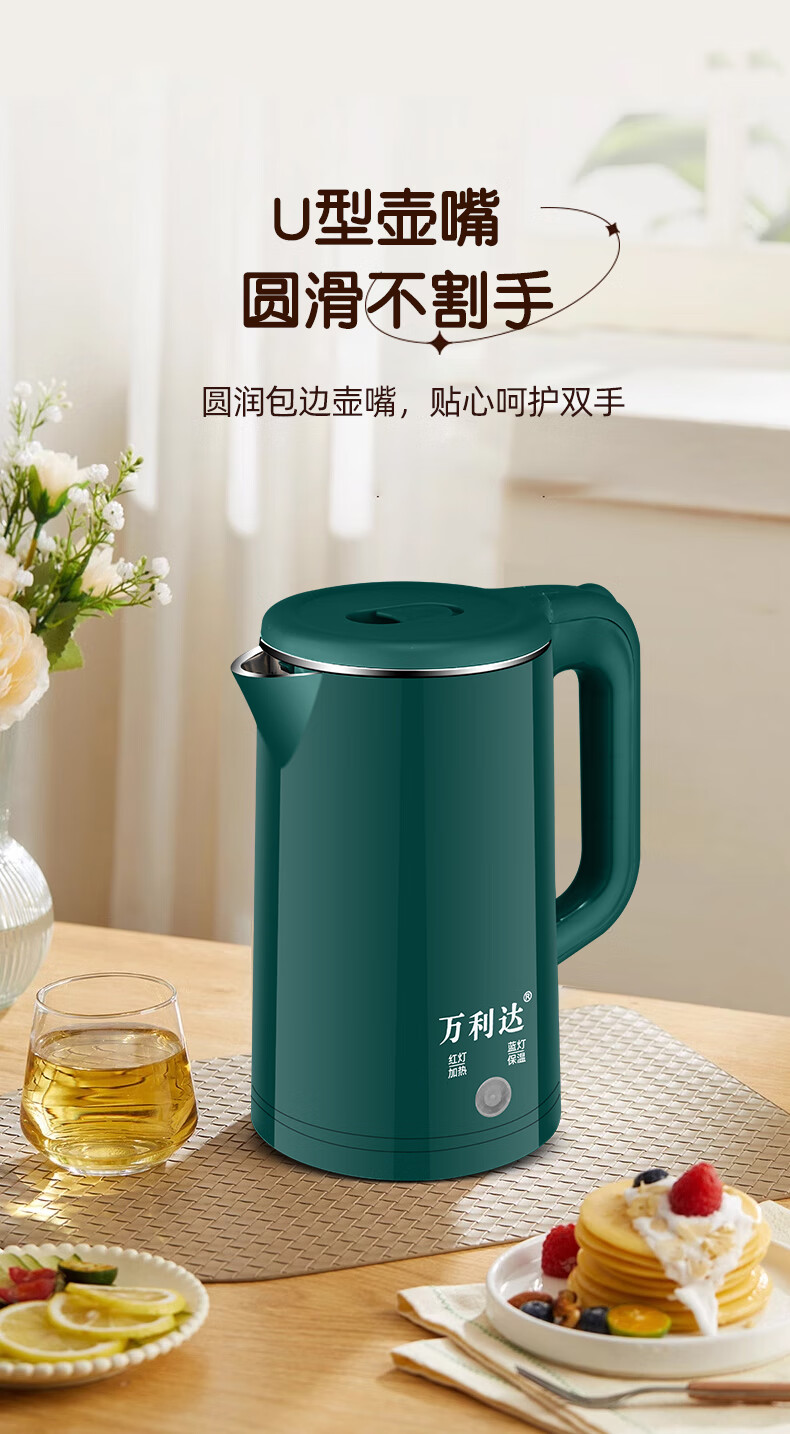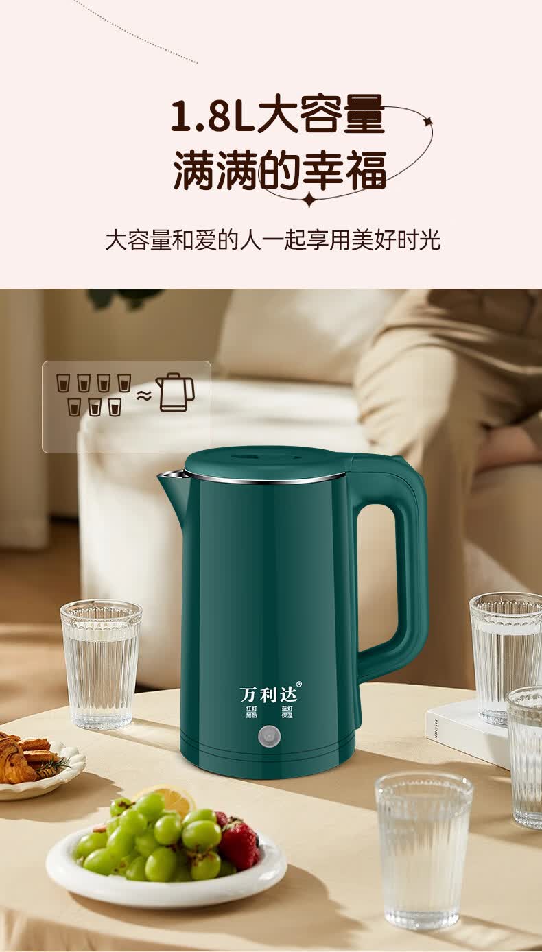 万利达【严选百货】烧水壶电热水壶小型家用2L大容量双层防烫烧水壶智能保温水壶 1.8L 绿色保温