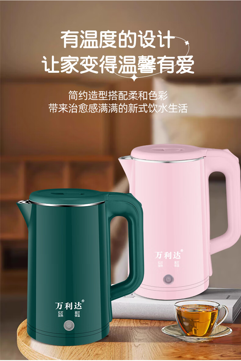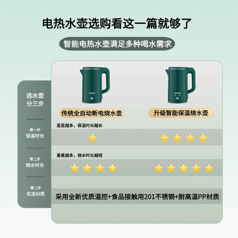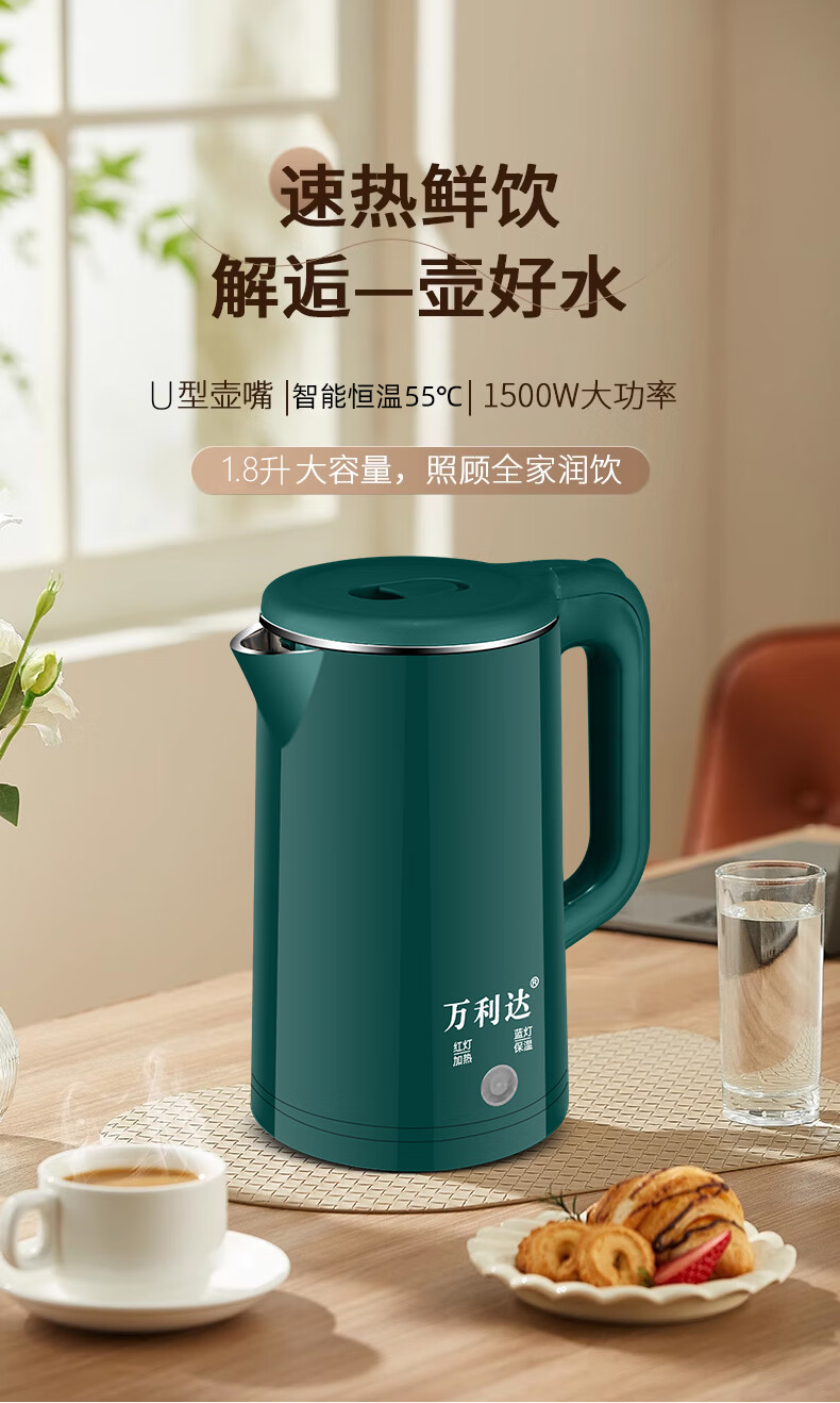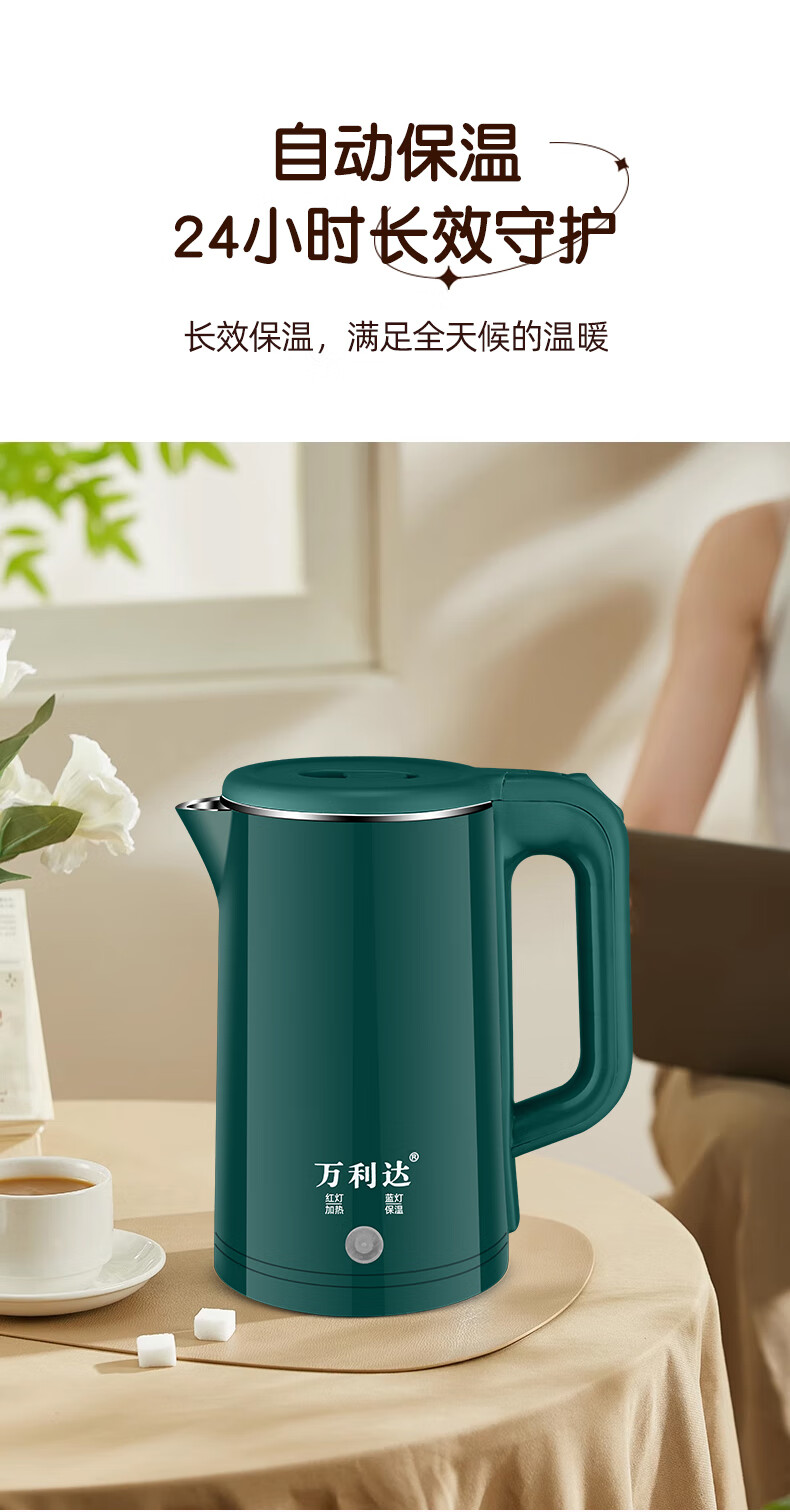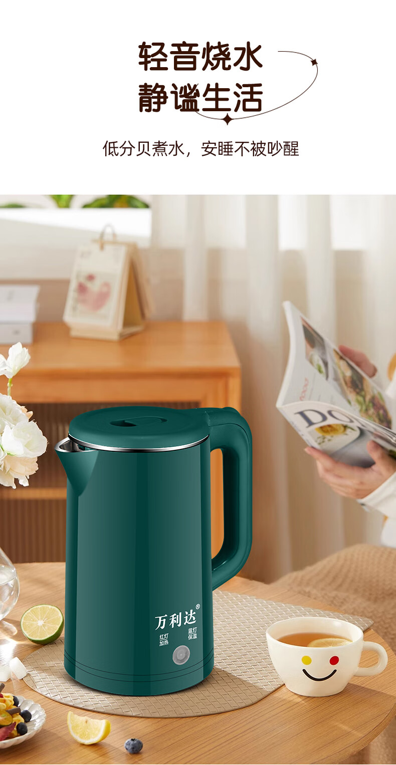 万利达【严选百货】烧水壶电热水壶小型家用2L大容量双层防烫烧水壶智能保温水壶 1.8L 绿色保温
