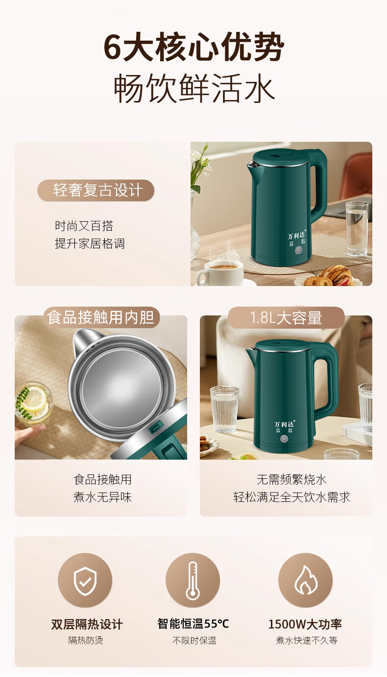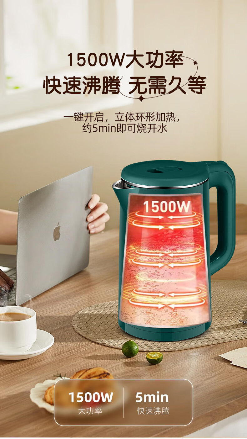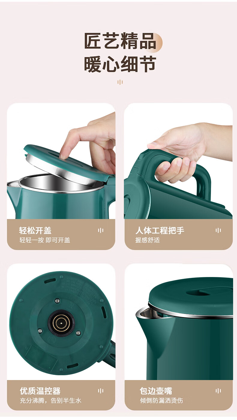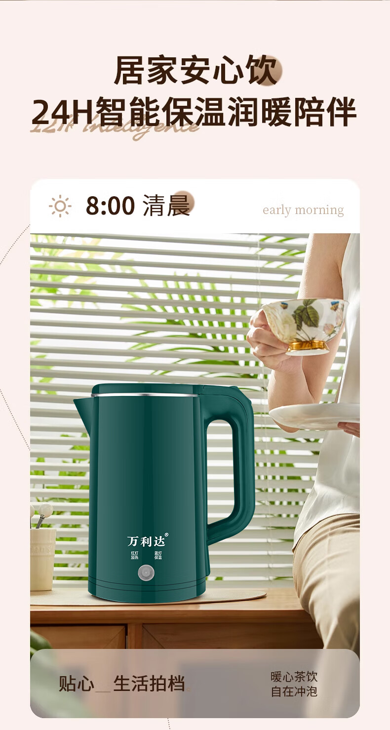 万利达【严选百货】烧水壶电热水壶小型家用2L大容量双层防烫烧水壶智能保温水壶 1.8L 绿色保温
