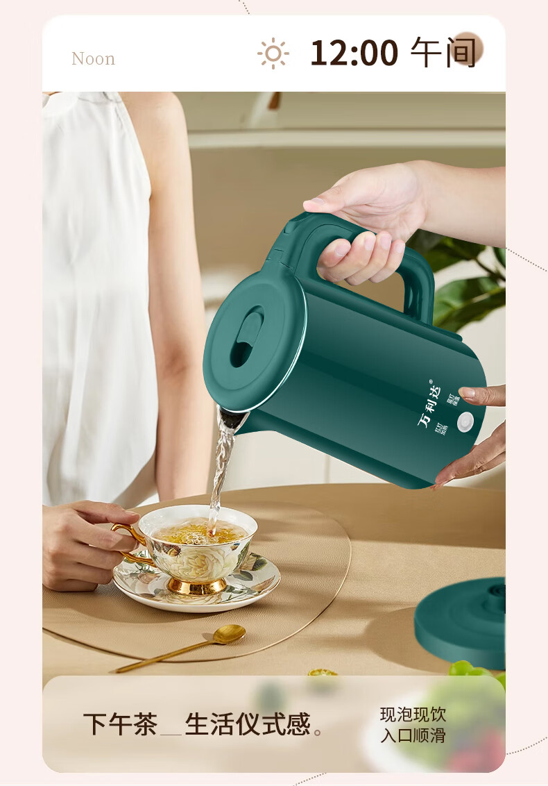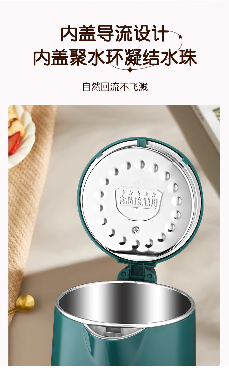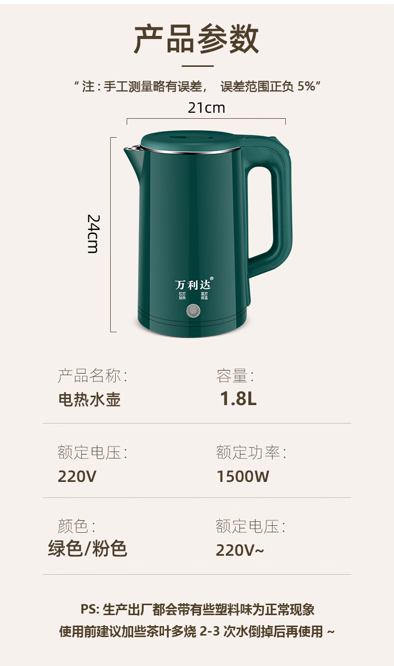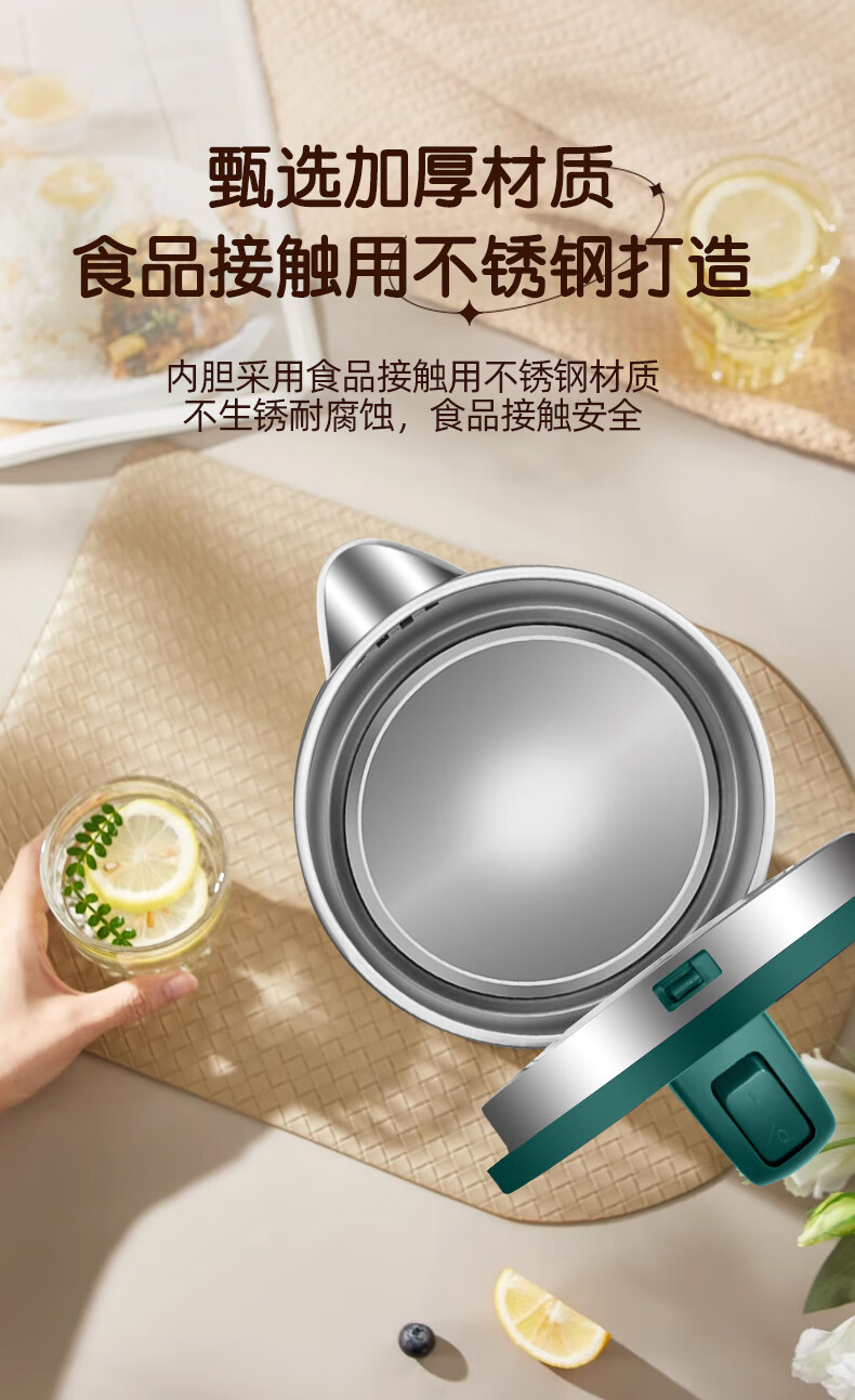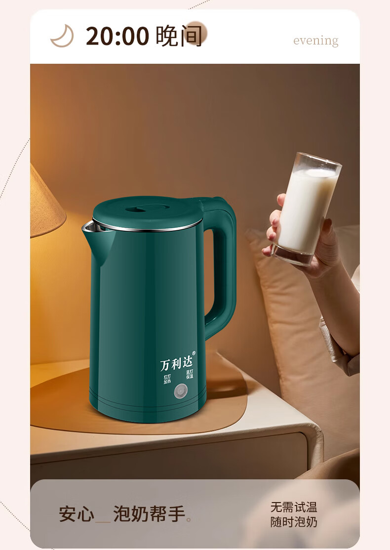 万利达【严选百货】烧水壶电热水壶小型家用2L大容量双层防烫烧水壶智能保温水壶 1.8L 绿色保温