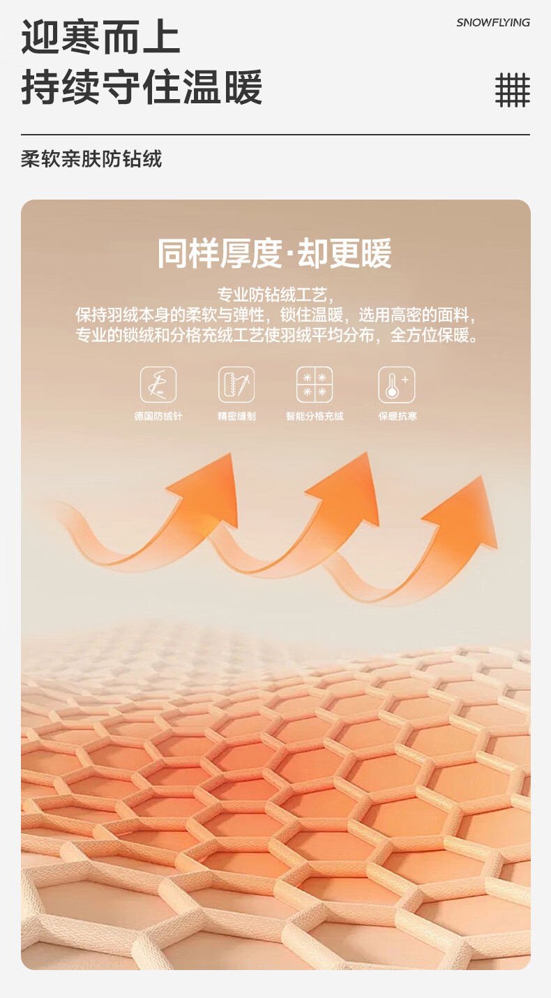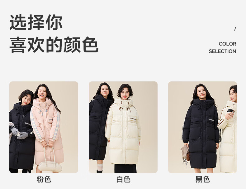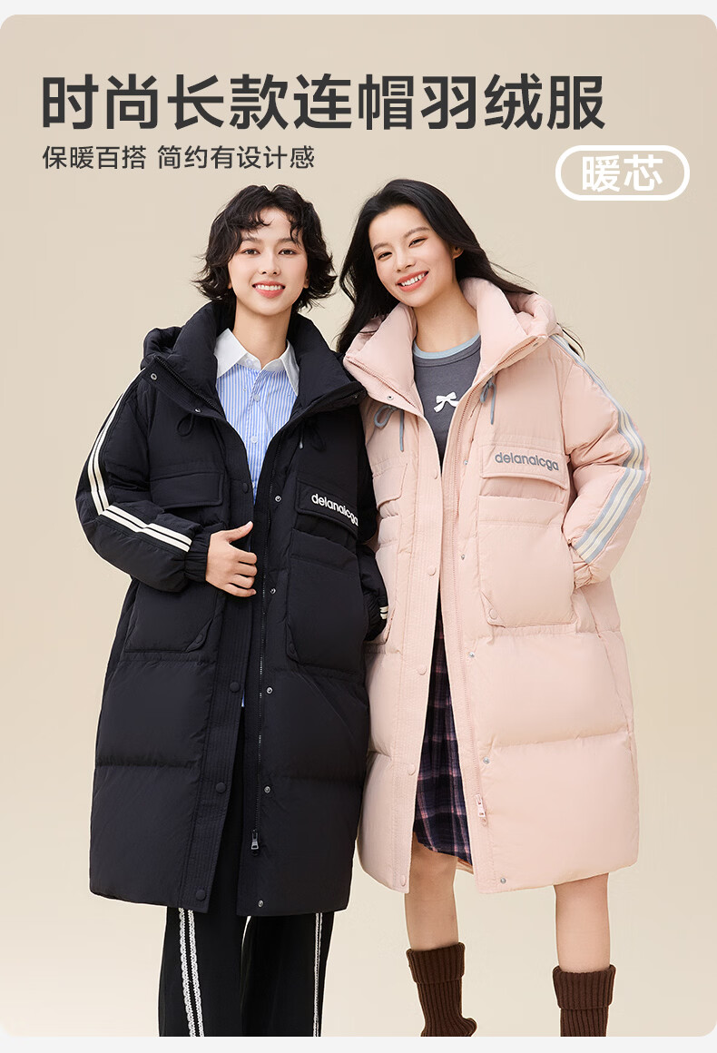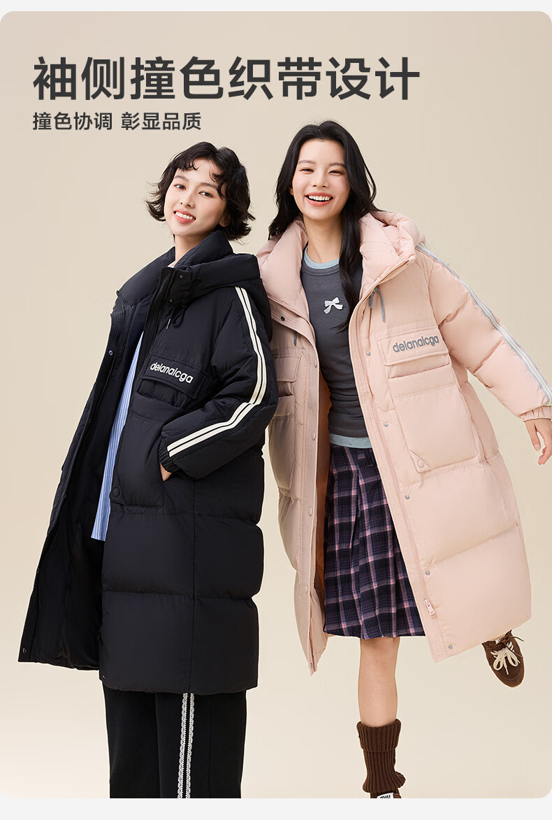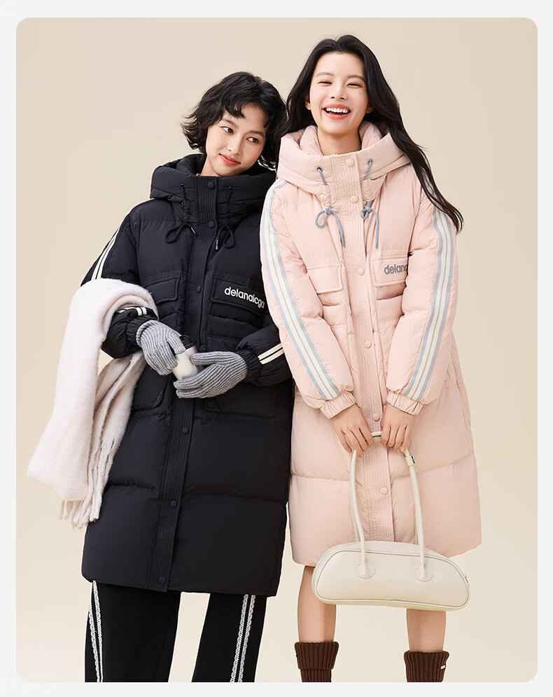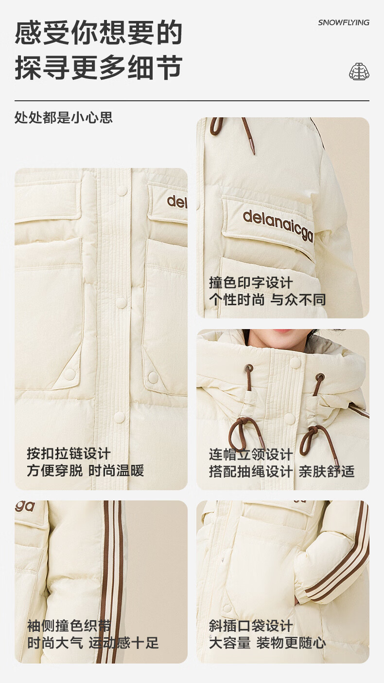 雪中飞运动休闲中长款羽绒服女2026年新款撞色条纹加厚冬季保暖百搭外套 浅粉红 S (155) (80-120斤)
