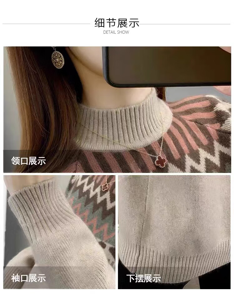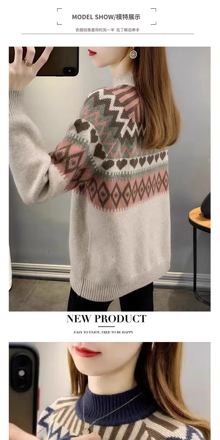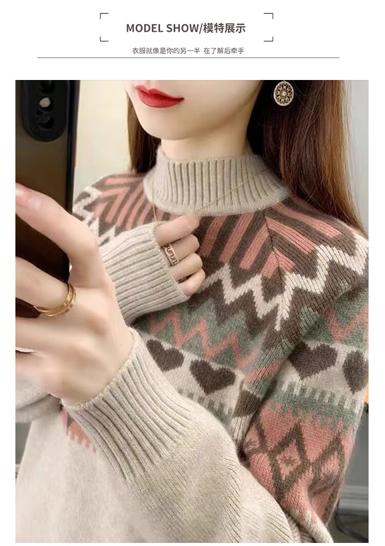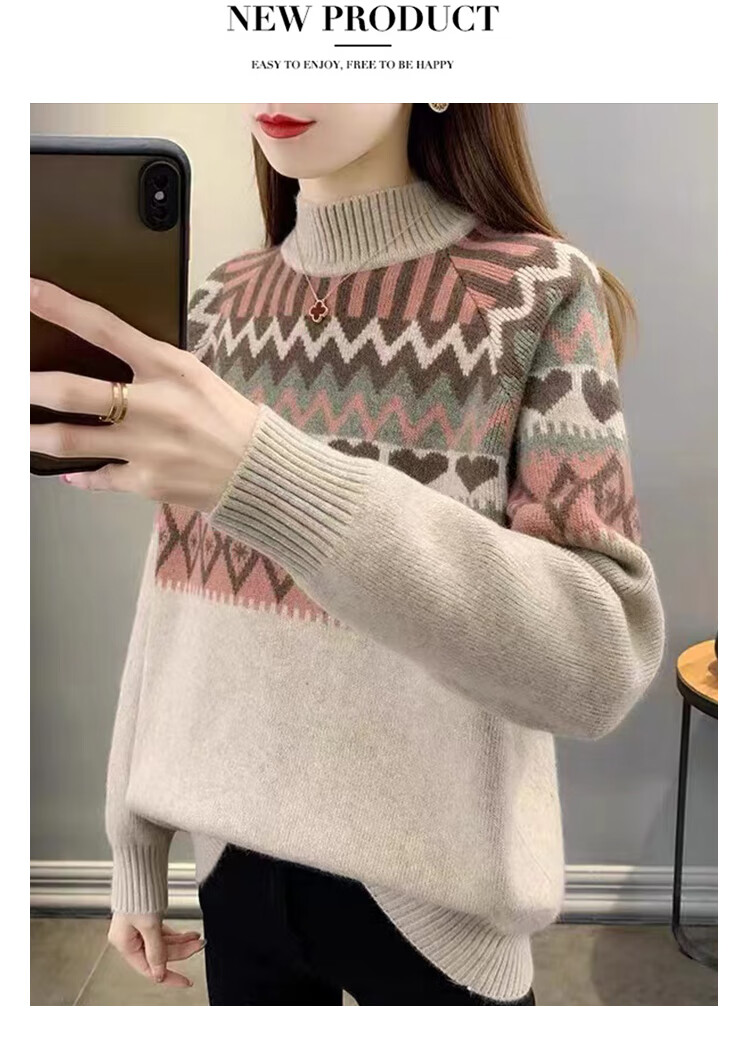 香影芬2025新款半高领复古毛衣女秋冬洋气条纹针织打底上衣宽松洋气女装 卡其色 S (建议95-105斤)