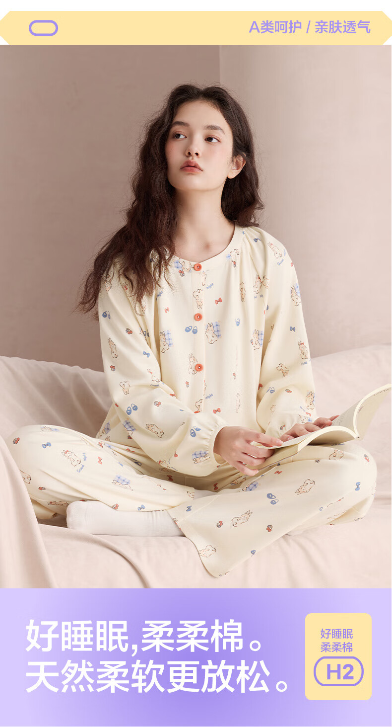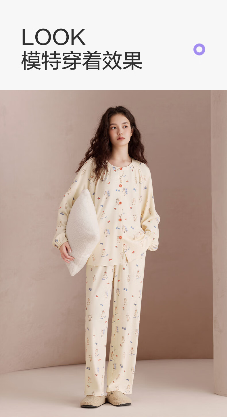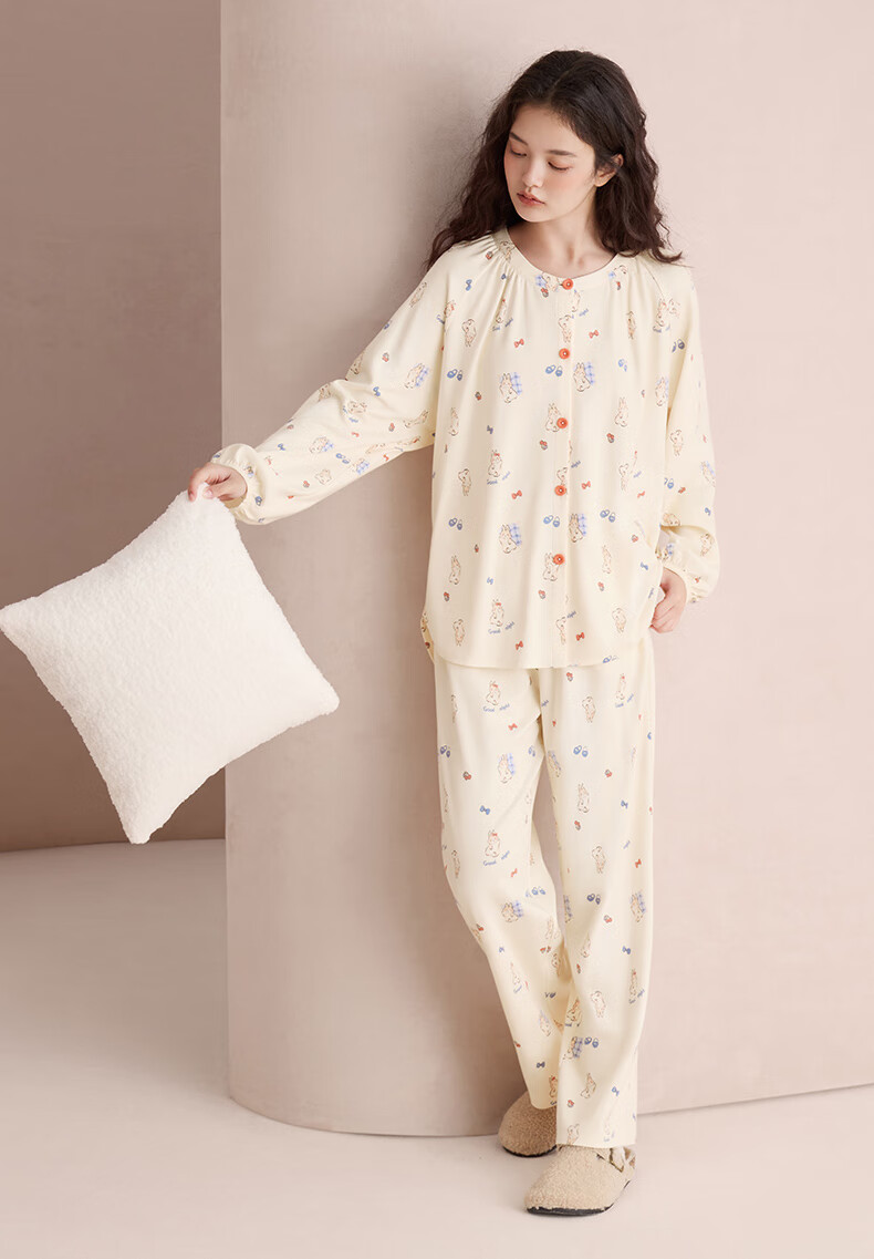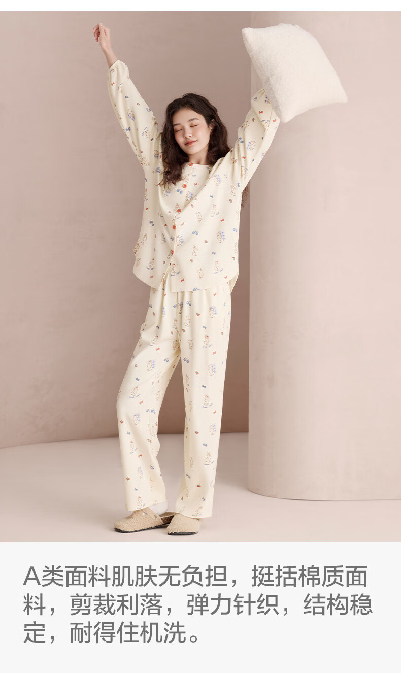 红豆(Hodo)【柔柔棉】纯棉睡衣女长袖可爱印花秋新款全棉透气外穿家居服套装 米色 L (165)