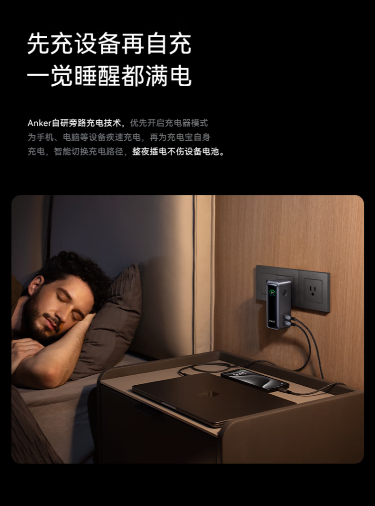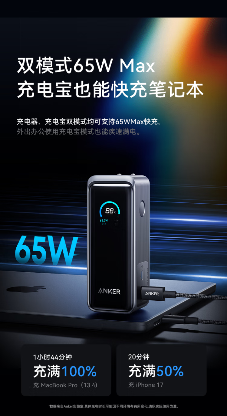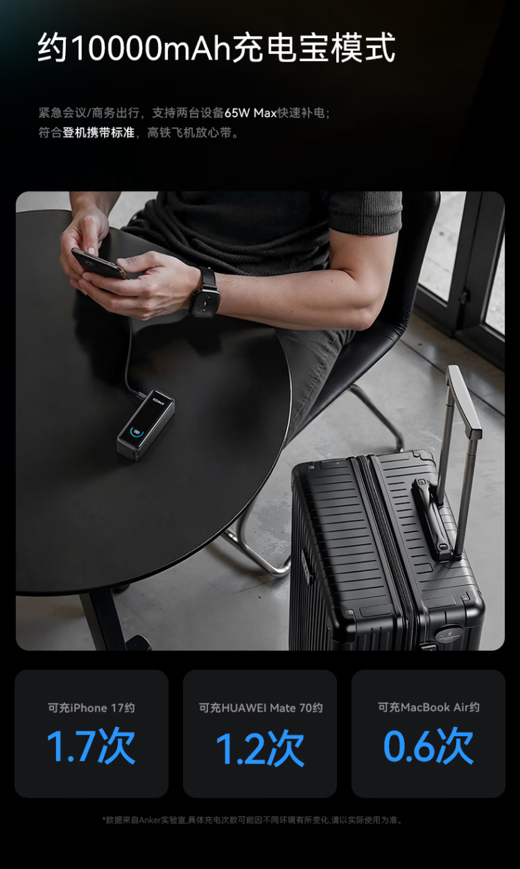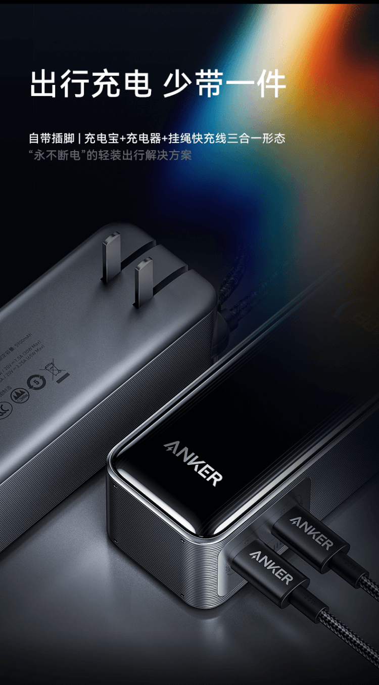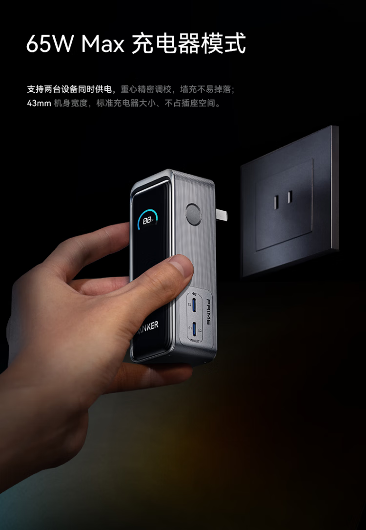 ANKERPrime【3C认证上飞机】安克充电宝自带插头器三二合一便携65W超快充笔记本移动电源户外储能电源