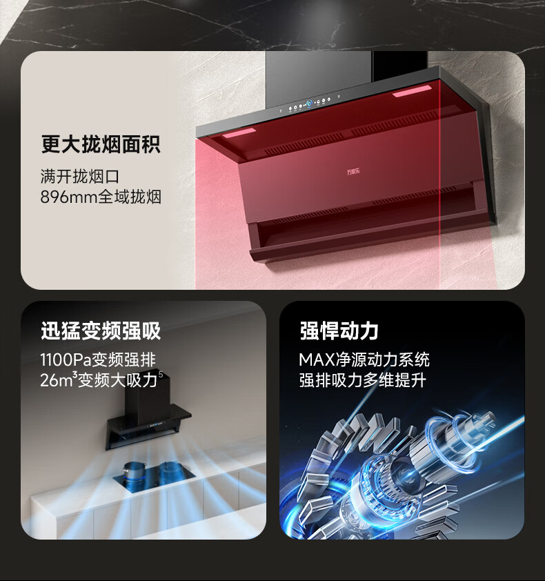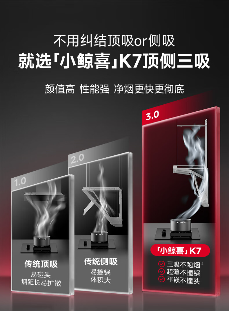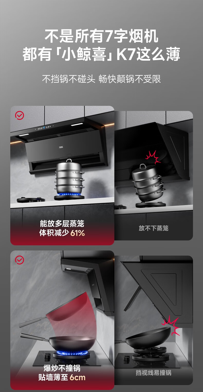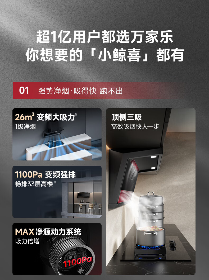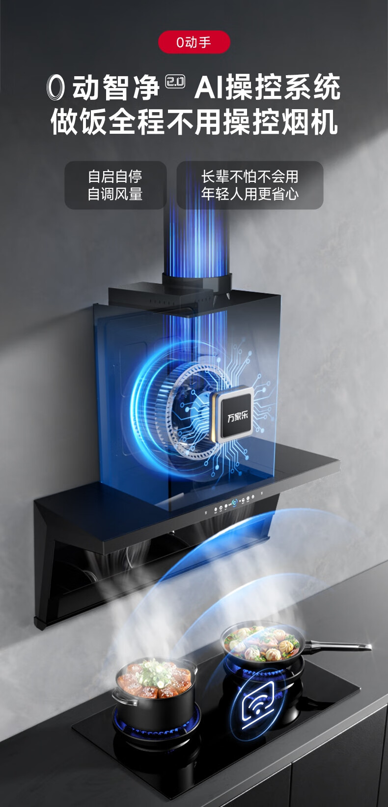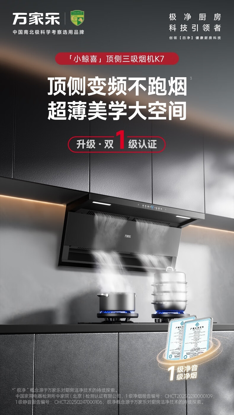 万家乐油烟机【小鲸喜K7·店长推荐】26m³顶侧双吸变频巡航烟灶联动挥手自清洗6cm超薄平嵌免拆洗油烟机