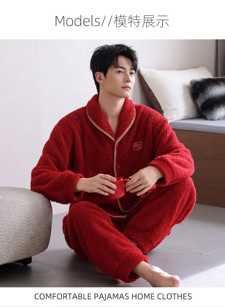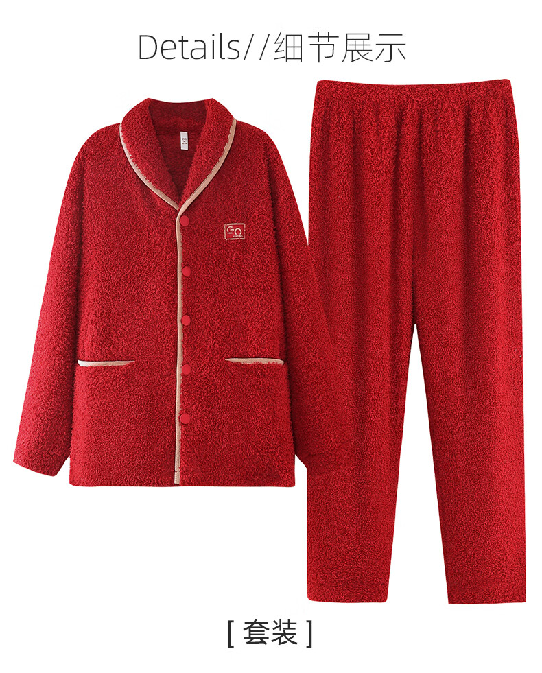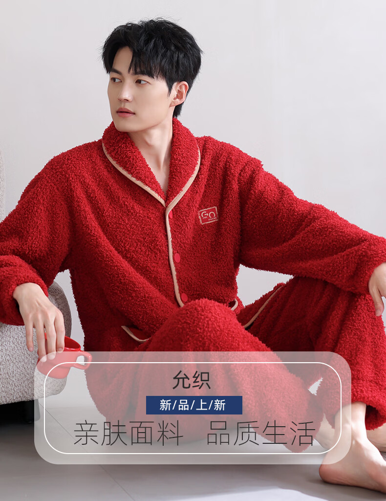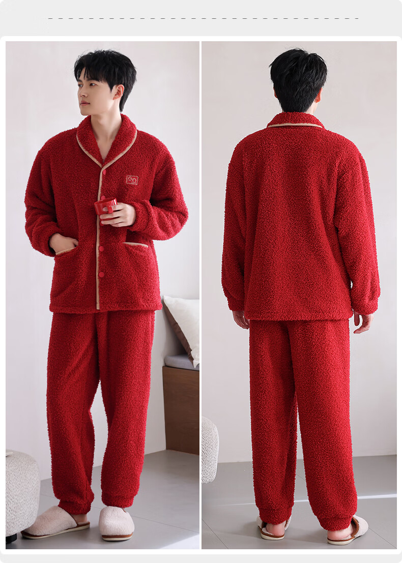 允织半边绒睡衣男士冬季加厚加绒秋冬款开衫高级感冬天家居服保暖套装 9060-枣红 M (165) :建议100-120斤穿着