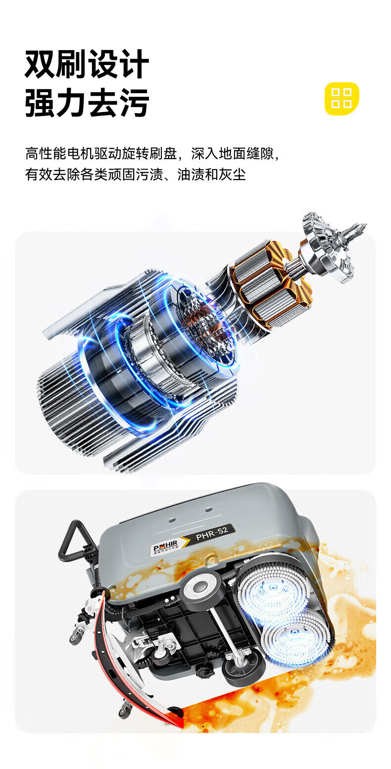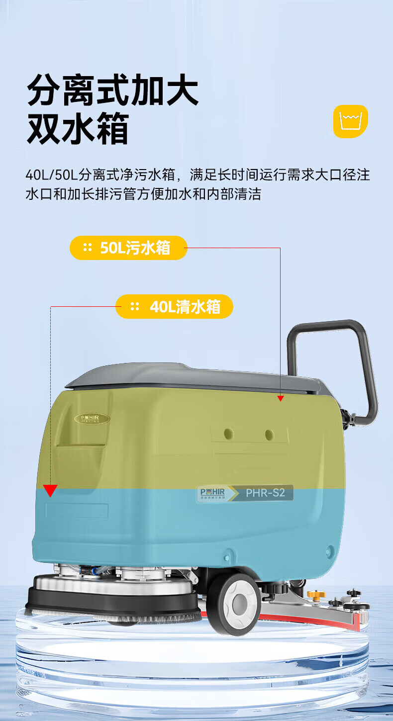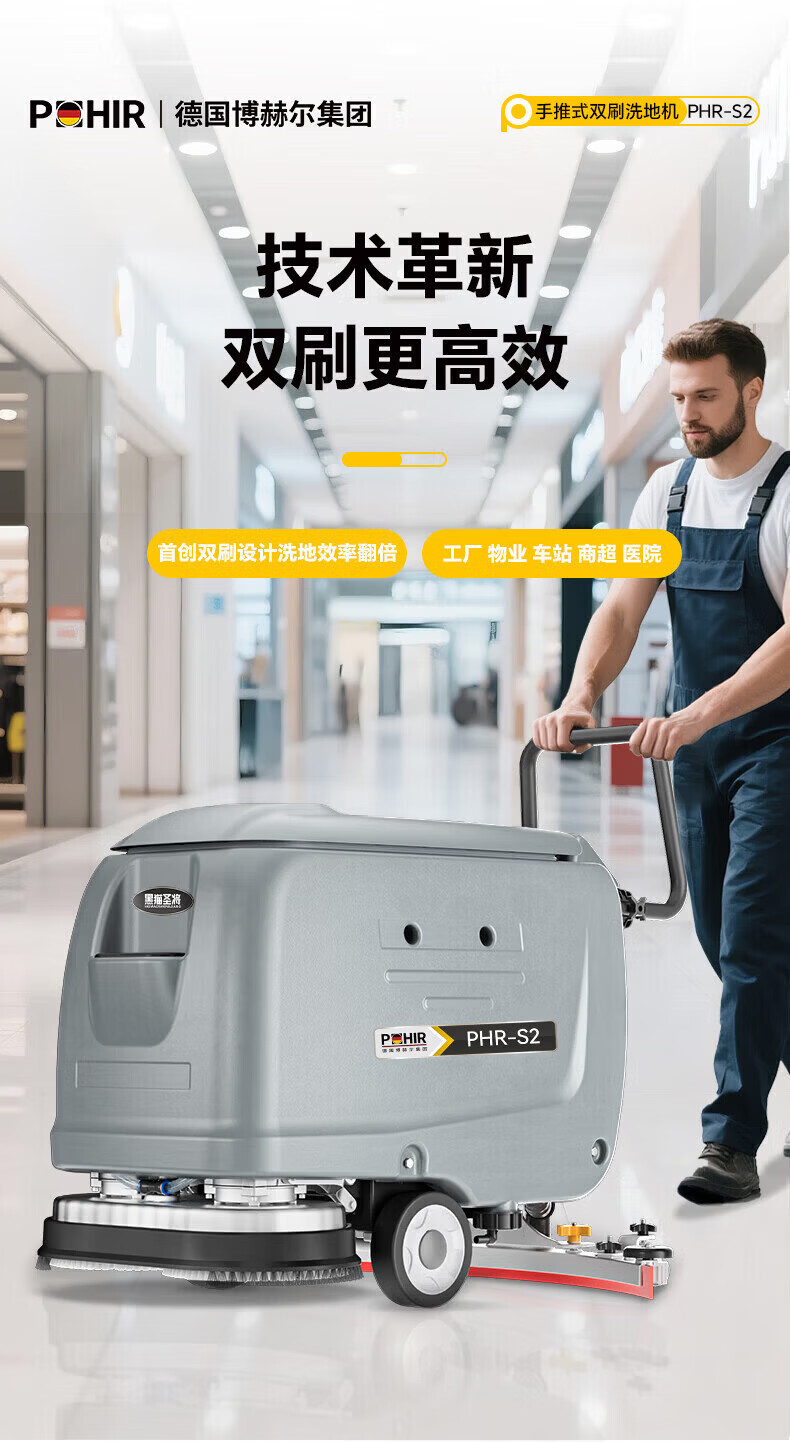 博赫尔(POHIR)德国博赫尔集团商用洗地机手推式工业工厂物业商场车库拖吸一体扫地机 PHR-S2手推双刷免维护款