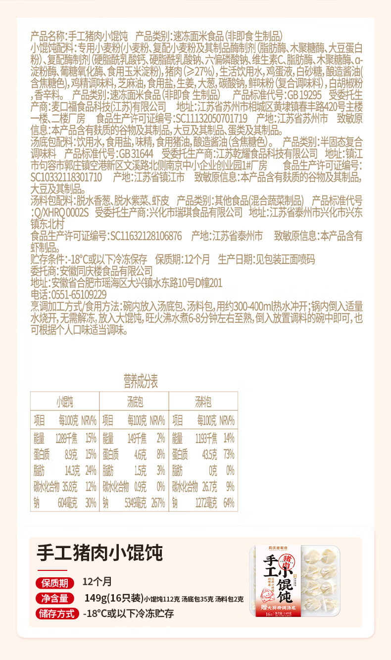 同庆楼手工猪肉小馄饨112g鸡汤云吞抄手儿童早餐速食 纯手工猪肉小馄饨112g*3袋