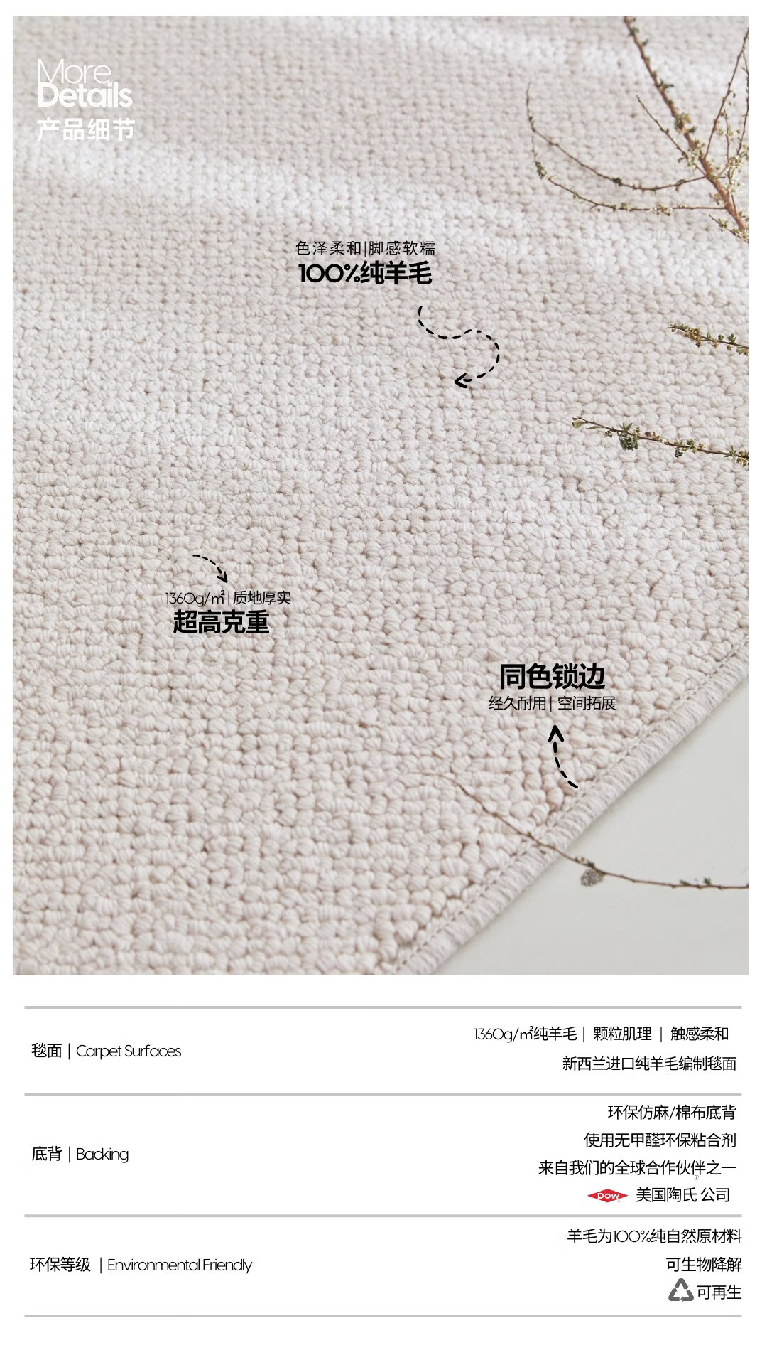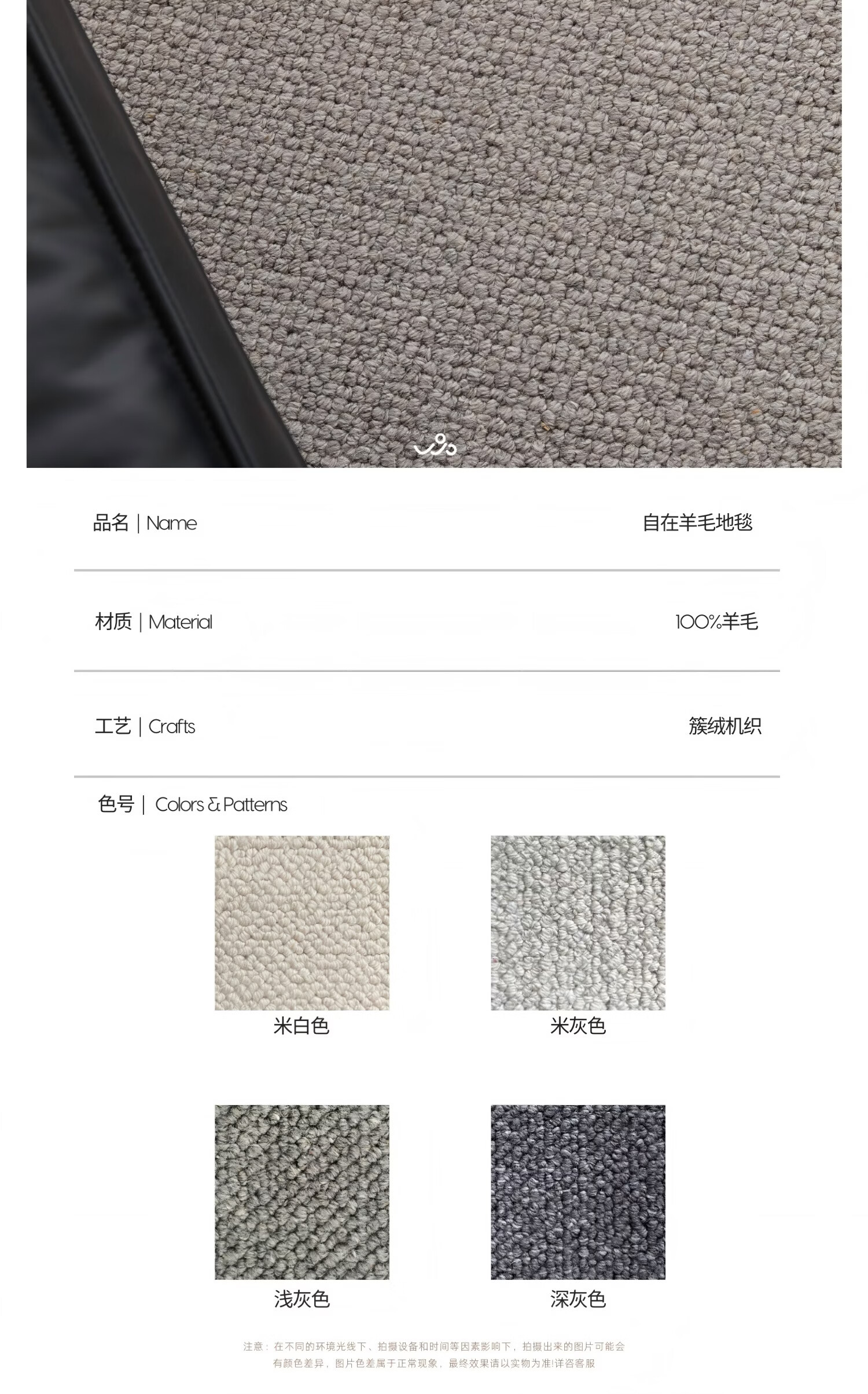 WOOCARPT新西兰进口纯羊毛素色家用客厅地毯茶几沙发轻奢高级感无甲醛地垫 燕麦白【进口羊毛】 70*140cm