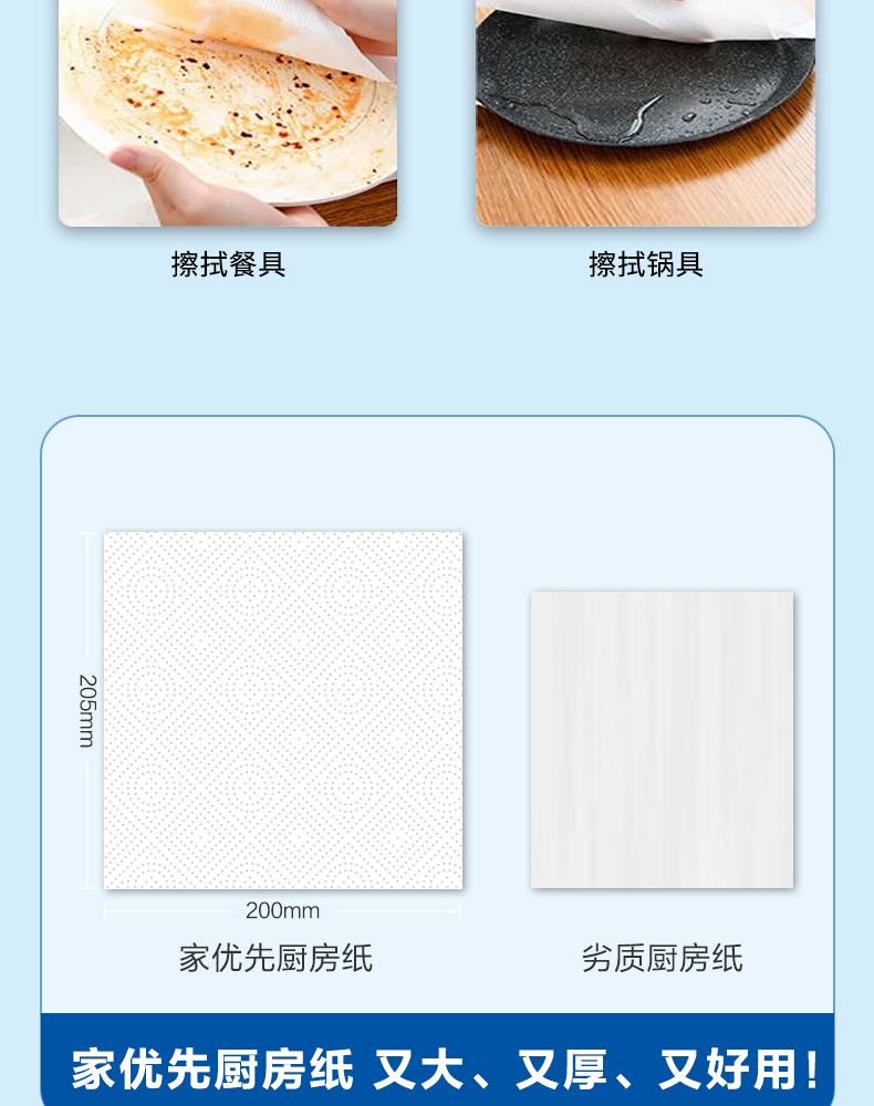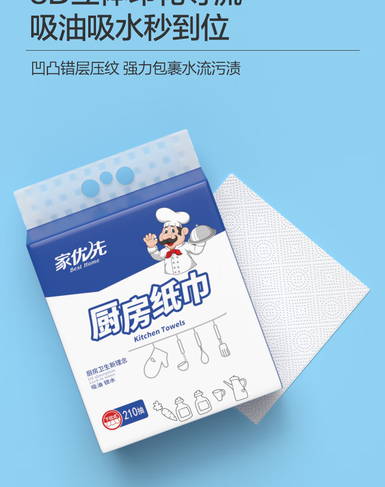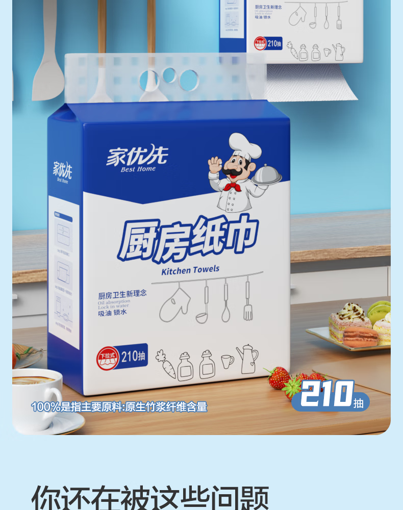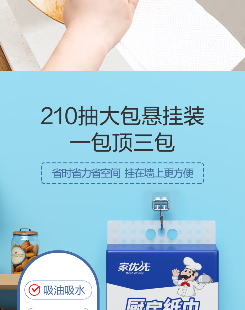 家优先厨房抽纸 双层加厚 吸水吸油大规格加厚一次性懒人抹布 2层 210抽*6包