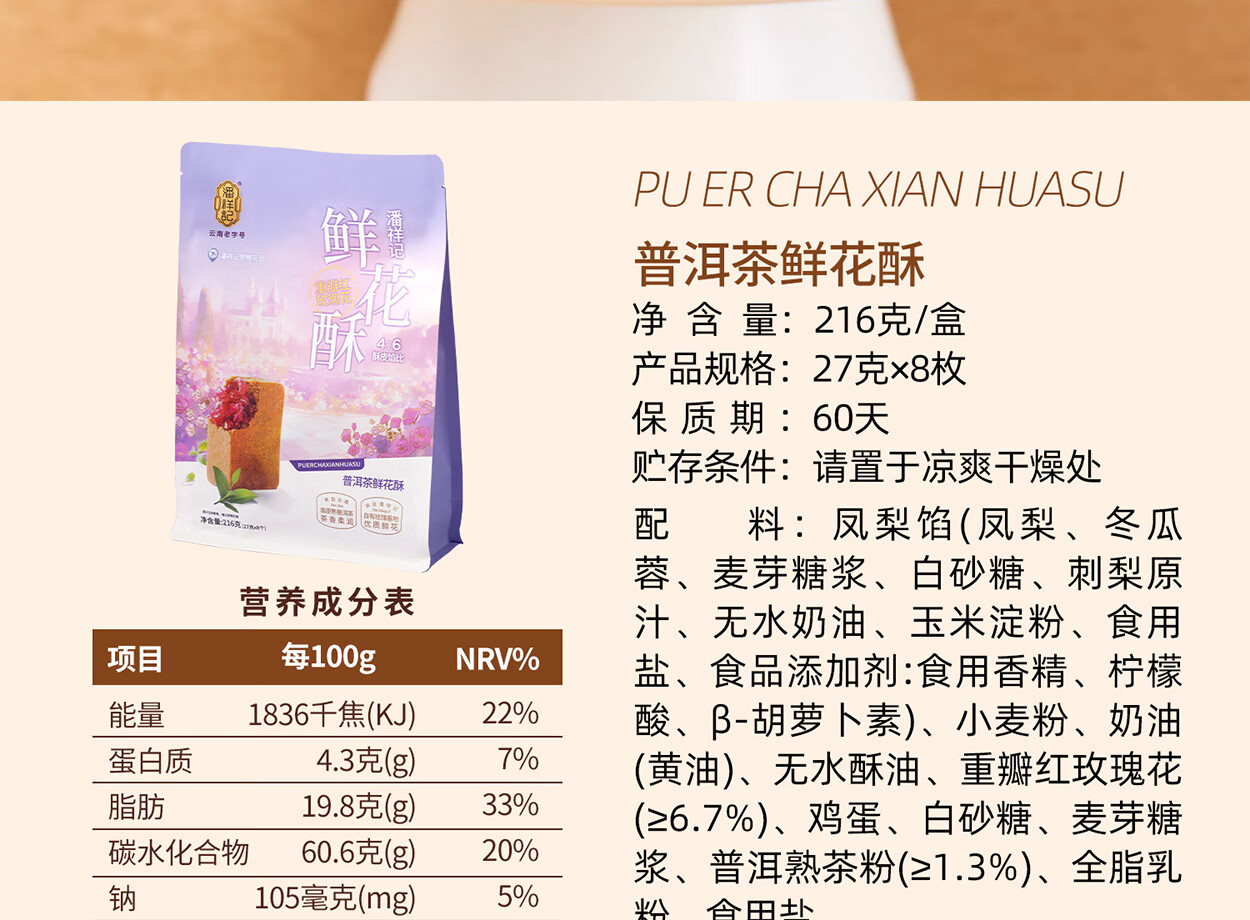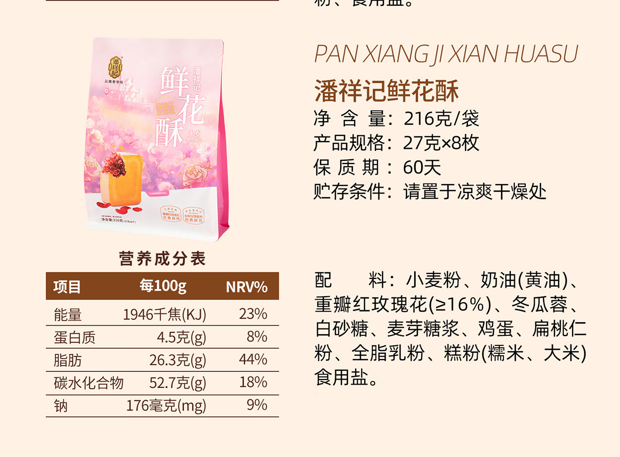 潘祥记鲜花饼普洱茶鲜花酥休闲零食甜品云南特产下午茶点 27g*8枚