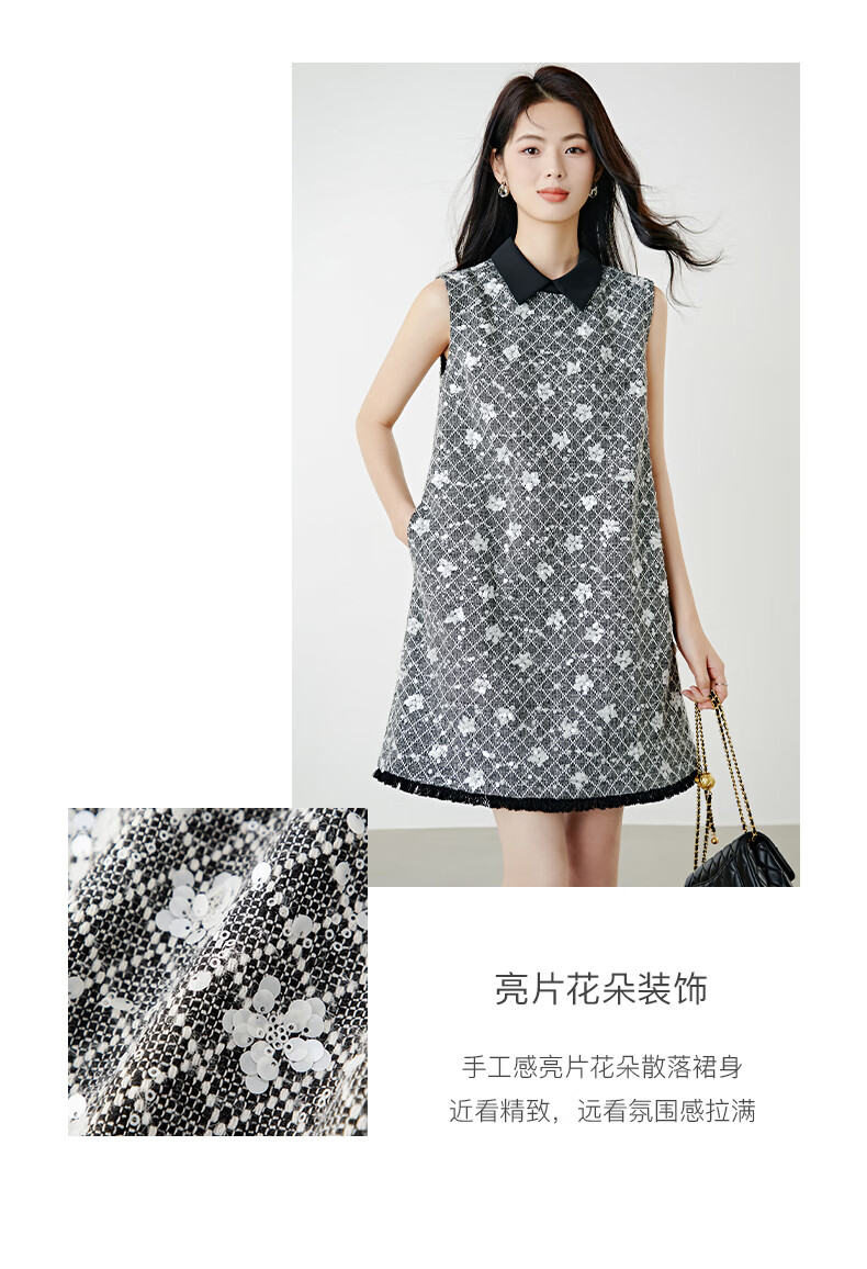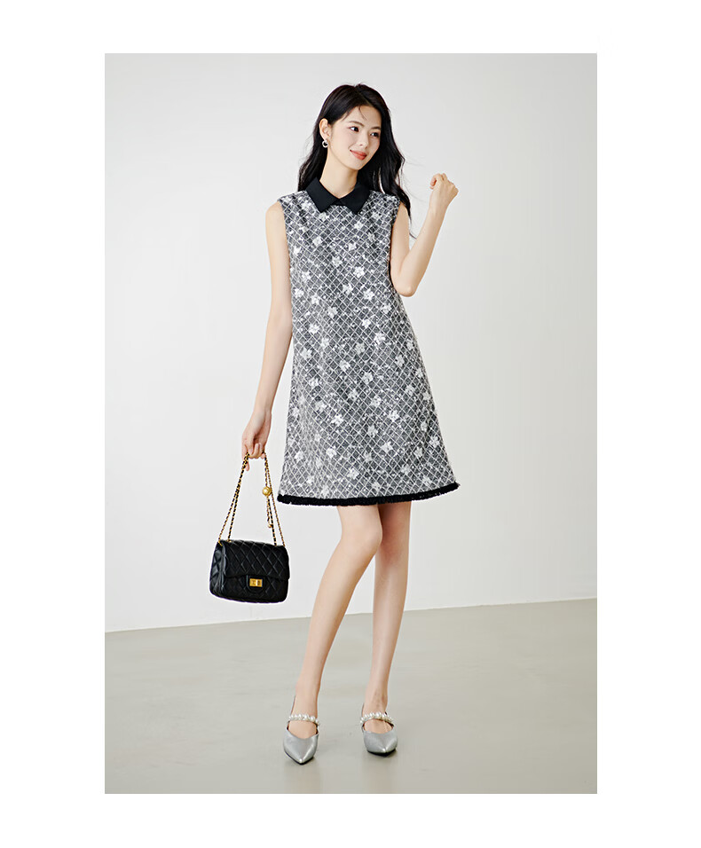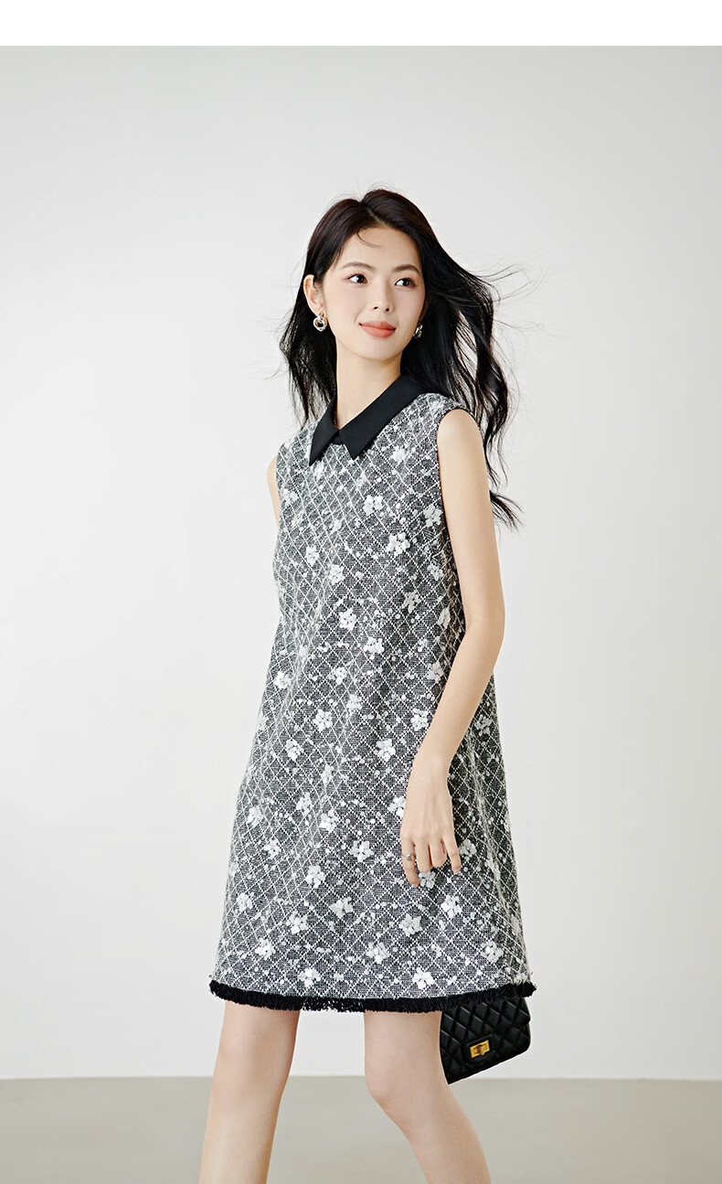 晚白【新品】2026年春款时尚格纹亮片翻领裙子挺括显瘦优雅无袖连衣裙 花色 S