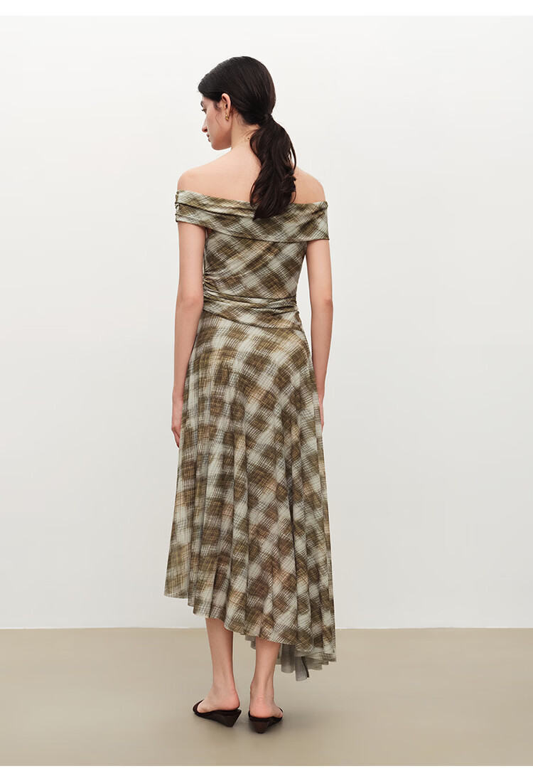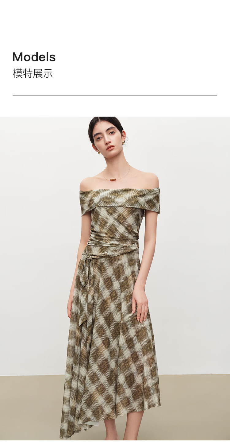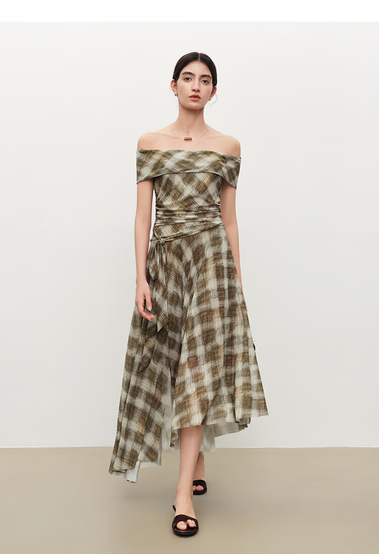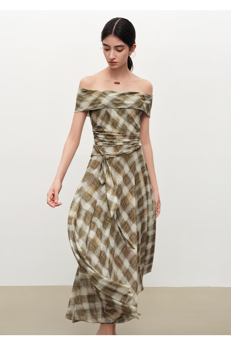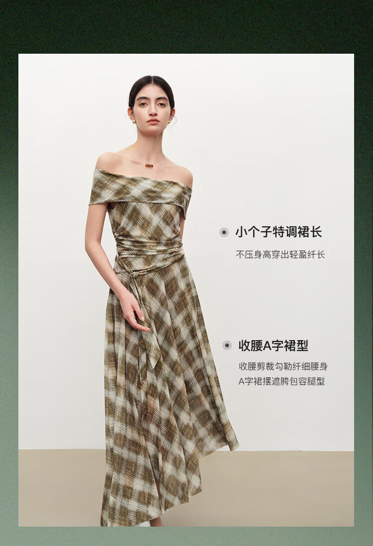 自巧【定格胶囊】小个子格纹网纱一字肩收腰连衣裙女2026夏季新款 绿米格 XS (尺码:2)