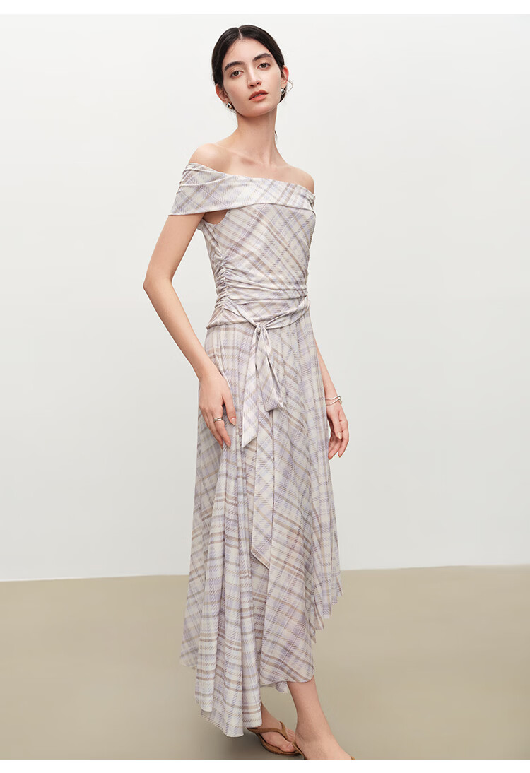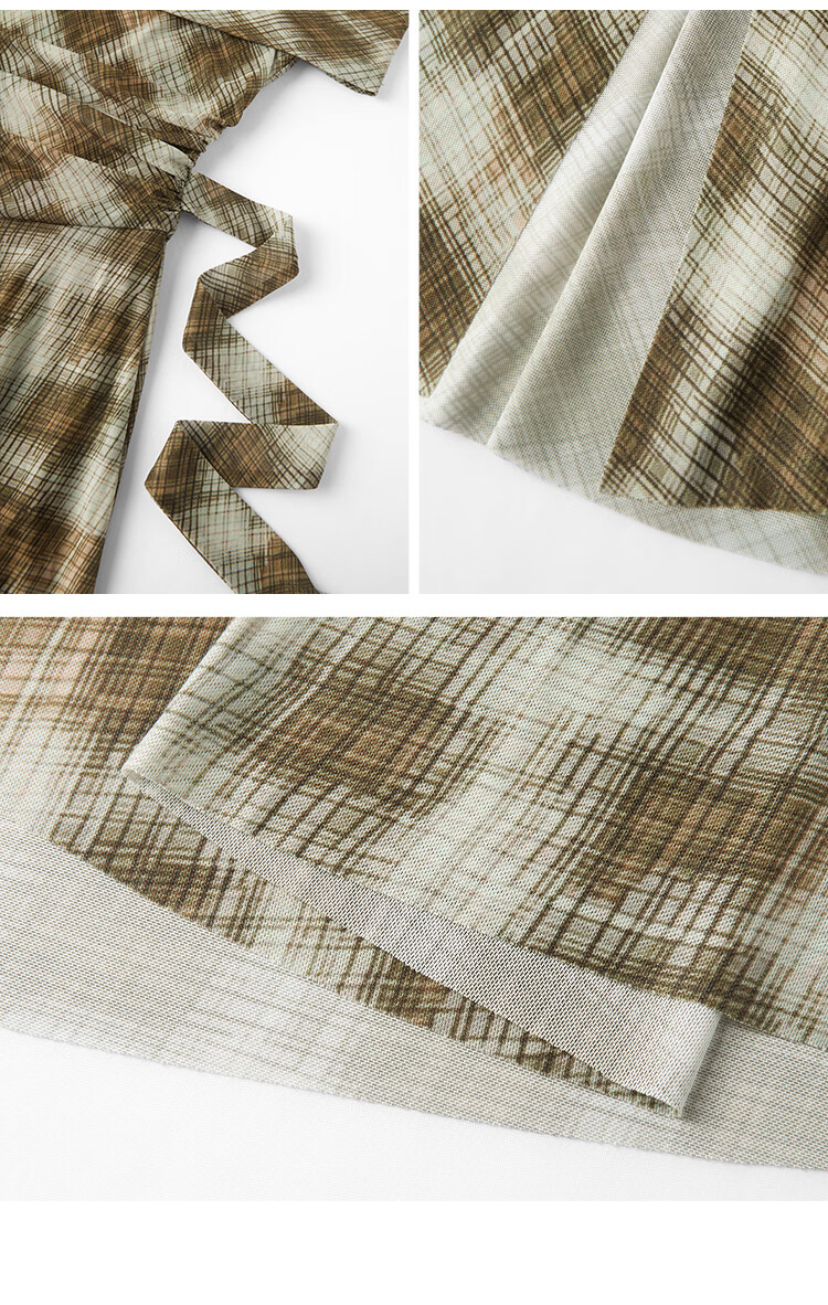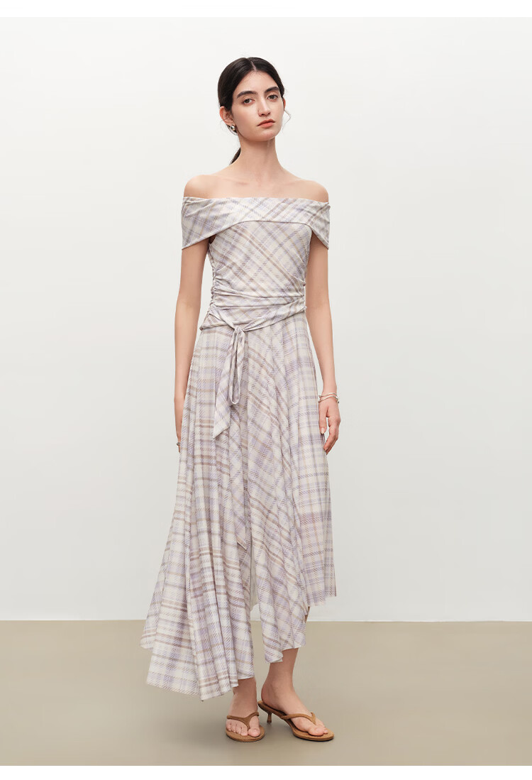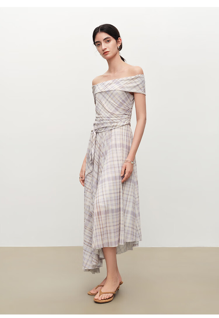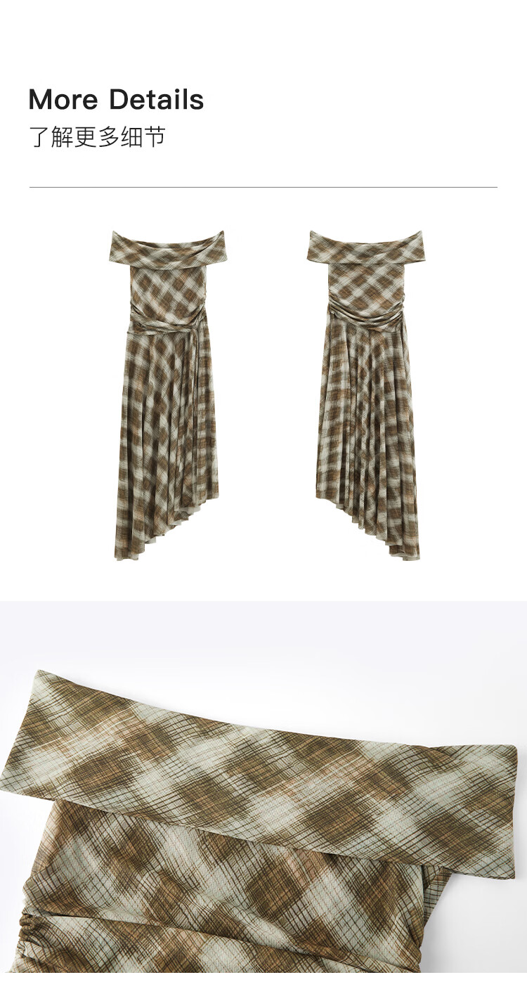 自巧【定格胶囊】小个子格纹网纱一字肩收腰连衣裙女2026夏季新款 绿米格 XS (尺码:2)