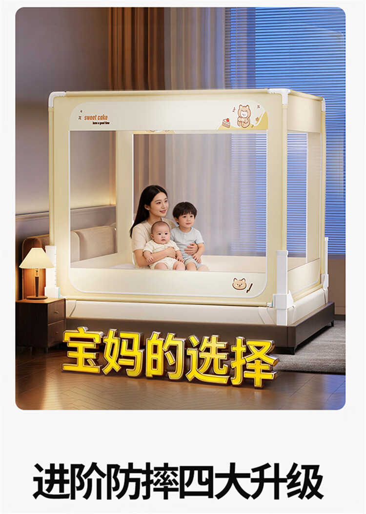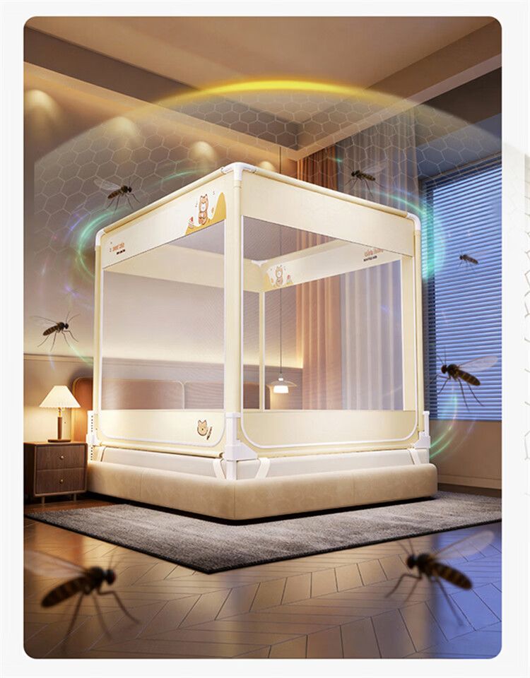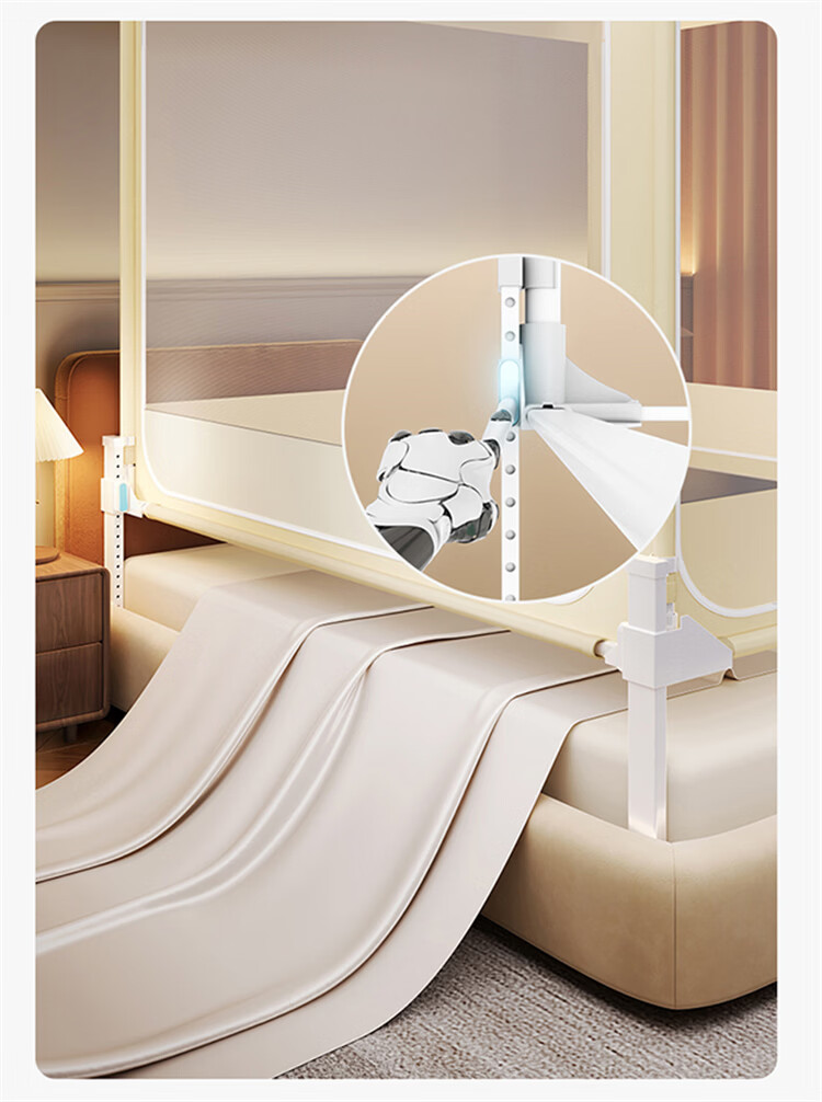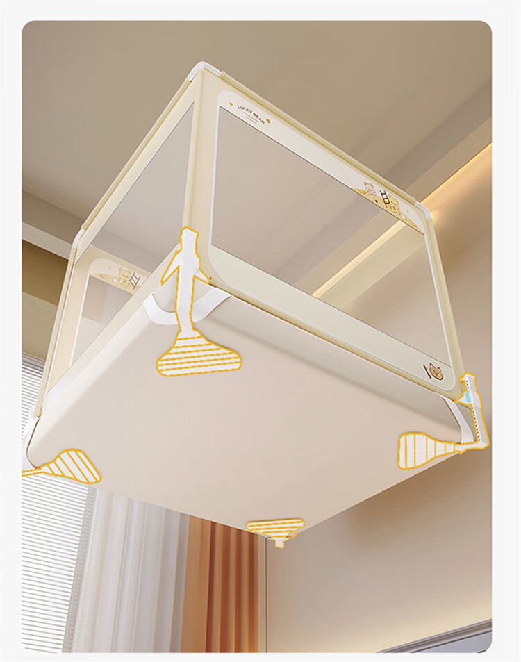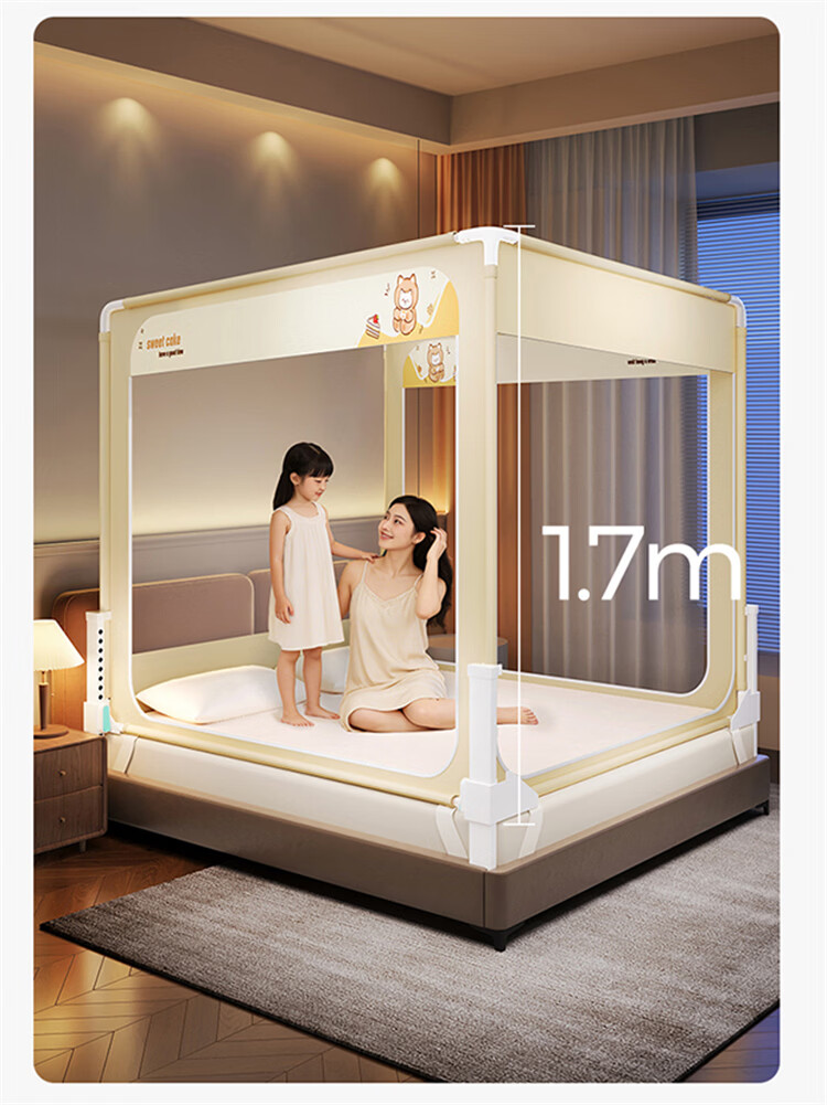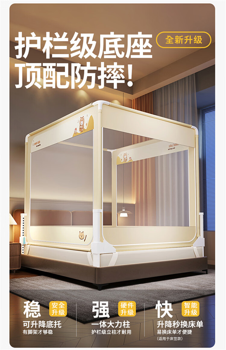 无印良品A类婴儿防摔蚊帐1.5米x2米家用一体式免安装升降蚊帐架卧室床围栏 【含遮光顶】趴趴熊-围栏级防摔 150cm*200cm*170cm -大力士压脚支架