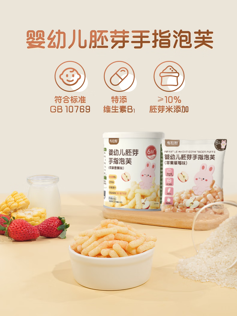布拉粉小兔团团婴幼儿胚芽米手指泡芙宝宝零食儿童泡芙条 【2罐+3袋】香蕉味2罐+草莓味3袋