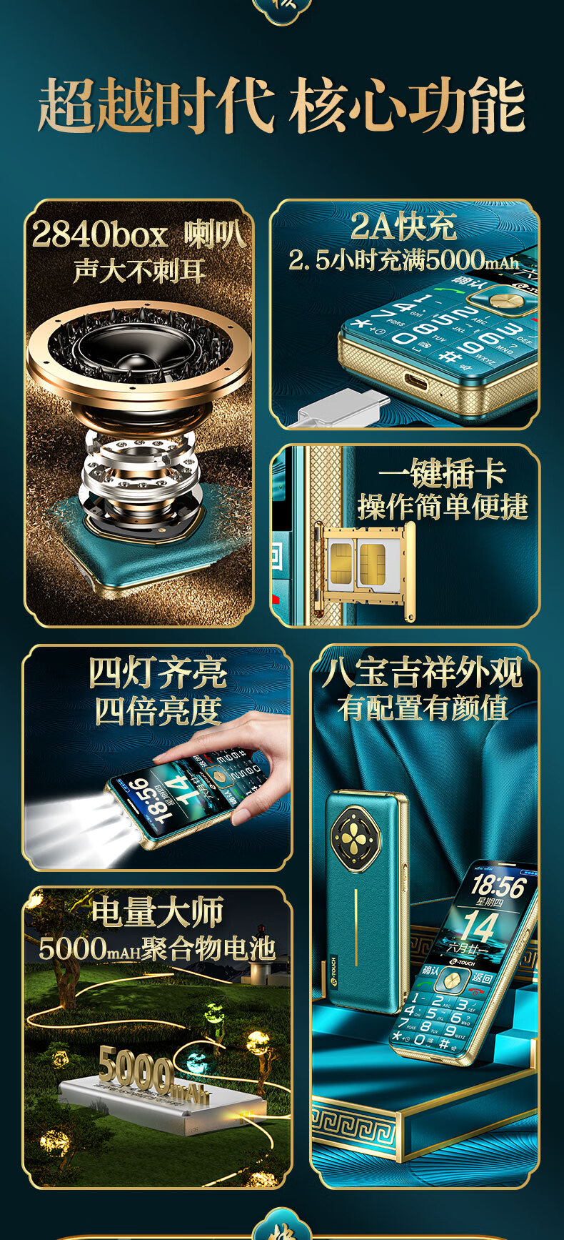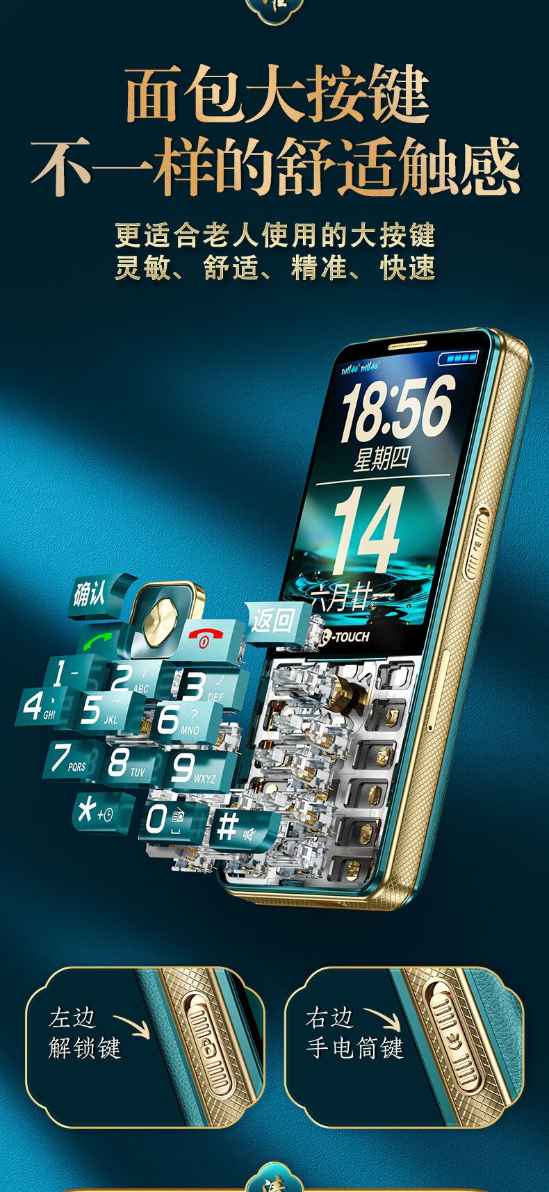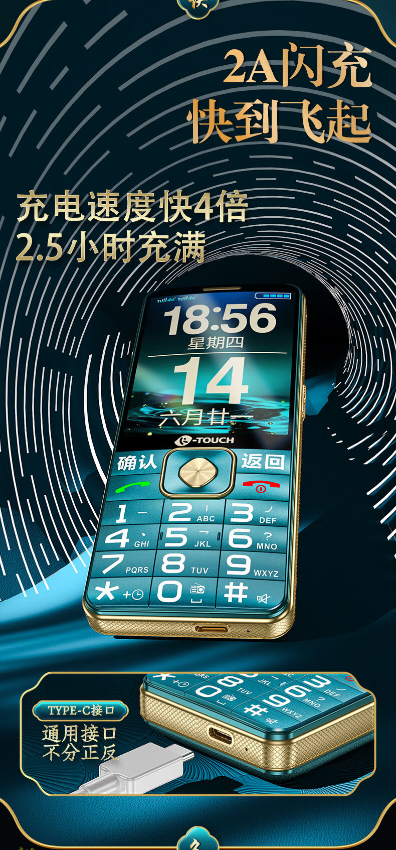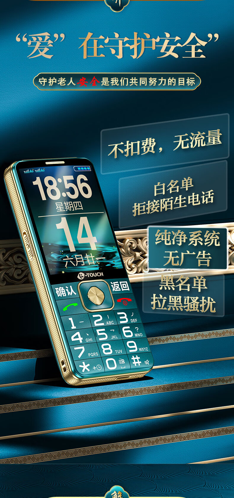天语U20老年机2A快充5000mAh全网通4G超长待机大声大屏大字按键学生只打电话专用功能老人手机 千山翠