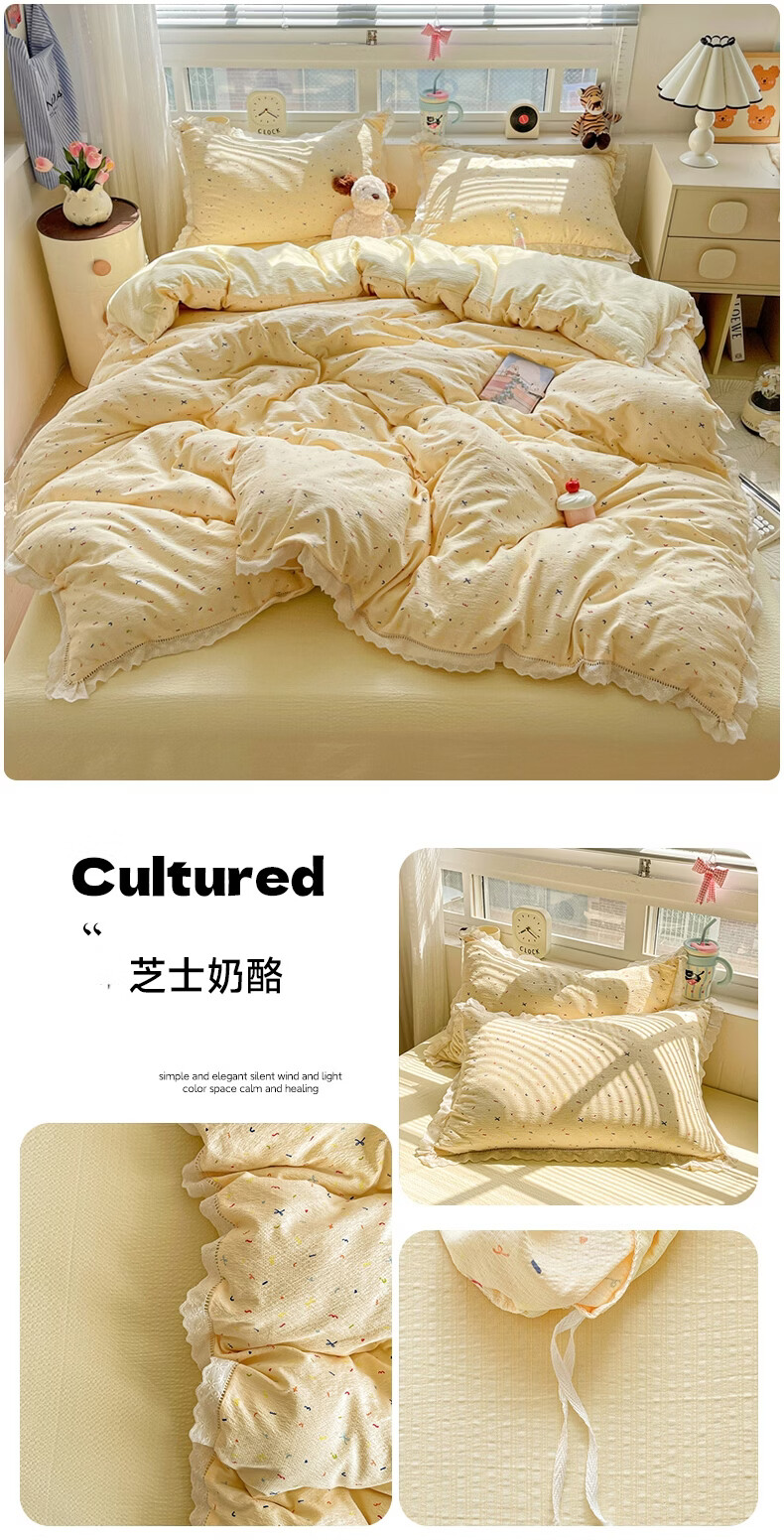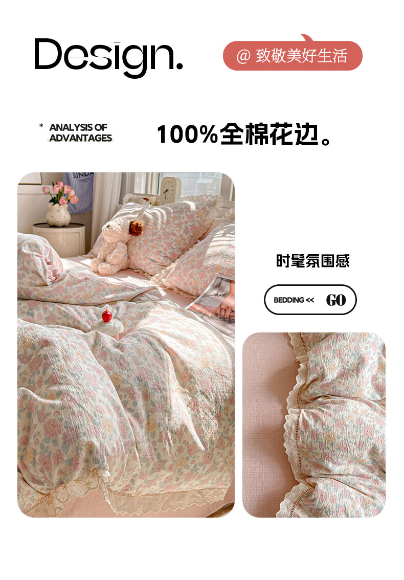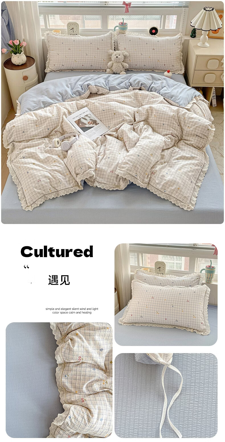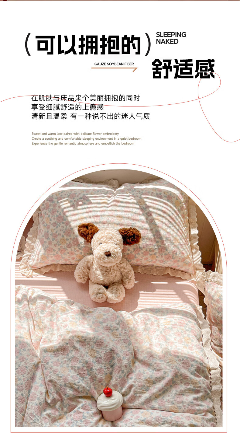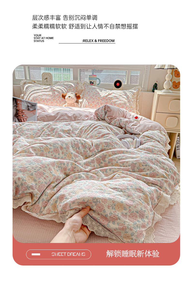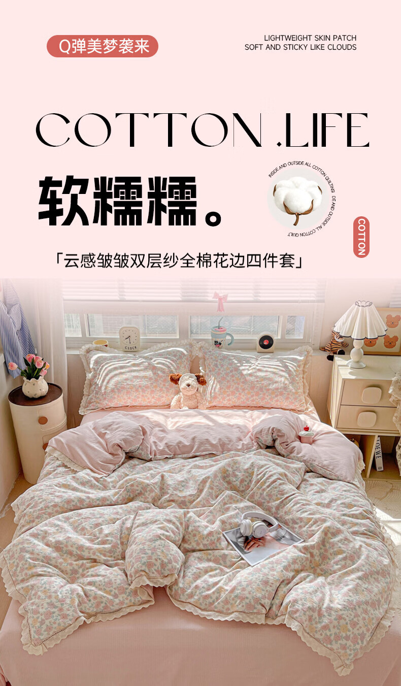 浪莎(LangSha)邹邹双层纱纯棉全棉花边床上四件套亲肤裸睡宿舍床单被罩三件套品 遇见【四季通用 亲肤裸睡】 1.5m 床单款 四件套-被套200*230cm
