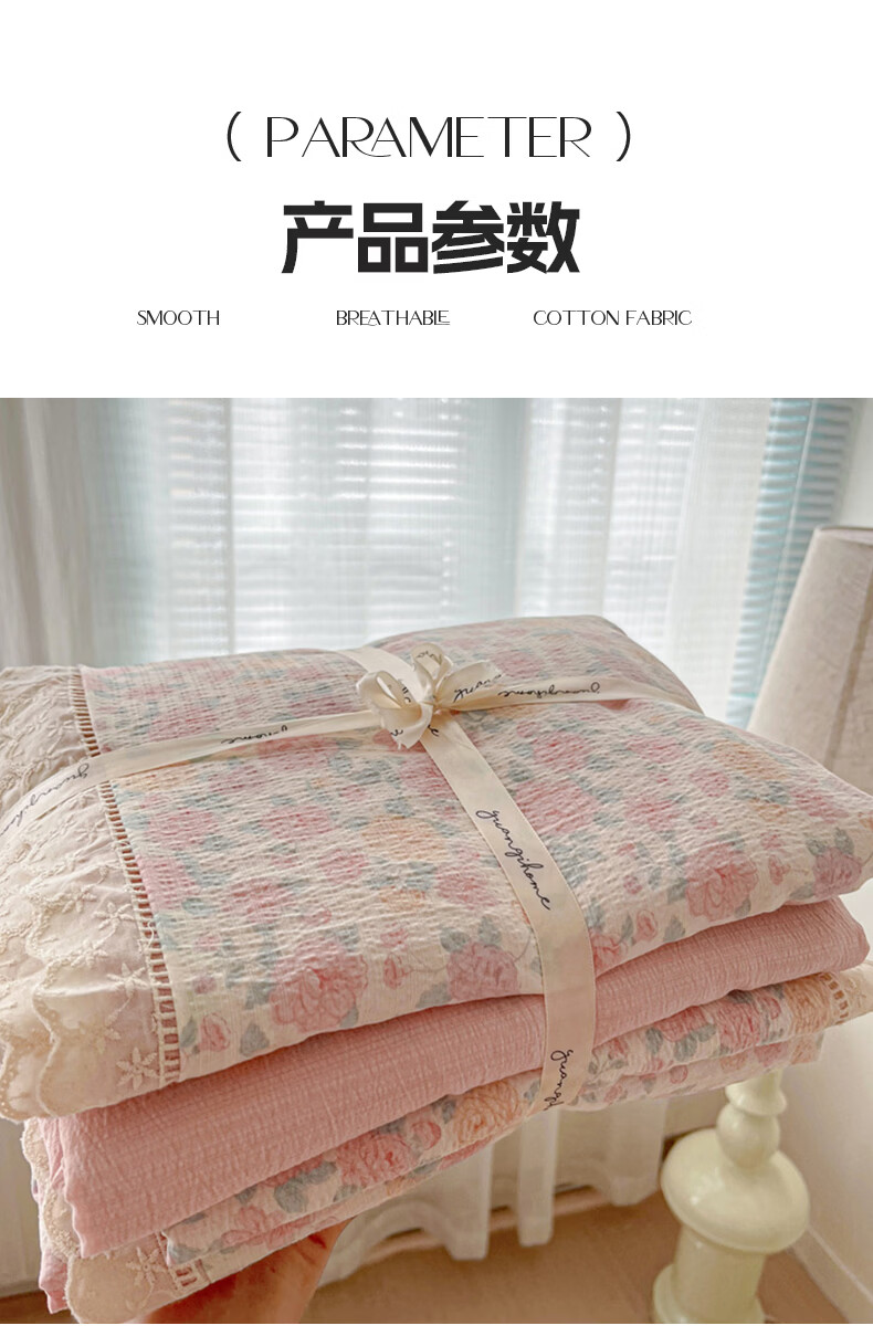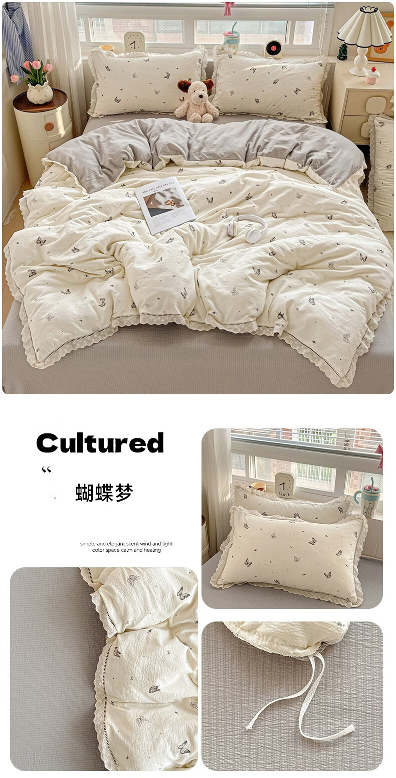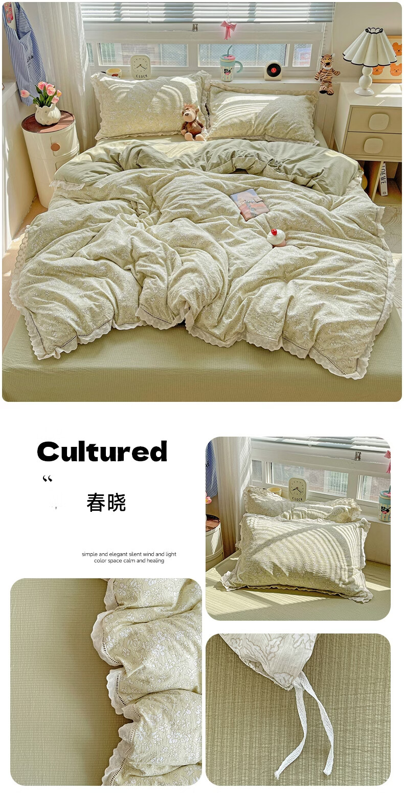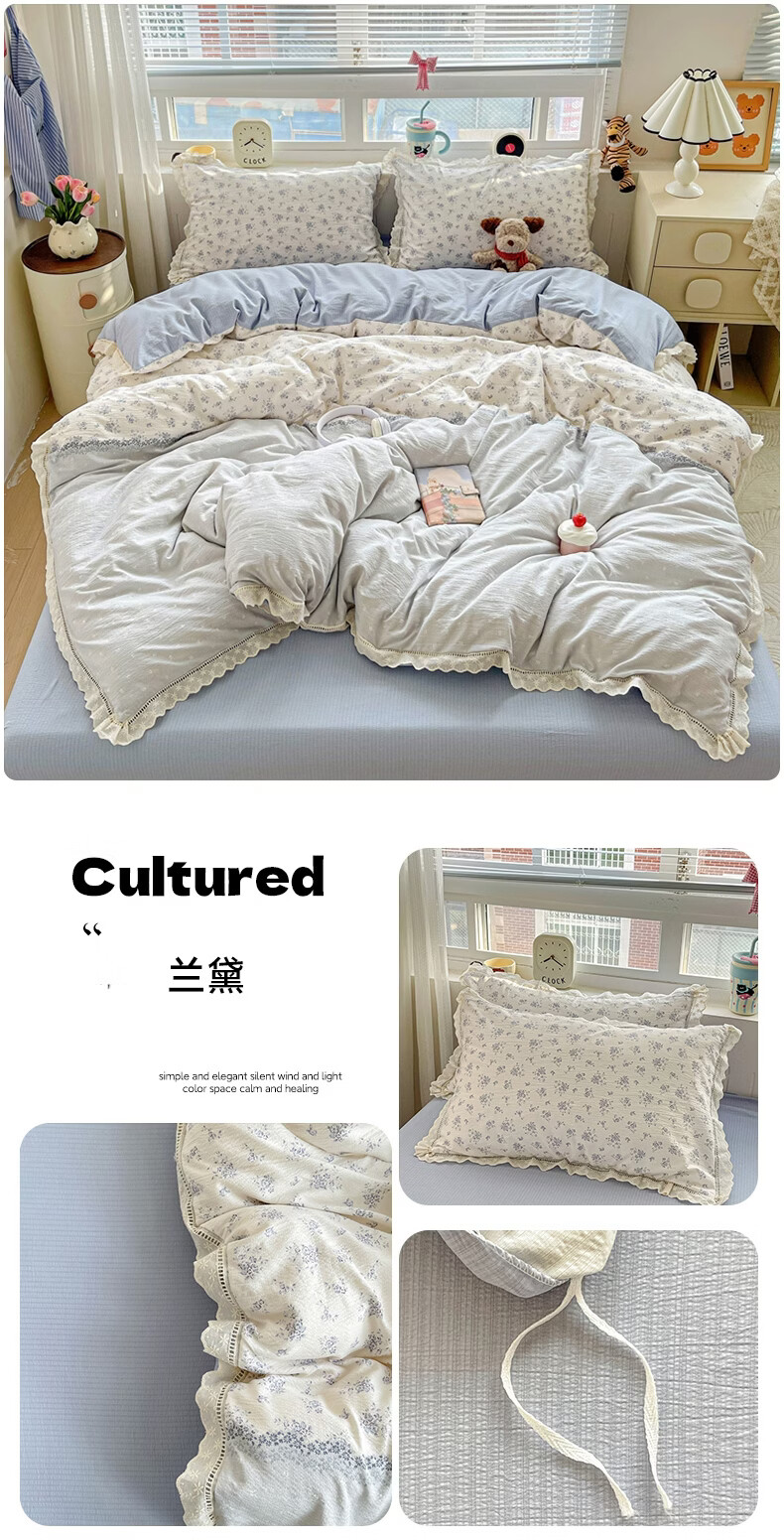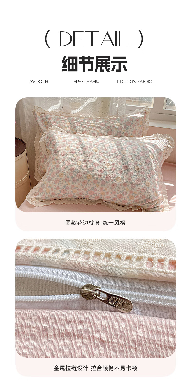 浪莎(LangSha)邹邹双层纱纯棉全棉花边床上四件套亲肤裸睡宿舍床单被罩三件套品 遇见【四季通用 亲肤裸睡】 1.5m 床单款 四件套-被套200*230cm