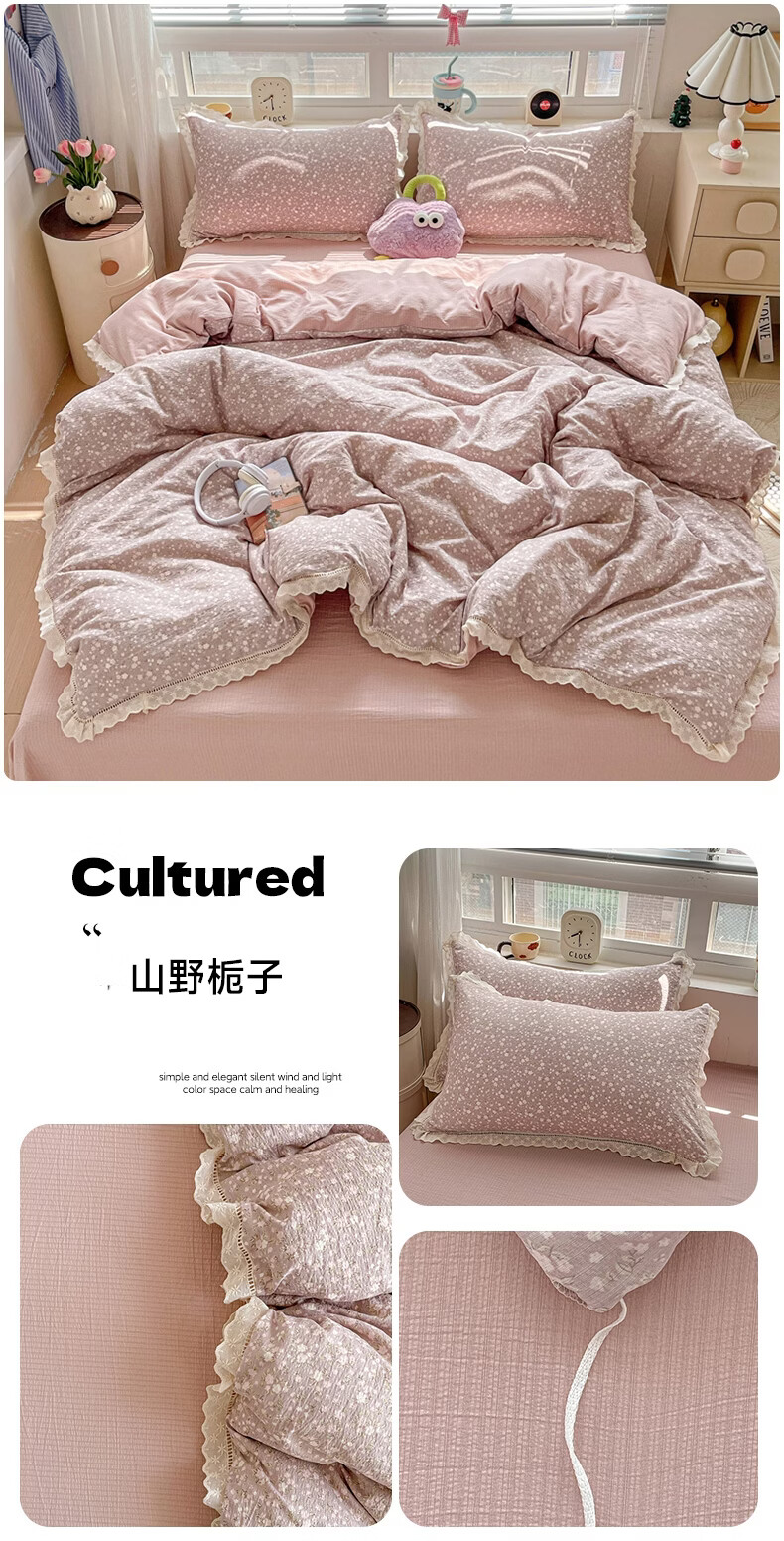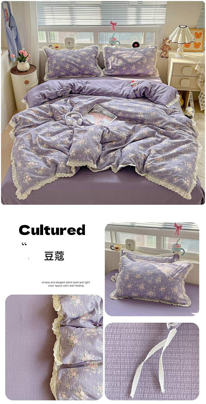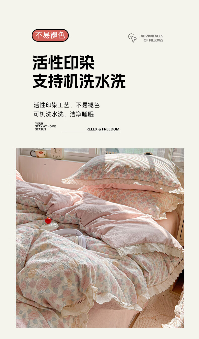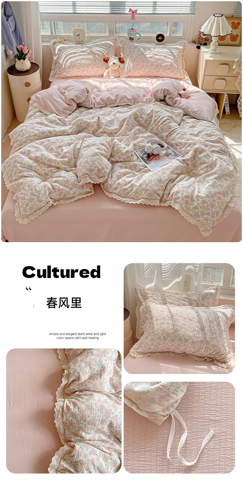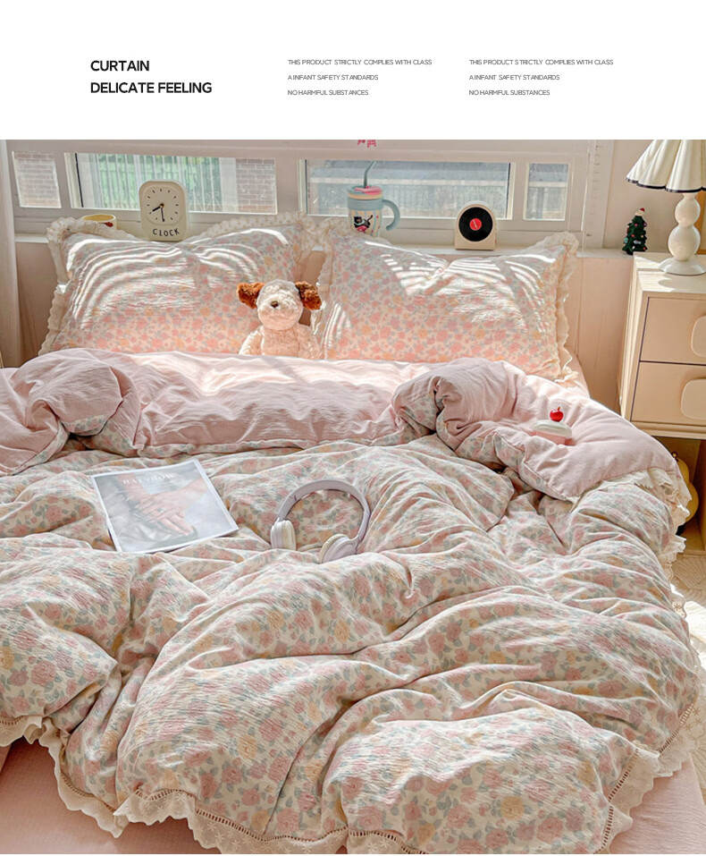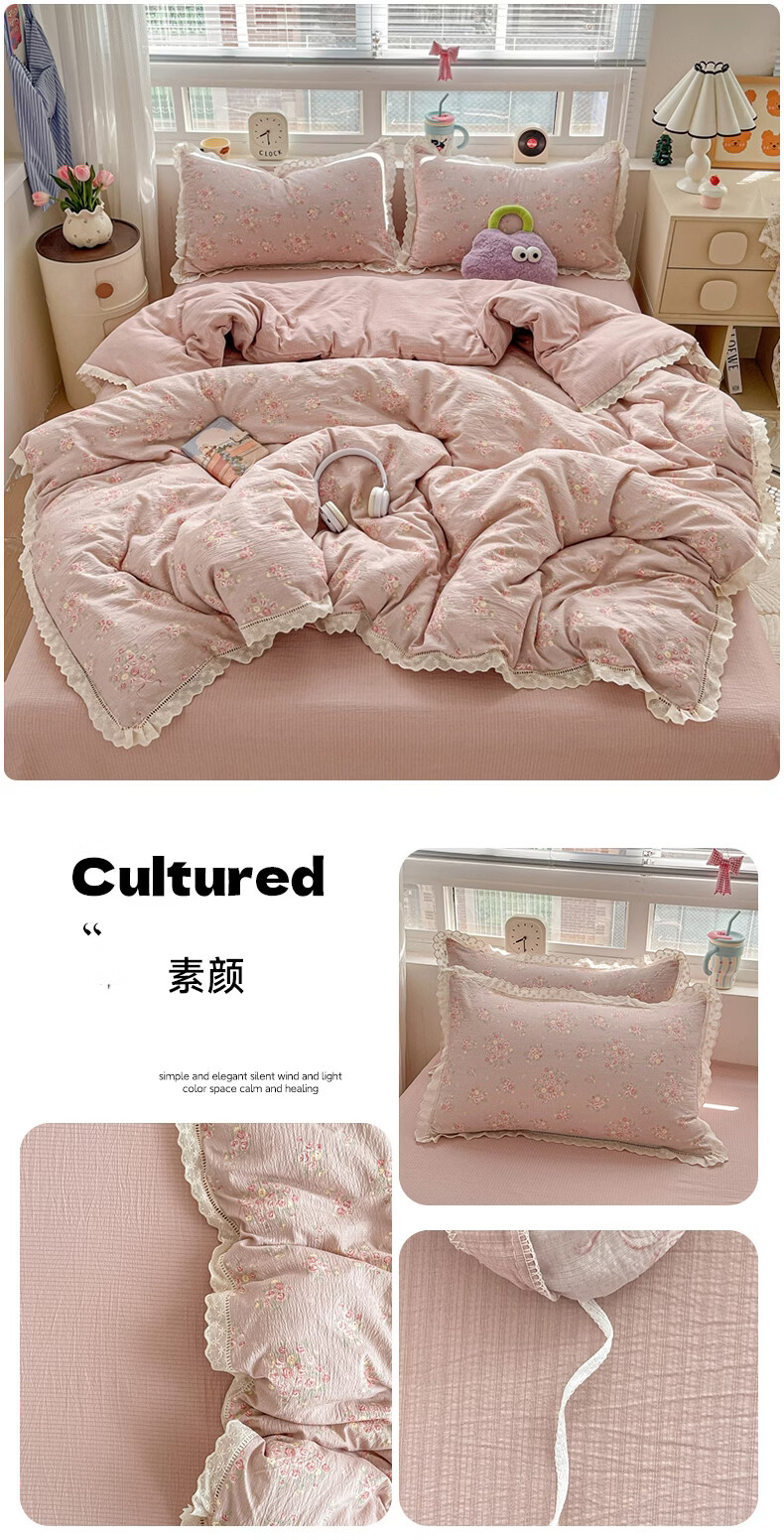 浪莎(LangSha)邹邹双层纱纯棉全棉花边床上四件套亲肤裸睡宿舍床单被罩三件套品 遇见【四季通用 亲肤裸睡】 1.5m 床单款 四件套-被套200*230cm