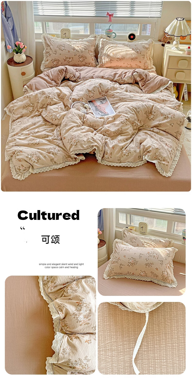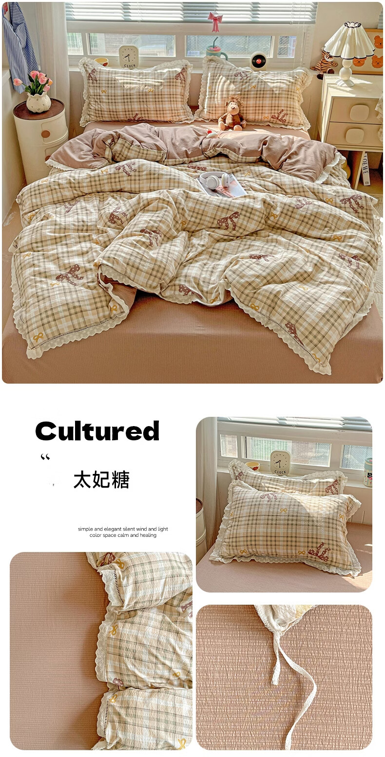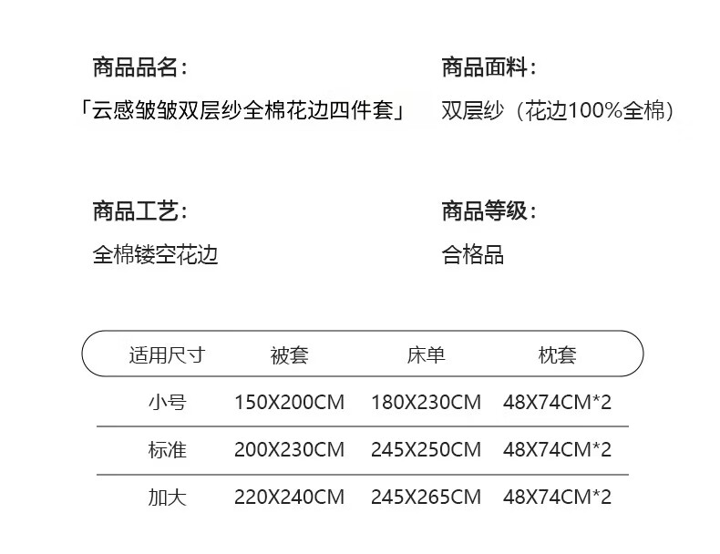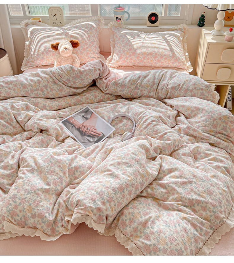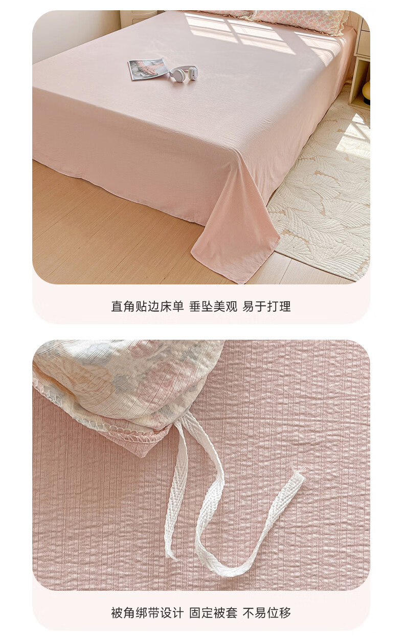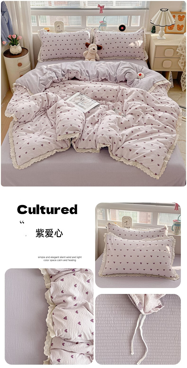 浪莎(LangSha)邹邹双层纱纯棉全棉花边床上四件套亲肤裸睡宿舍床单被罩三件套品 遇见【四季通用 亲肤裸睡】 1.5m 床单款 四件套-被套200*230cm