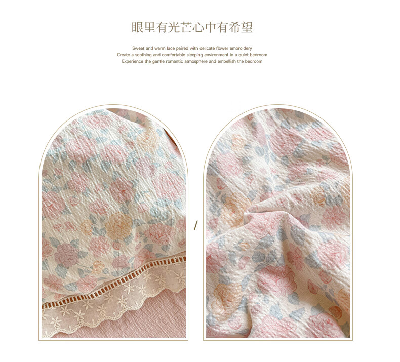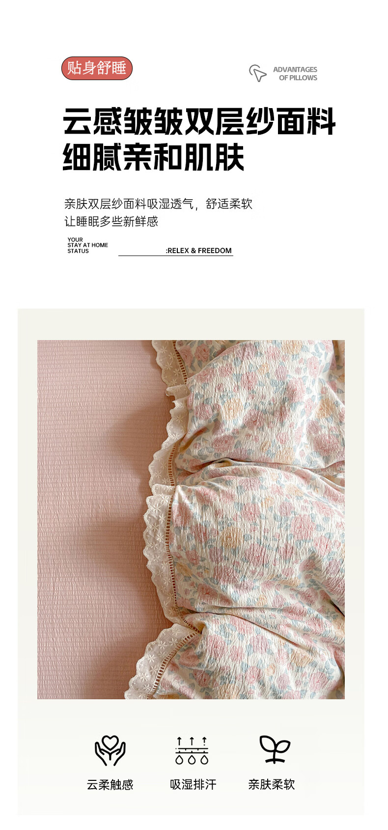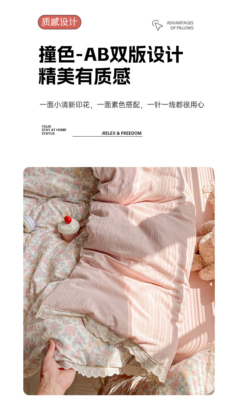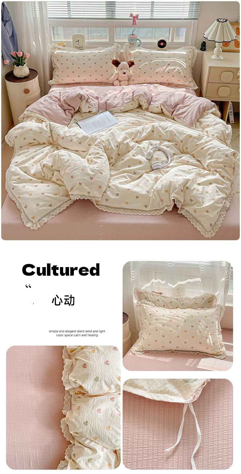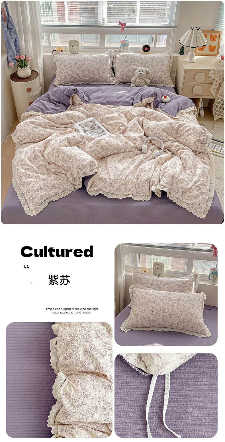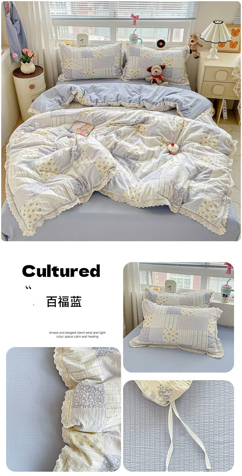 浪莎(LangSha)邹邹双层纱纯棉全棉花边床上四件套亲肤裸睡宿舍床单被罩三件套品 遇见【四季通用 亲肤裸睡】 1.5m 床单款 四件套-被套200*230cm