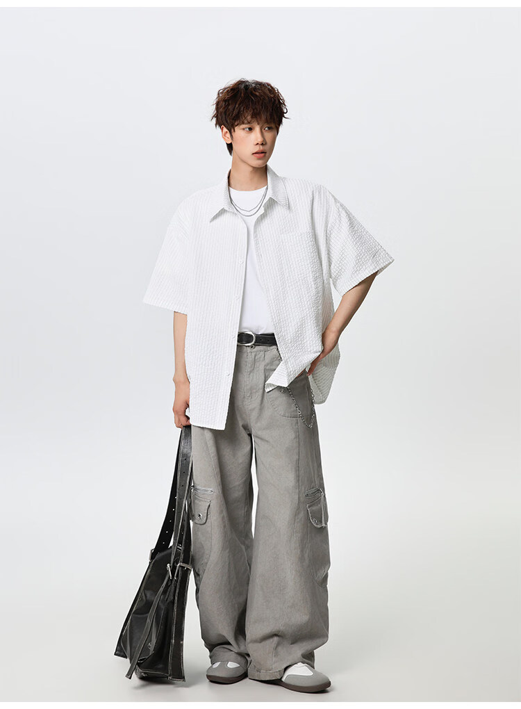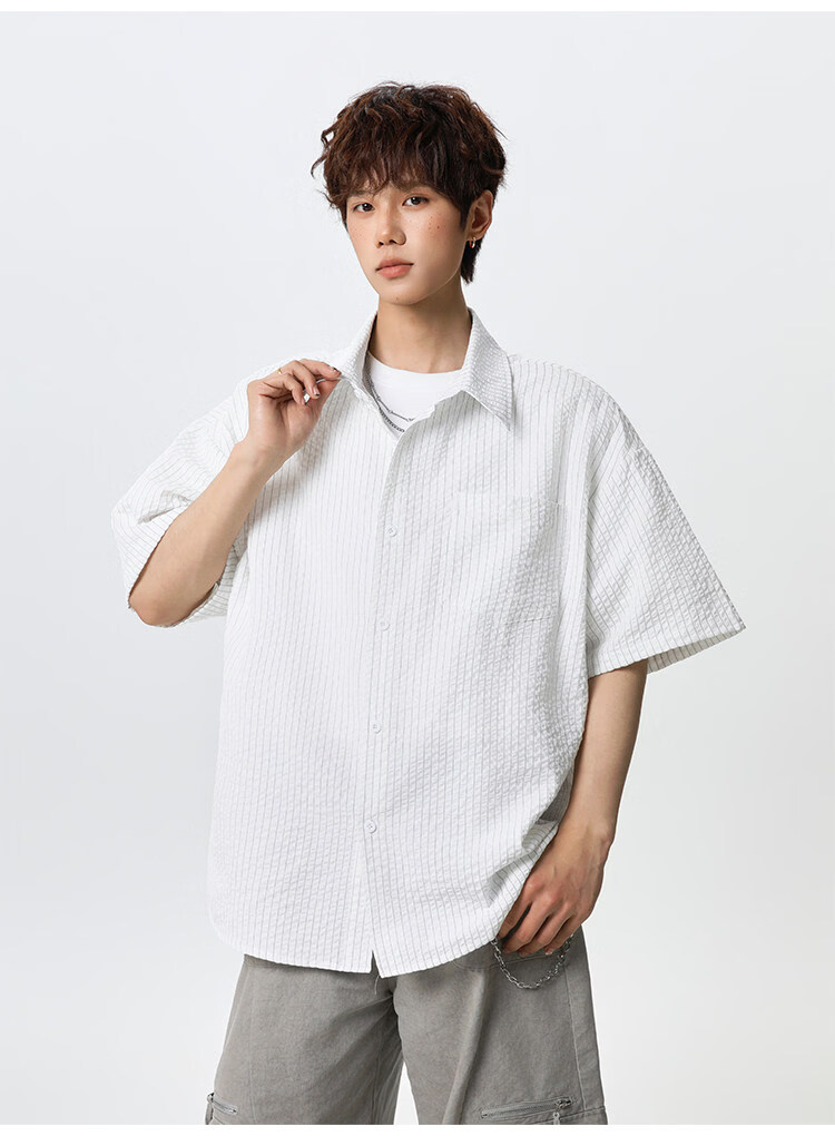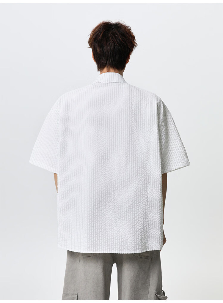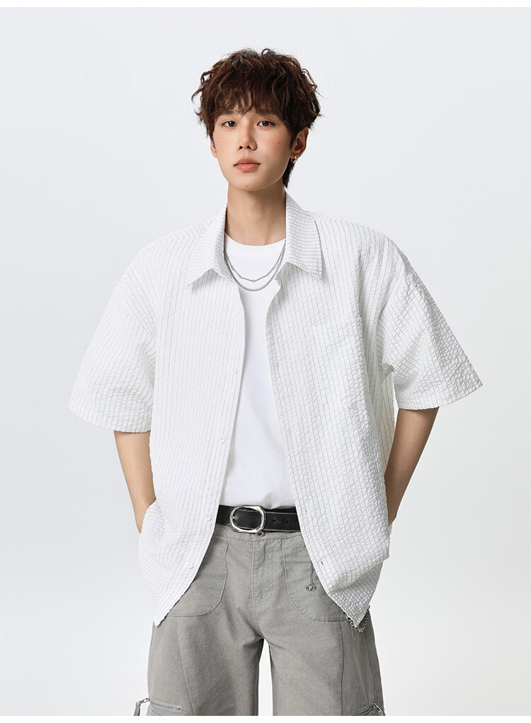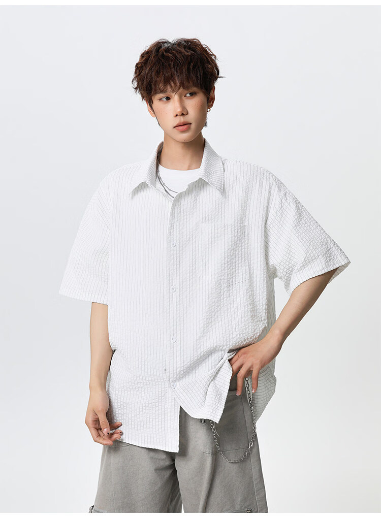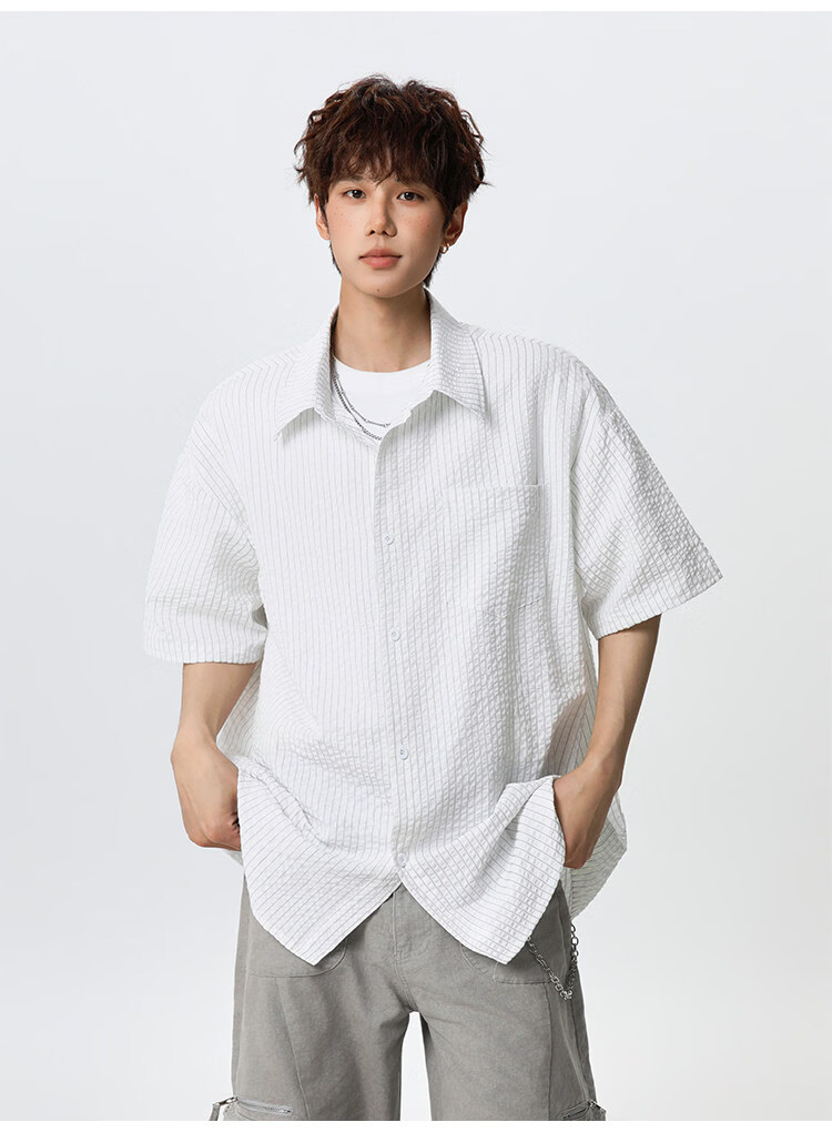 NEW OR MODE复古条纹肌理感短袖衬衫男夏季新款潮牌宽松百搭休闲慵懒衬衣外套 白色【高品质】 M 【建议90-110斤】