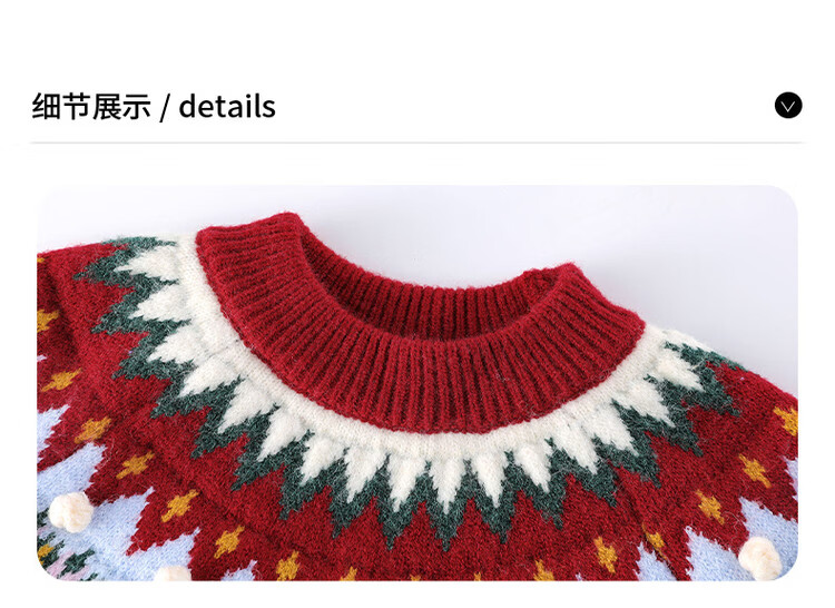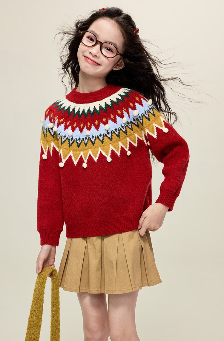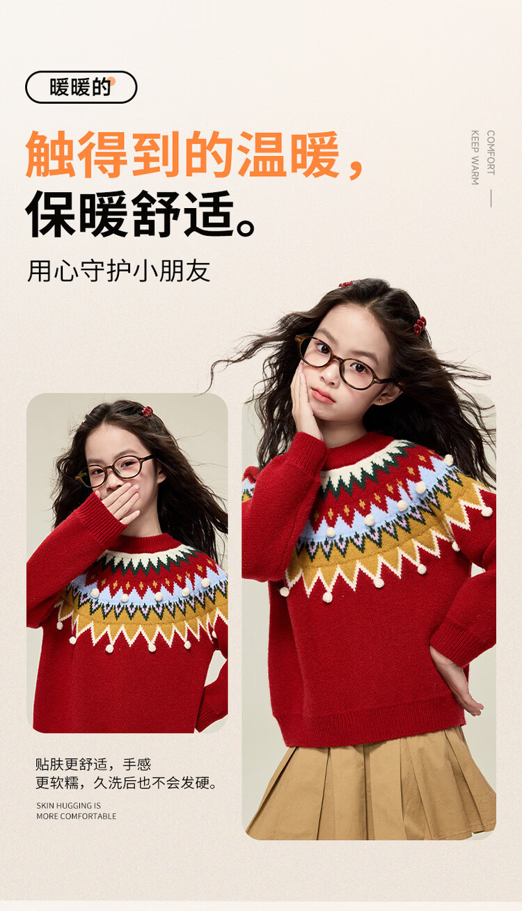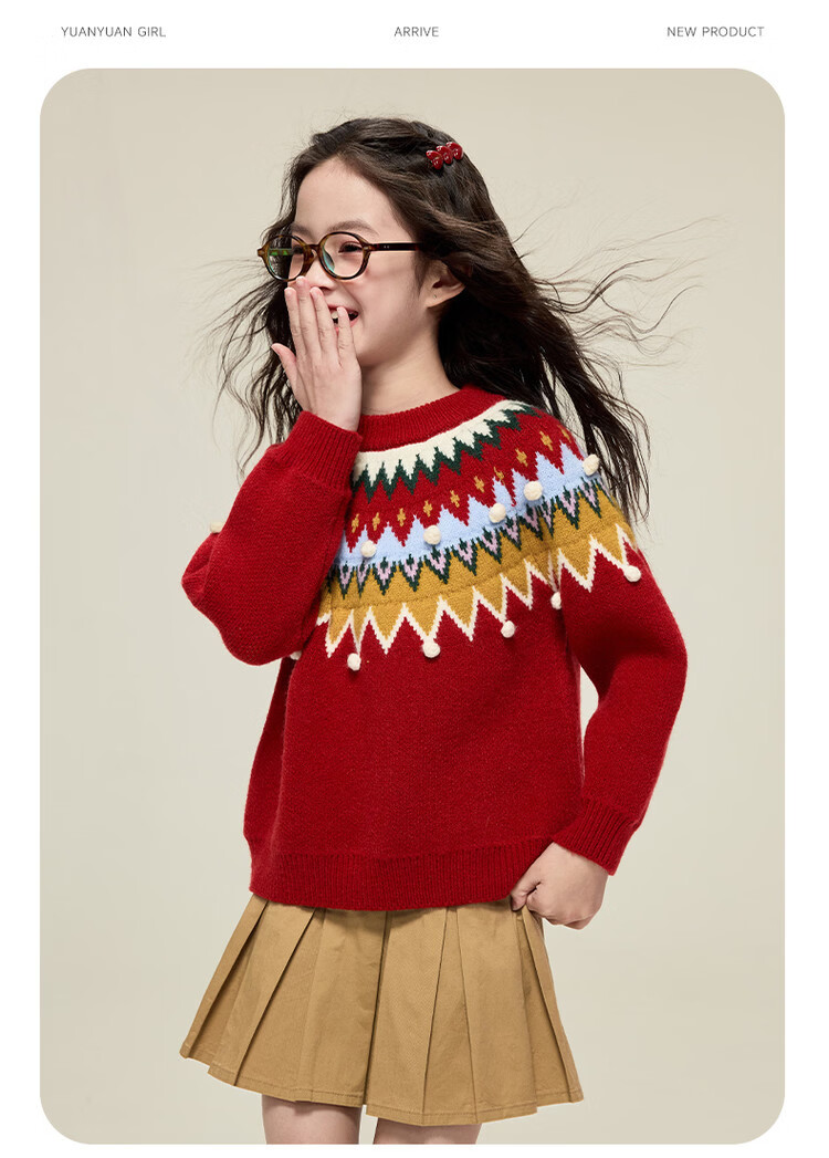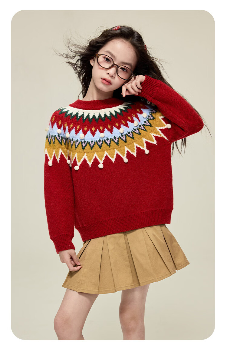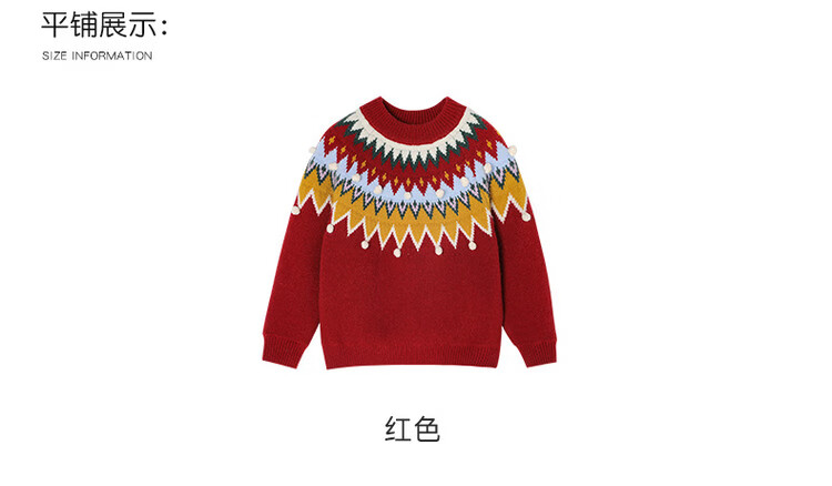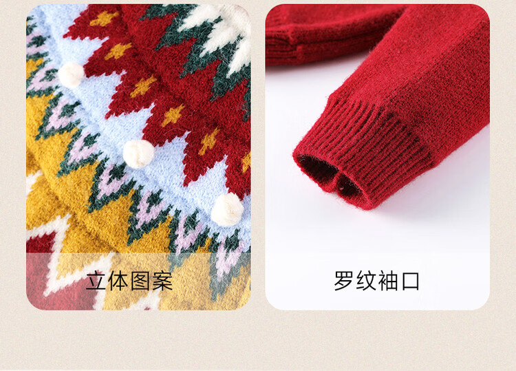 媛媛公主儿童毛衣圣诞氛围提花冬季新款女童保暖加厚套头线衫中大童上衣 红色 110