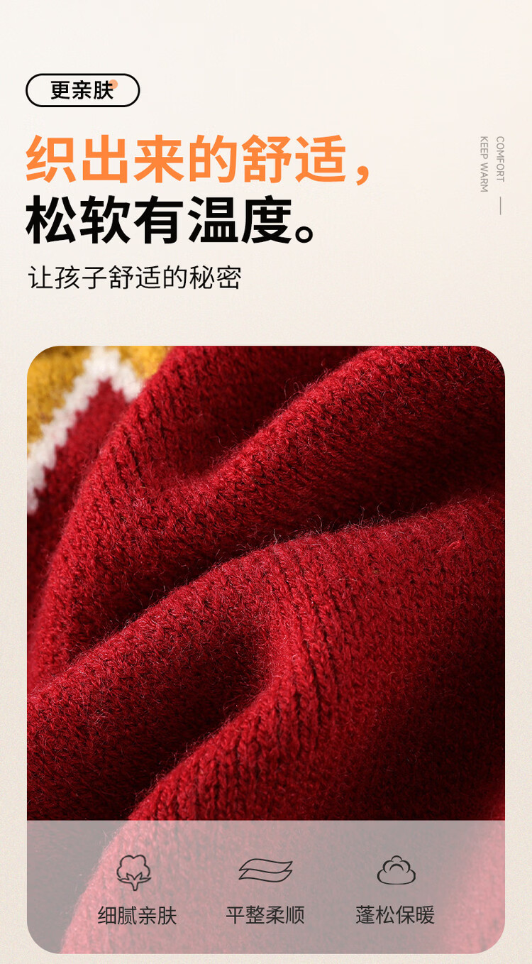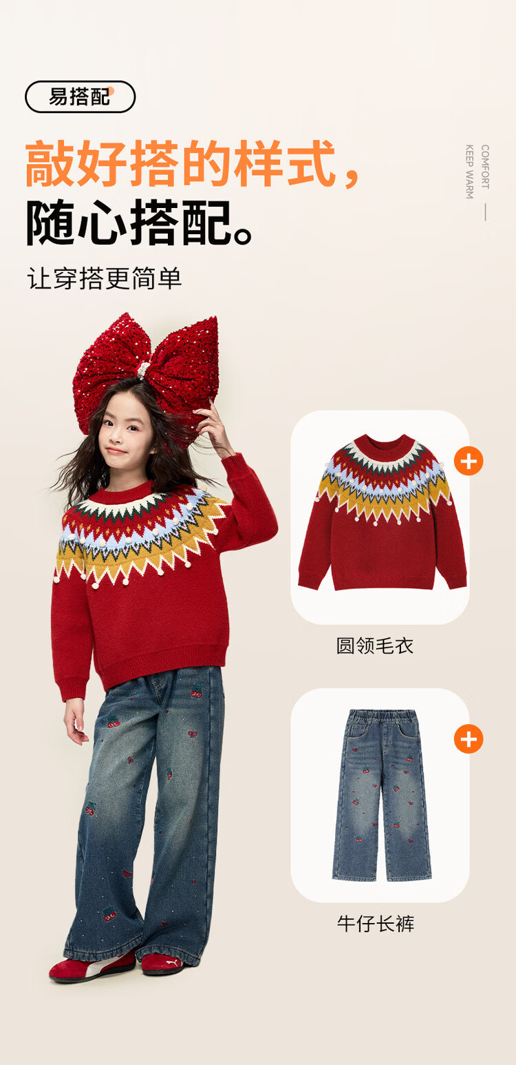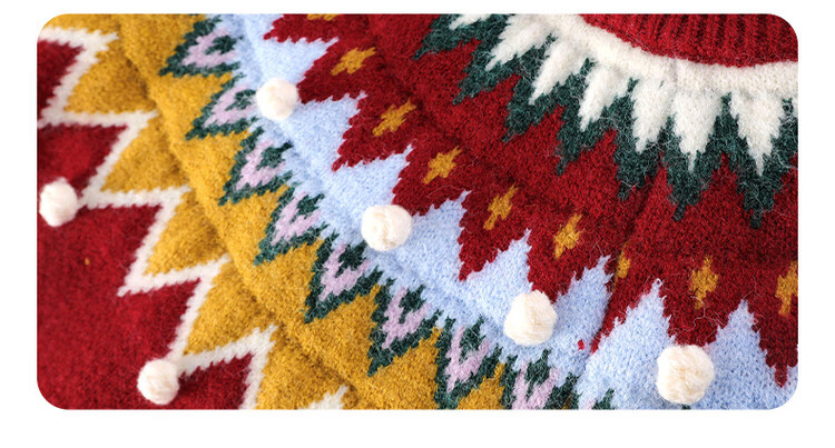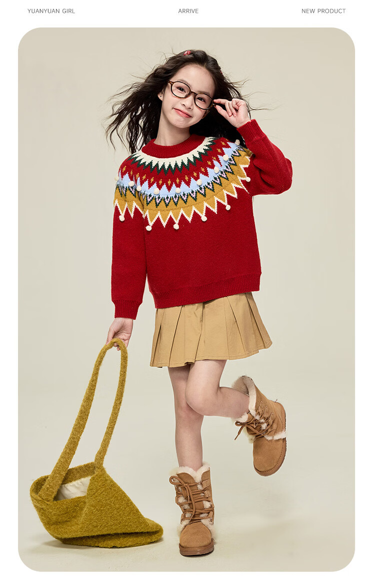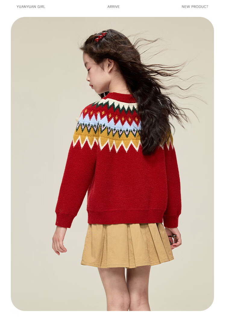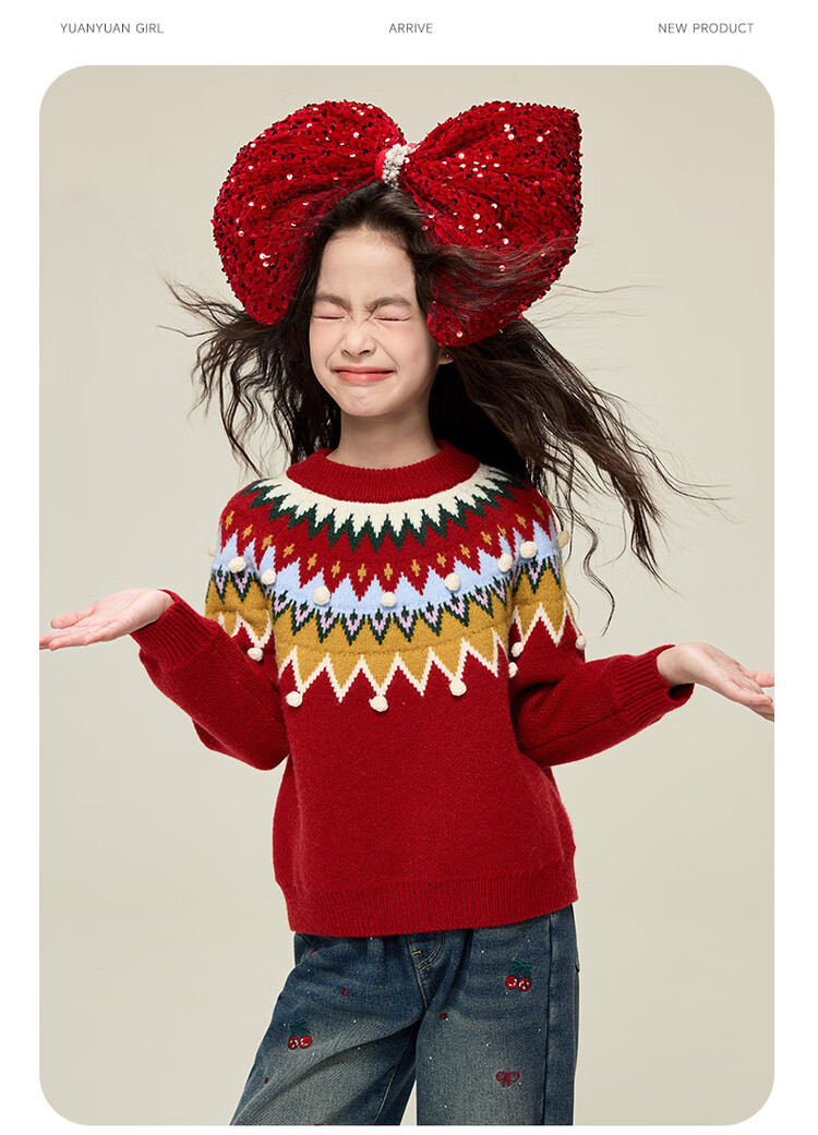 媛媛公主儿童毛衣圣诞氛围提花冬季新款女童保暖加厚套头线衫中大童上衣 红色 110