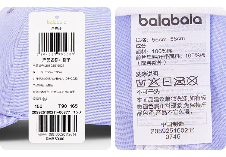 巴拉巴拉儿童棒球帽夏季新款男女童帽子全棉舒适遮阳时尚运动休闲 紫色调00377 110cm(适用头围52-54cm,3-7岁)