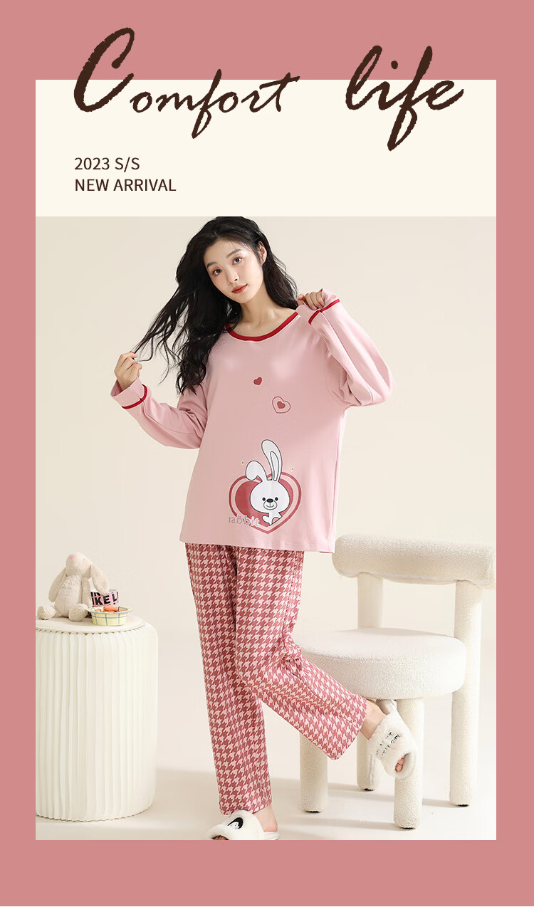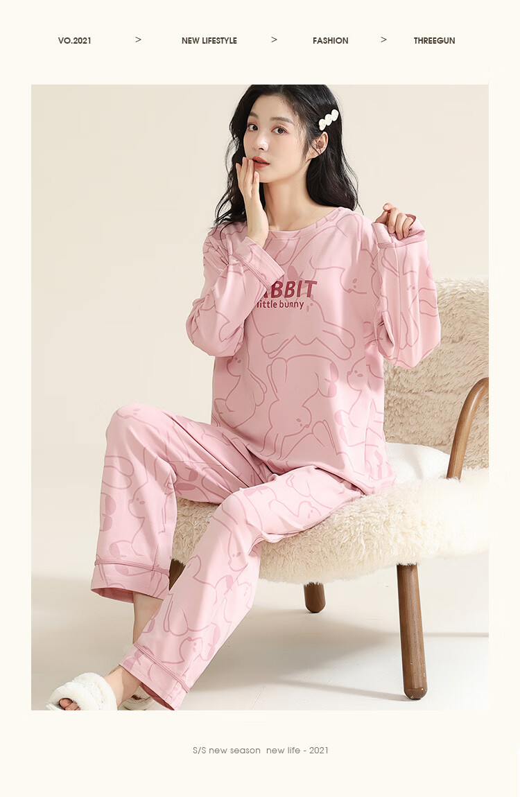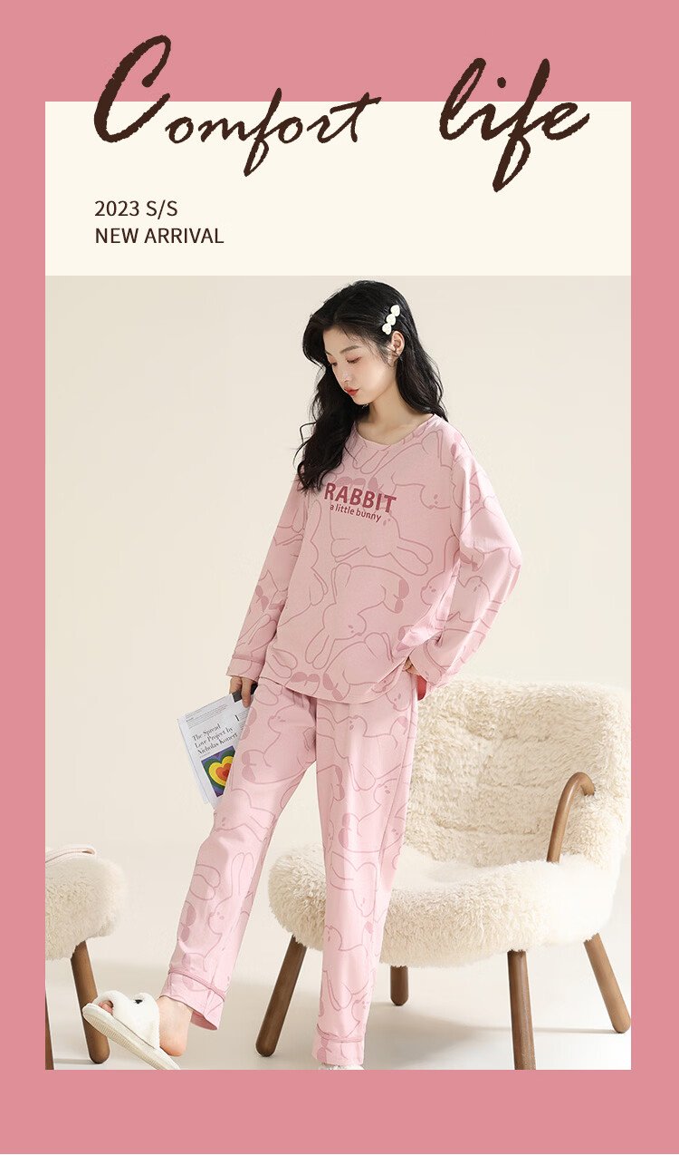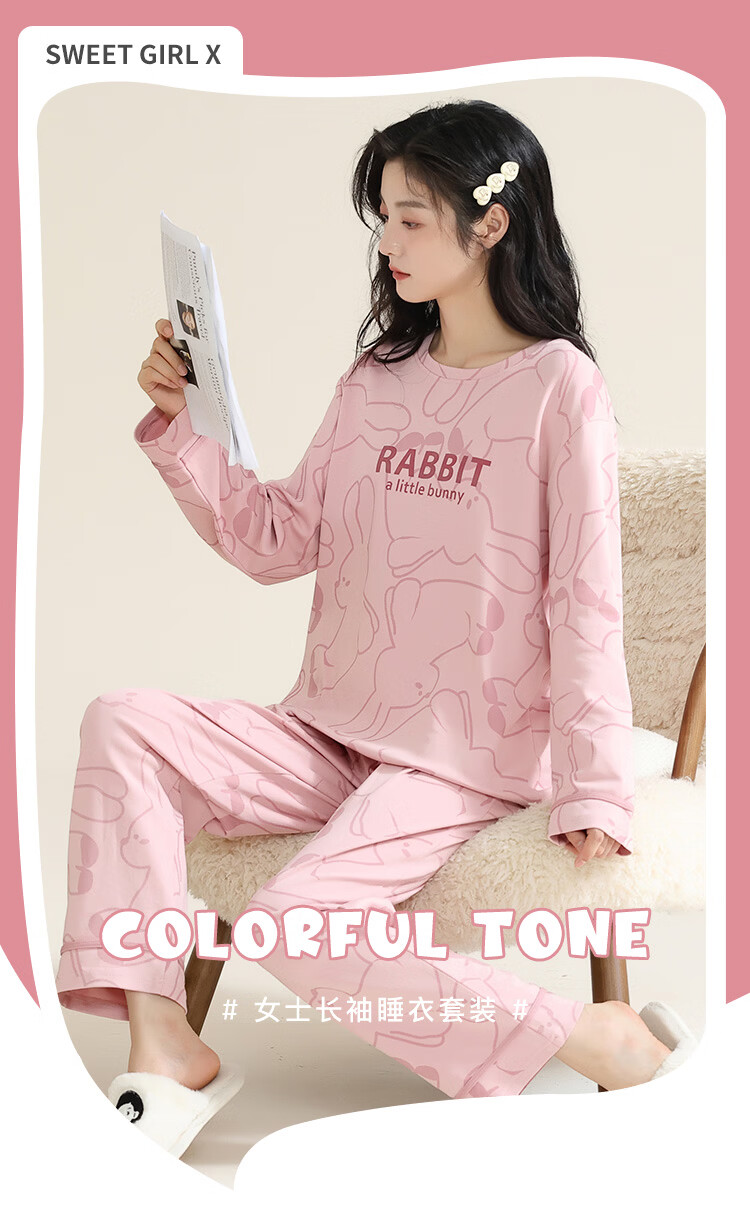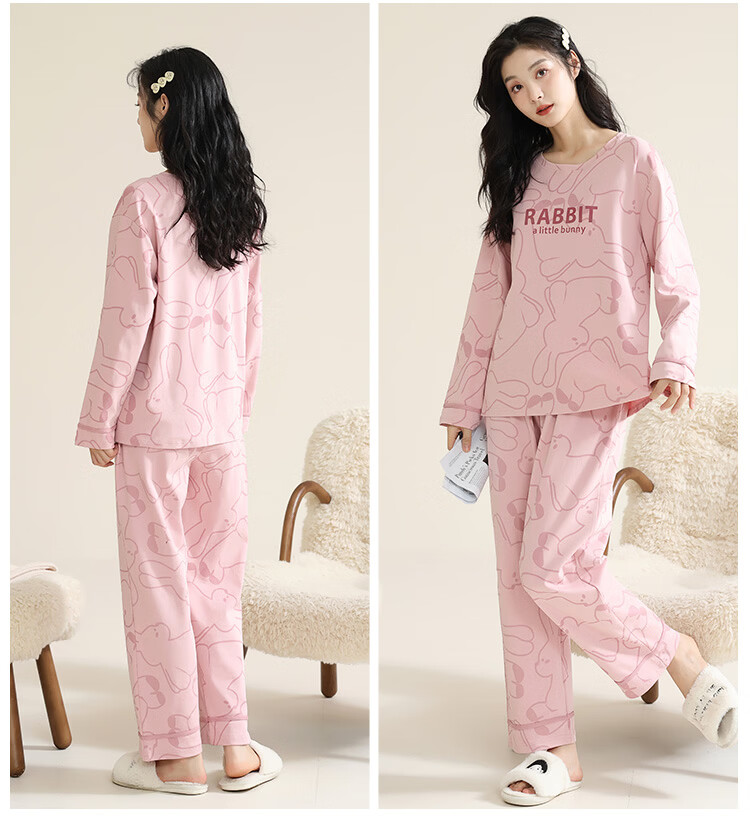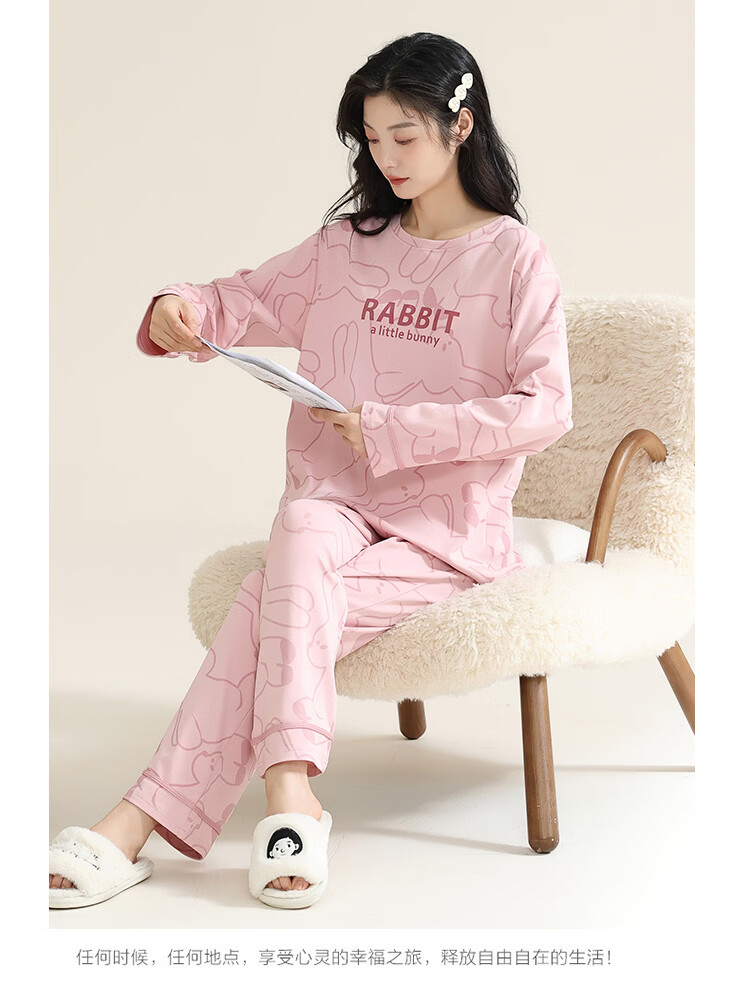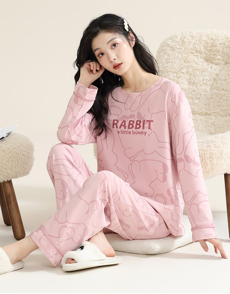 洁丽雅(grace)睡衣女舒适居家春夏季长袖长裤宽松可外穿女士家居服套装 圆领小兔 L 【建议100-120斤】