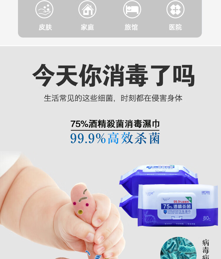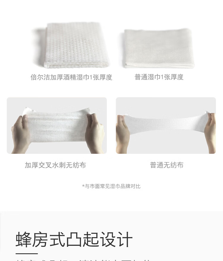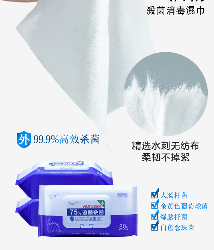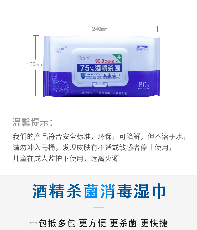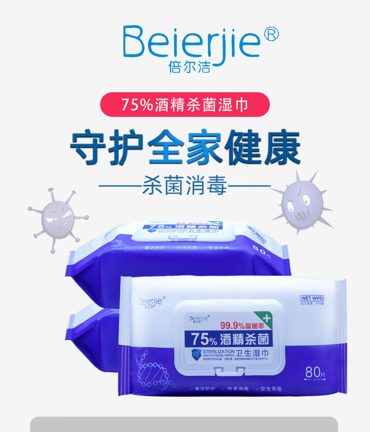 倍尔洁(Beierjie)75%酒精卫生湿巾 带盖抽取式家用 家庭装 消毒湿巾纸 大包装 8包480抽