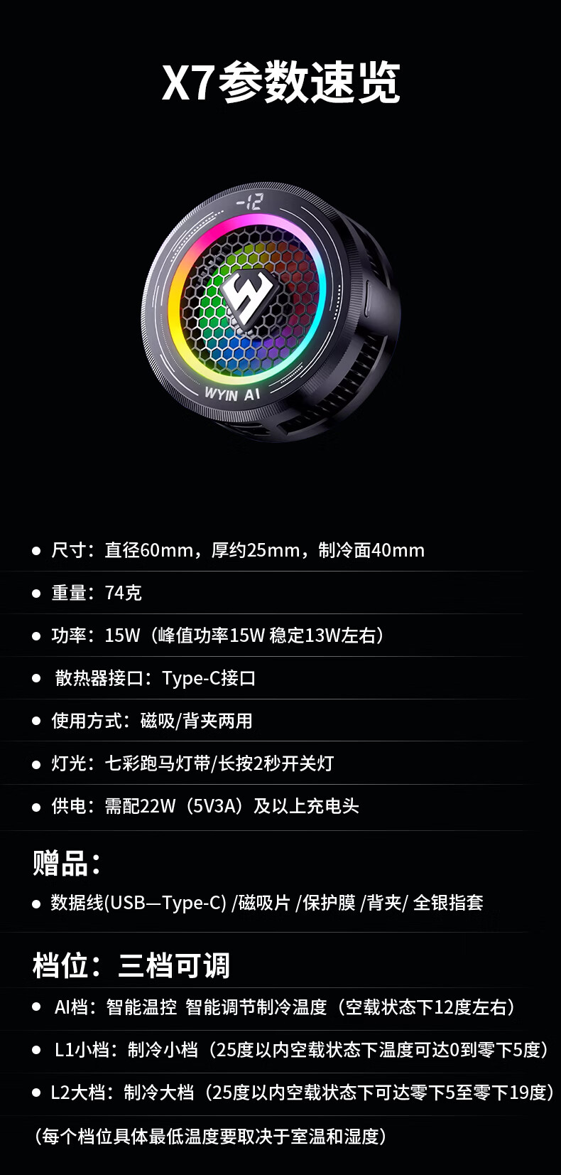 武影子X7新款智能AI温控散热器手机平板专用散热器可结冰可温控 武影子X7「白色」(全银指套+背夹+磁吸片)