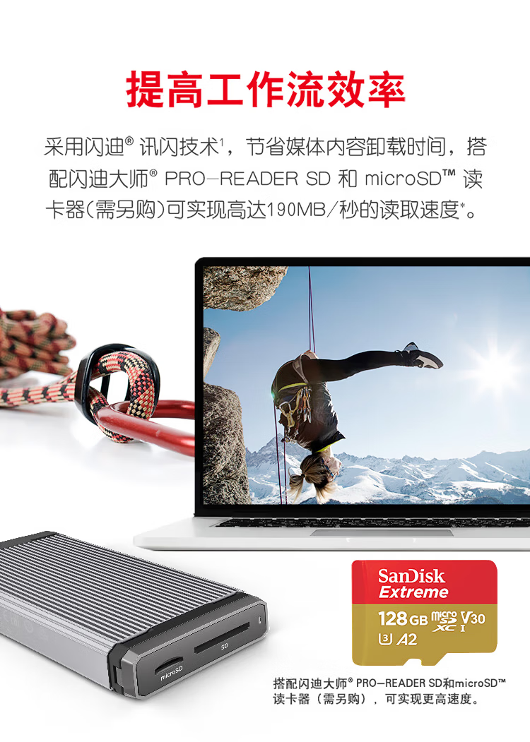 闪迪(SanDisk)高速存储卡Pocket3闪迪A2 U3 V30内存卡TF(MicroSD)卡64G/128G/256G/512G无人机运动相机监控卡 金卡256G 读速高达190MB/s 运动相机专配