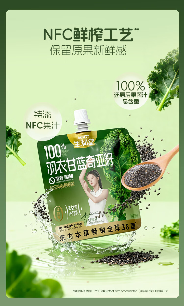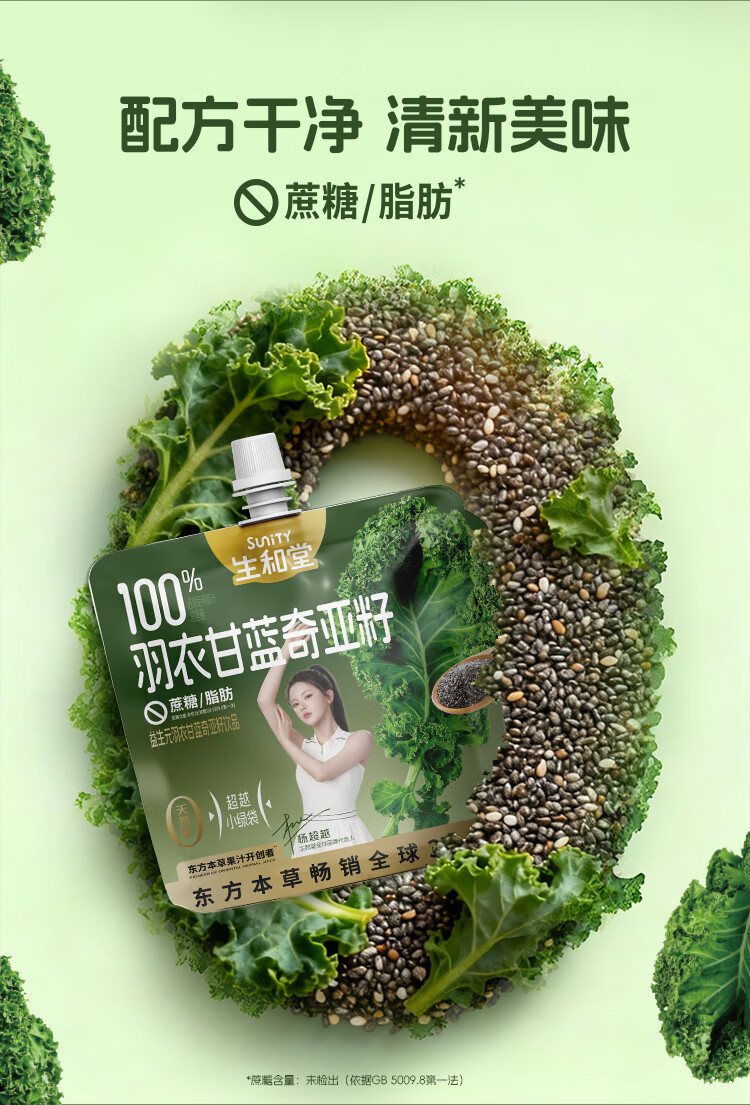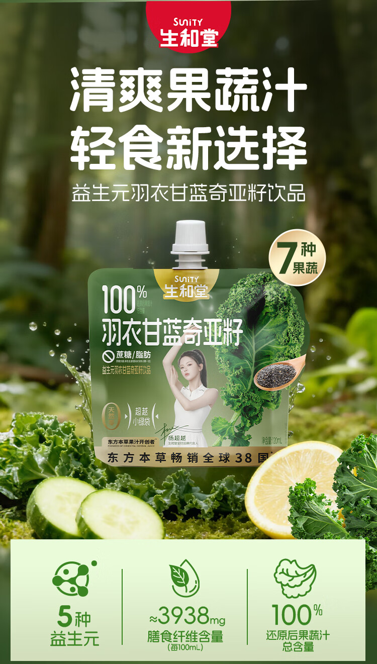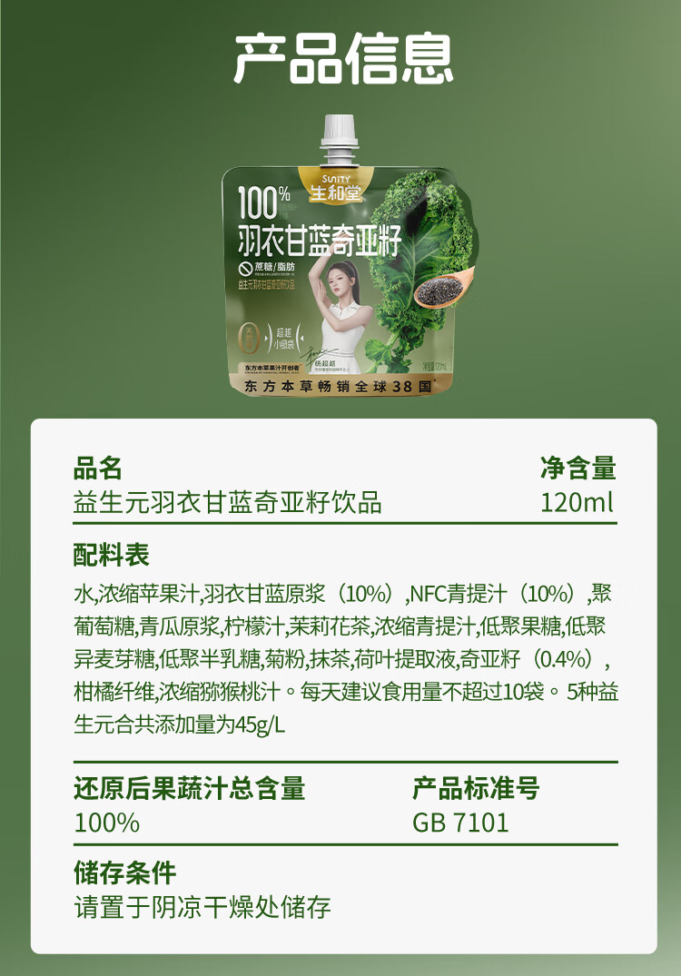 生和堂杨超越同款益生元羽衣甘蓝奇亚籽饮品120ml 7种果蔬含膳食纤维 10袋羽衣甘蓝饮品