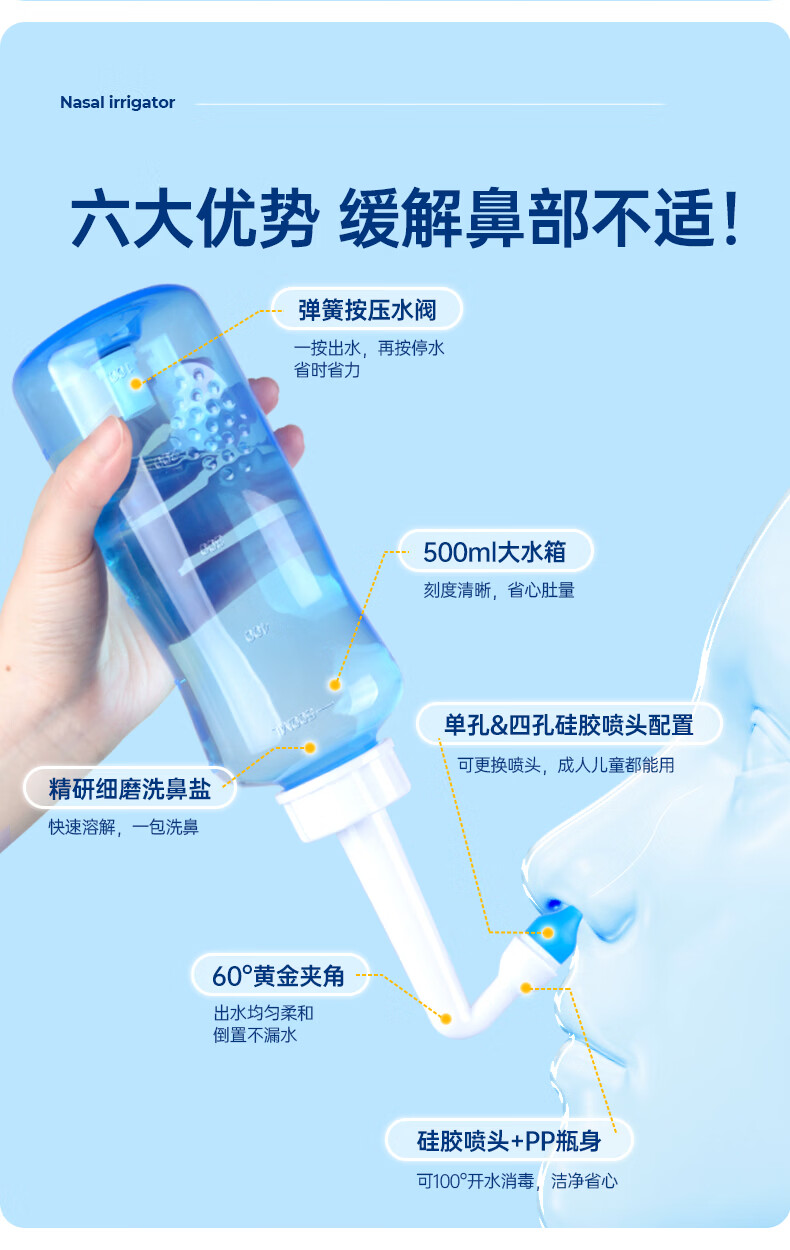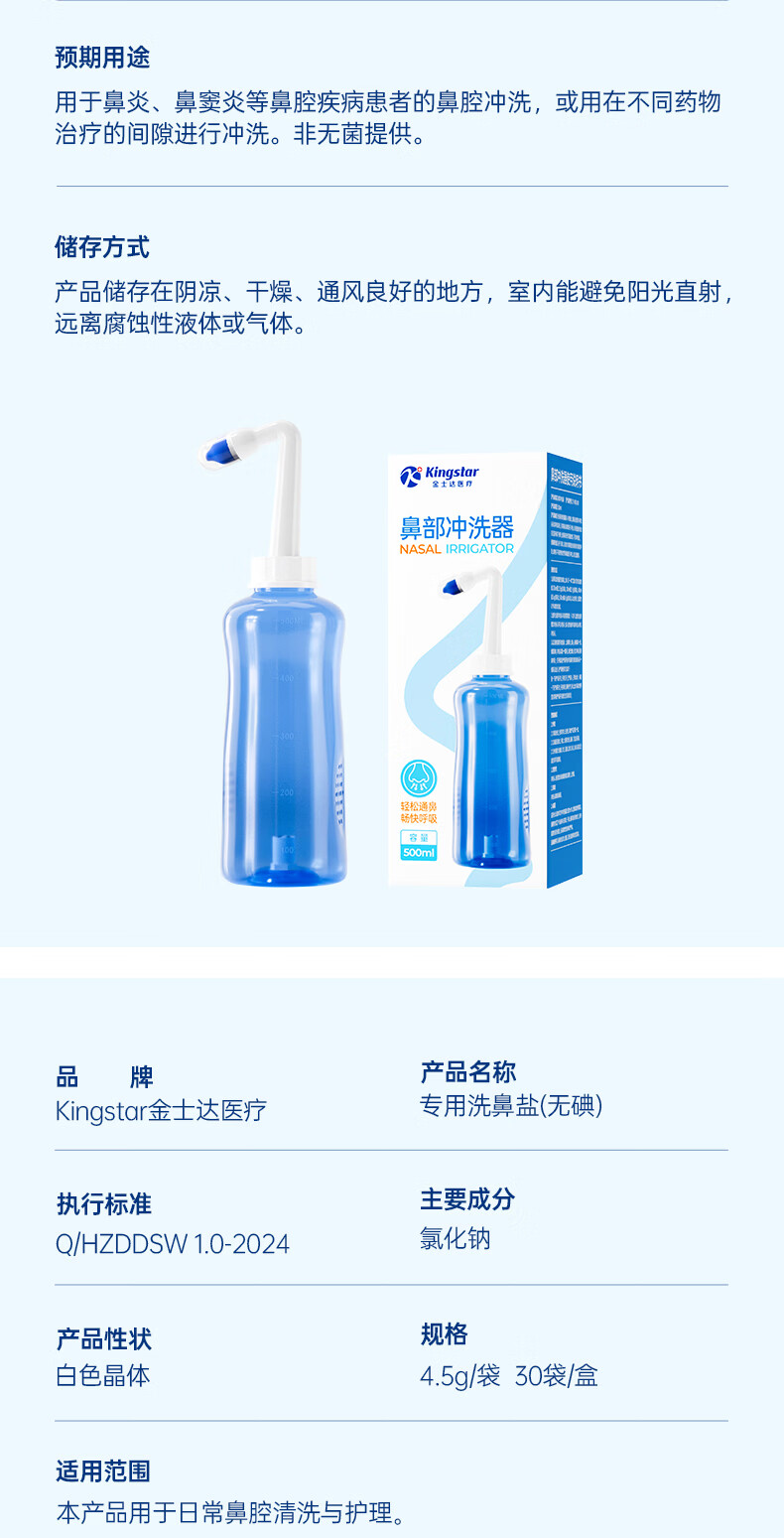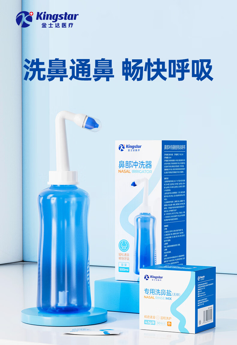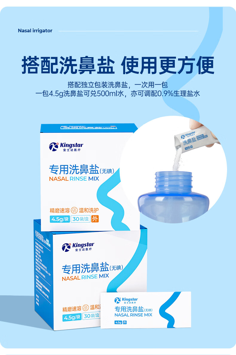 金士达tk洗鼻器家用成人儿童鼻腔清洗器 鼻炎鼻窦炎鼻部生理盐水冲洗器 鼻腔清洗器500ml套装+洗鼻盐4.5g*30袋