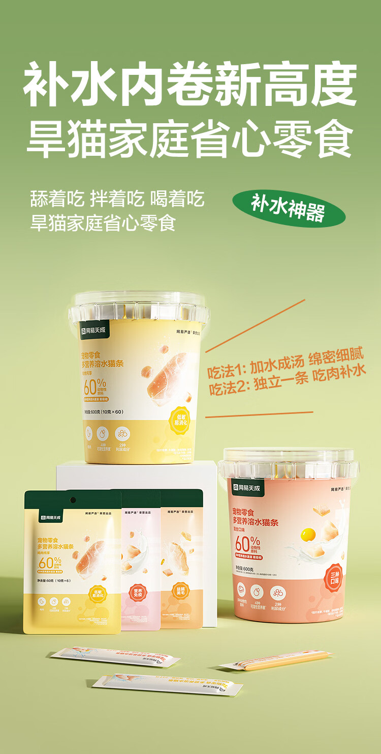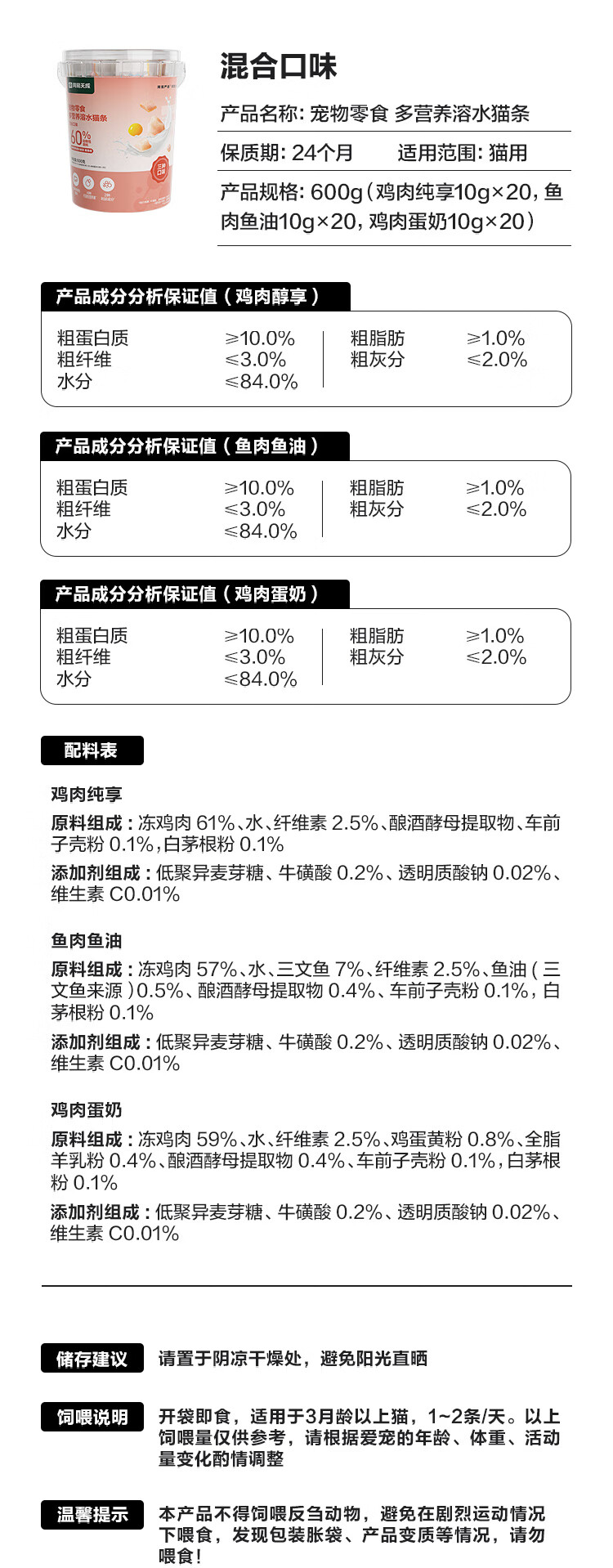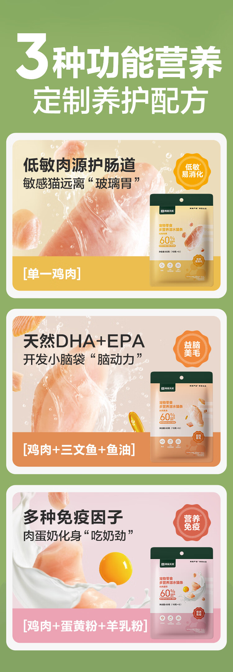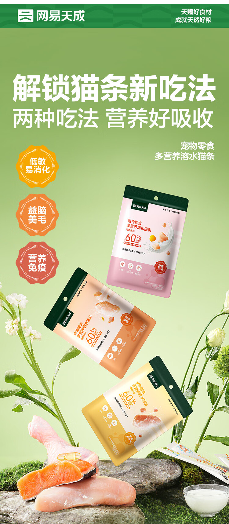 网易严选多营养速溶猫条 宠物零食营养增肥 成幼猫通用美毛猫条低敏易消化 三味混合 10g*60袋
