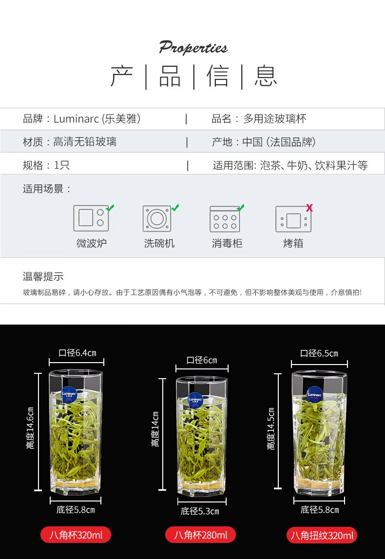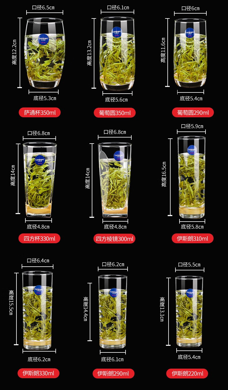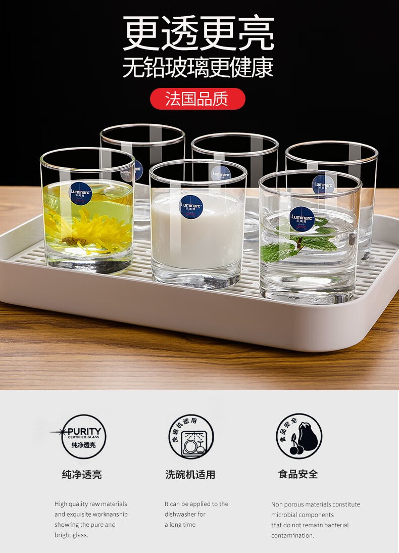 乐美雅无铅耐热玻璃杯四方喝水杯子家用牛奶果汁杯茶杯洋酒啤酒杯6只装 6只装/圆形矮杯150ML