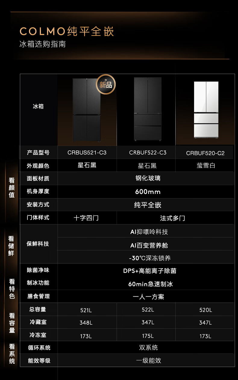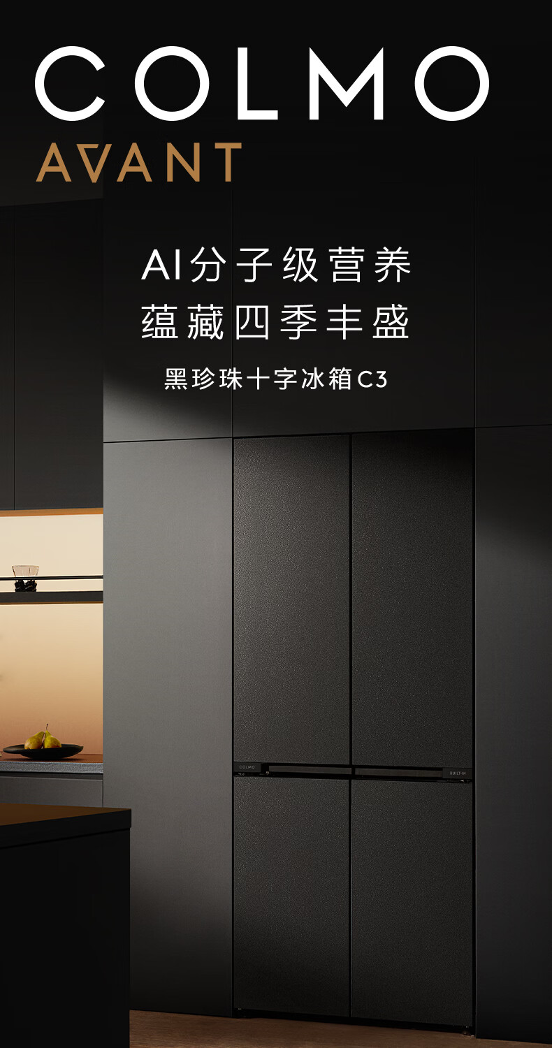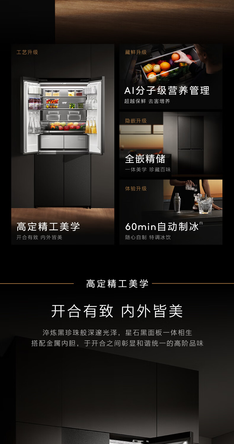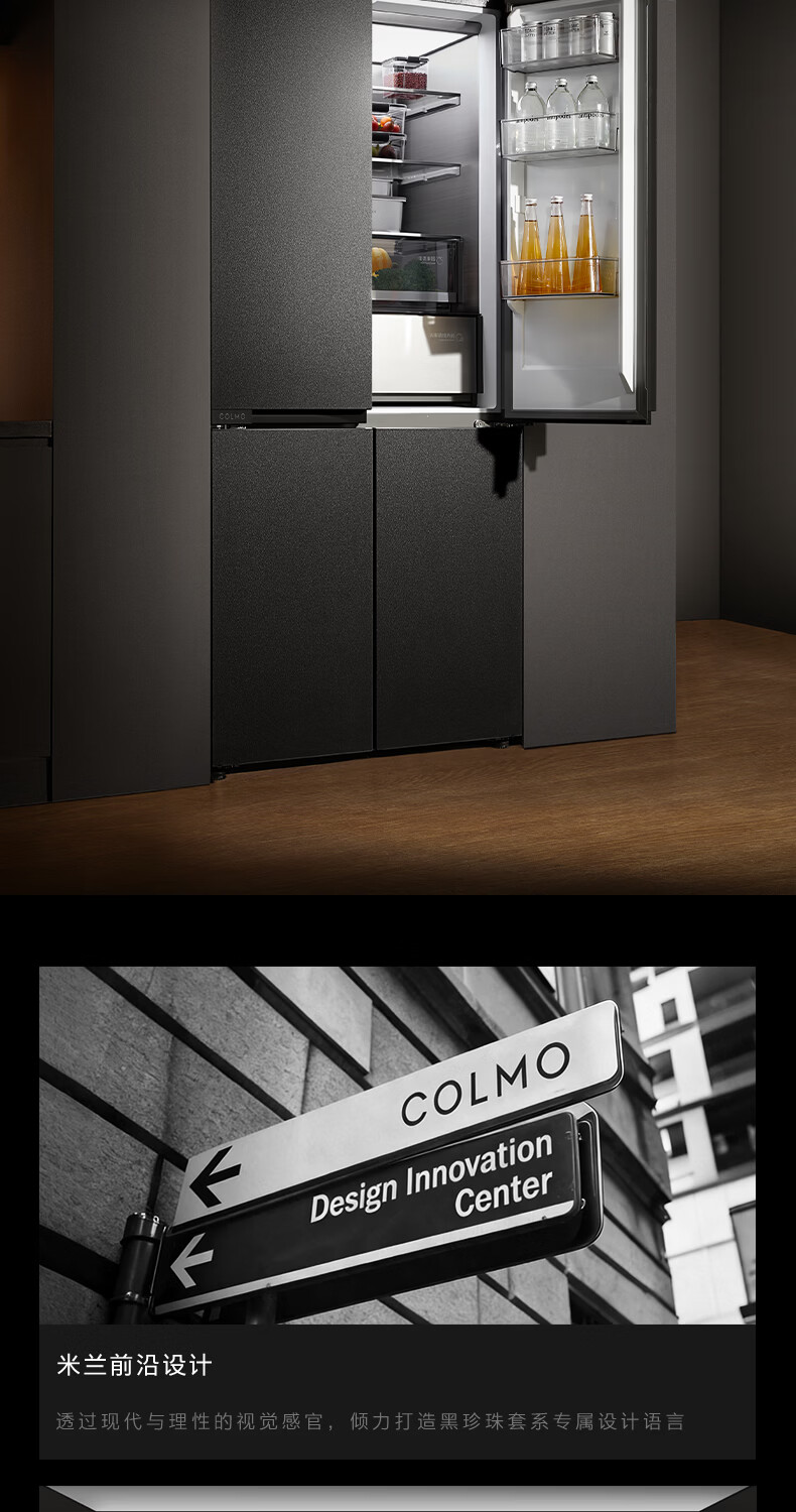 COLMO黑珍珠521L十字门冰箱自动制冰纯平全嵌一级能效双系统风冷无霜以旧换新星石黑CRBUS521-C3